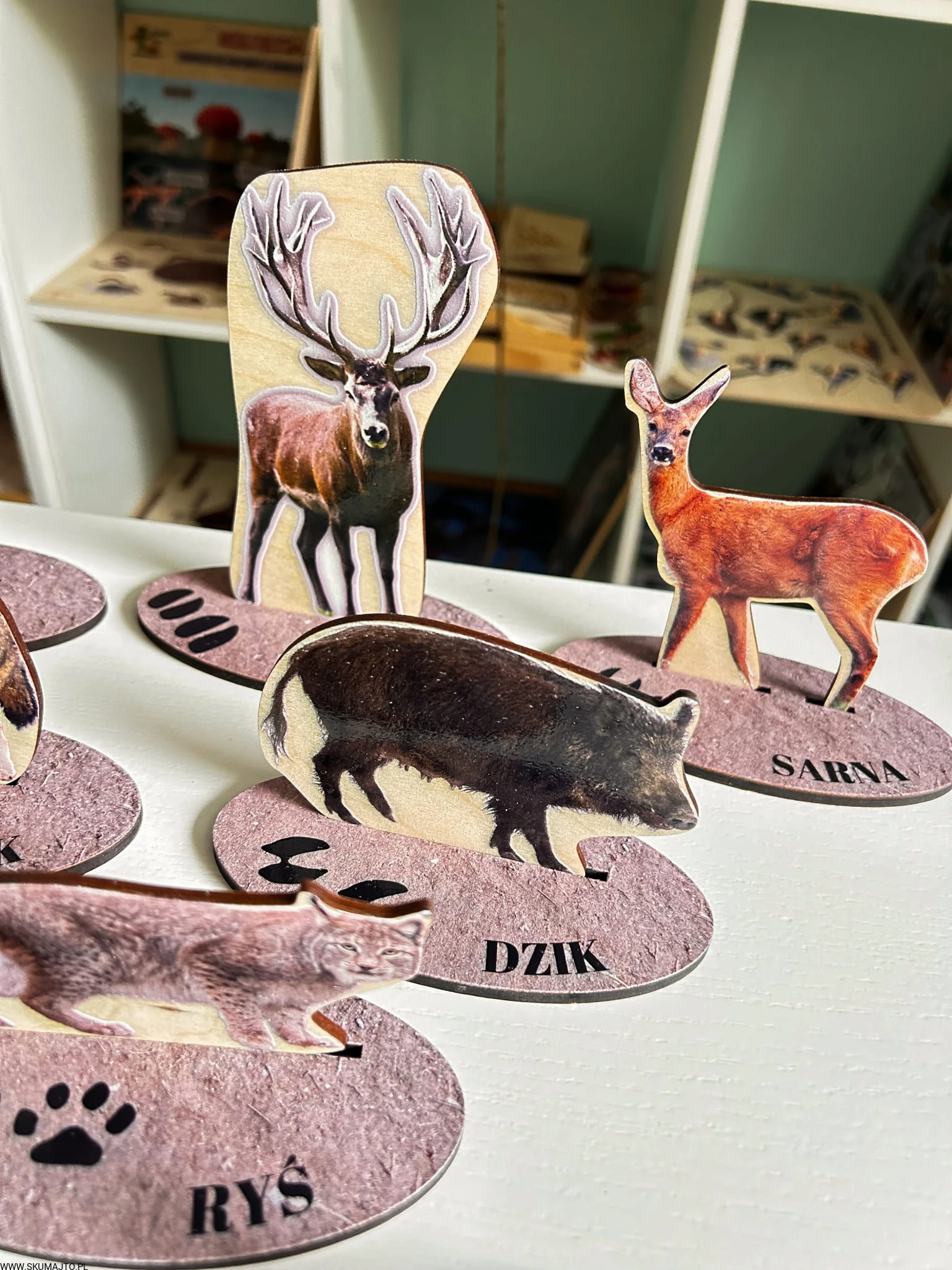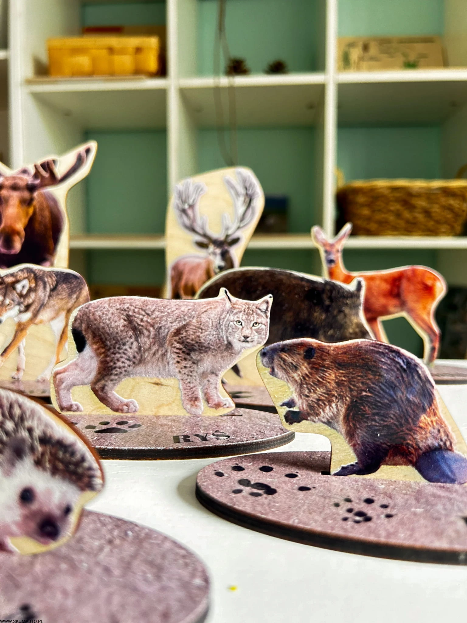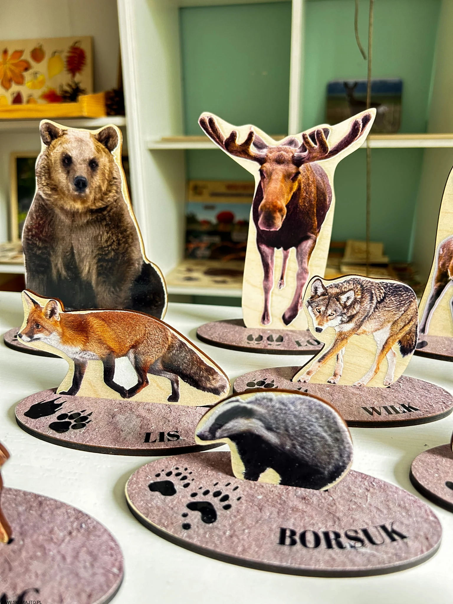 - 13 drewnianych podstawek (o długości 10 cm), na których znajdują się realistyczne tropy i podpisy zwierząt.