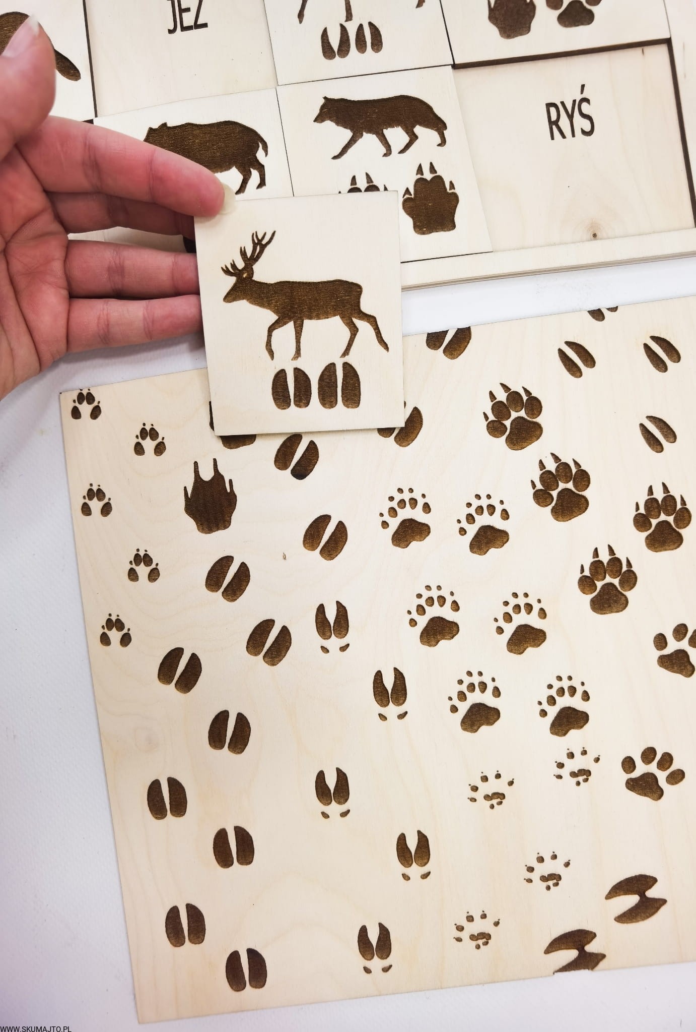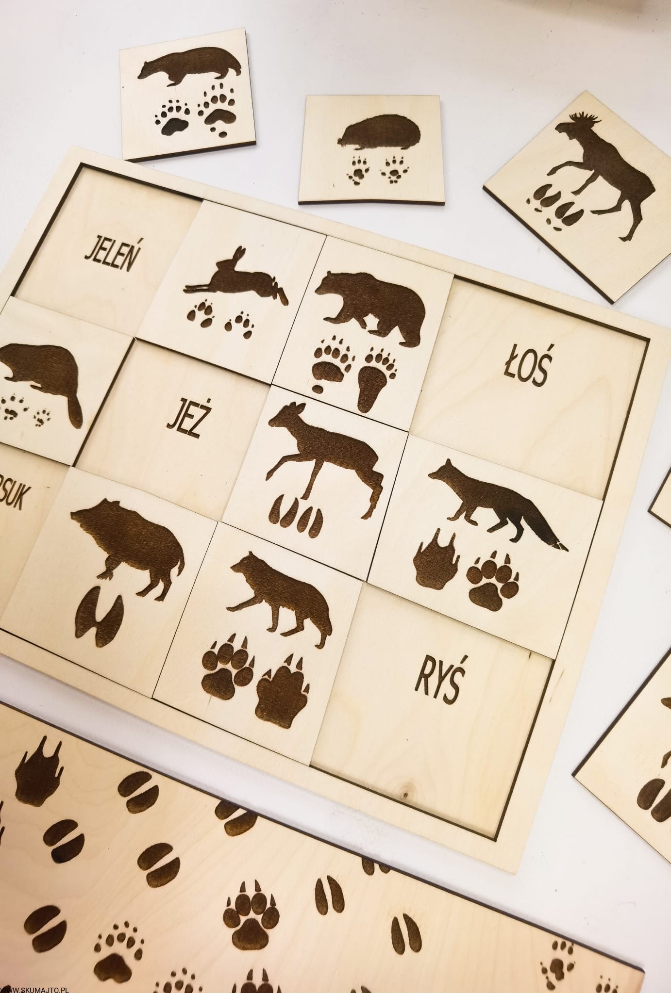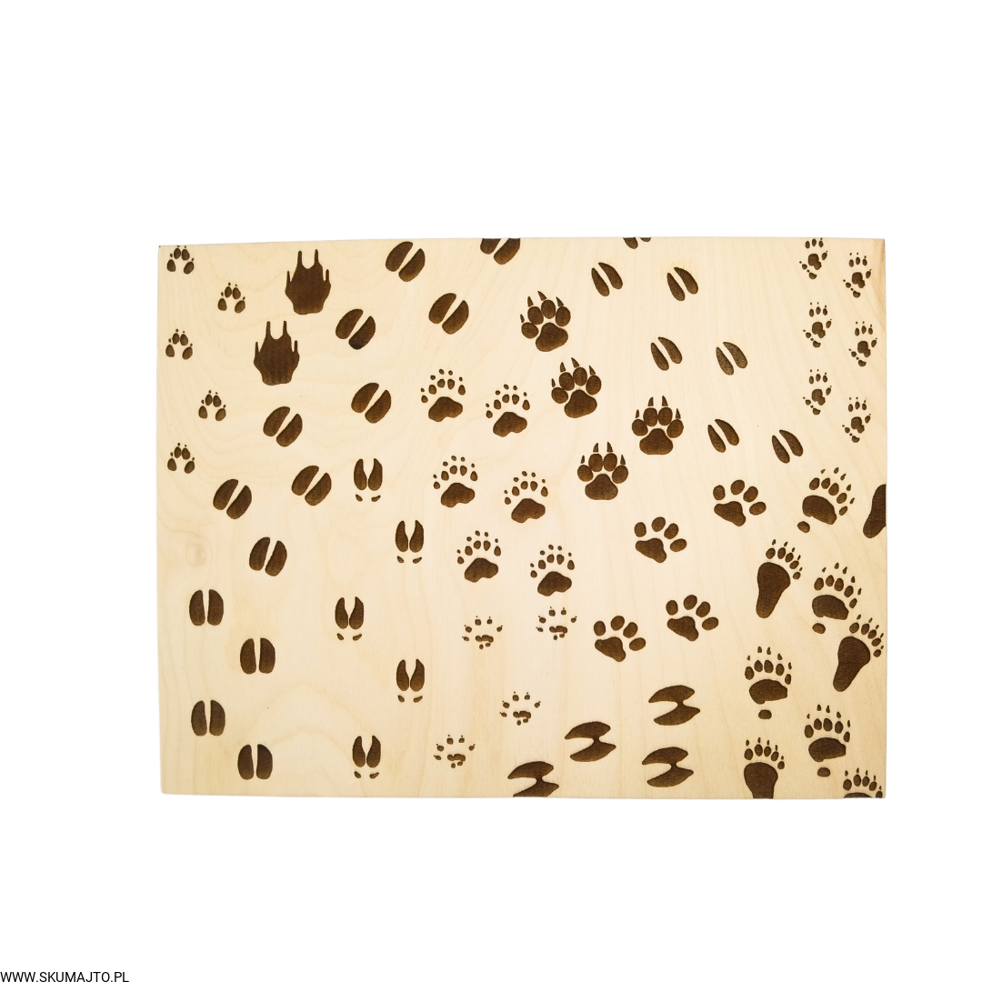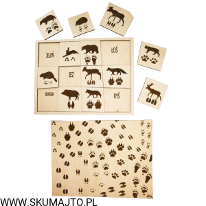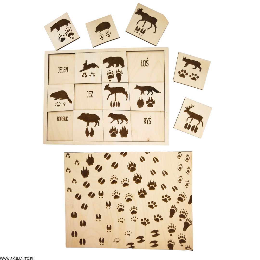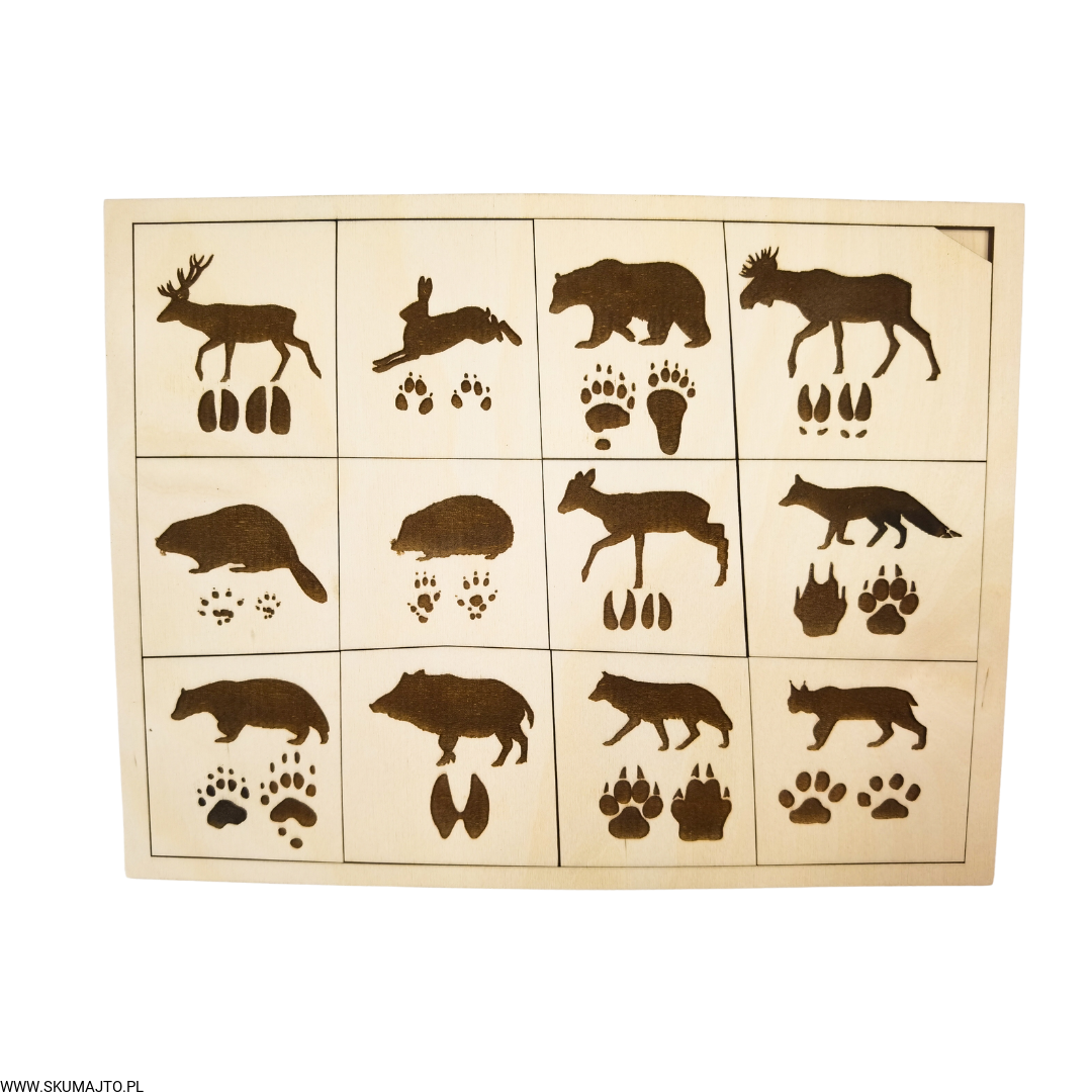 Tropy zwierząt, drewniana układanka, ślady zwierząt leśnych
