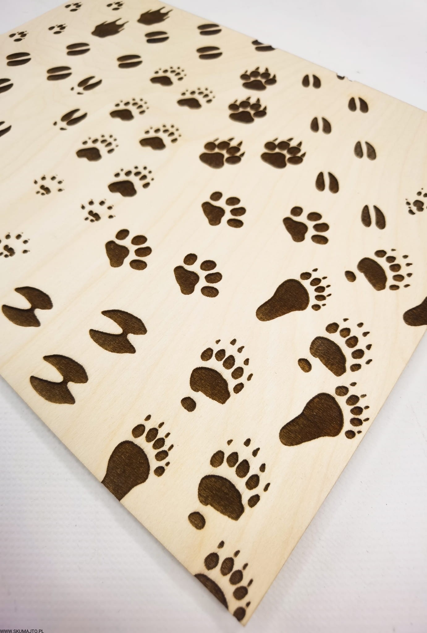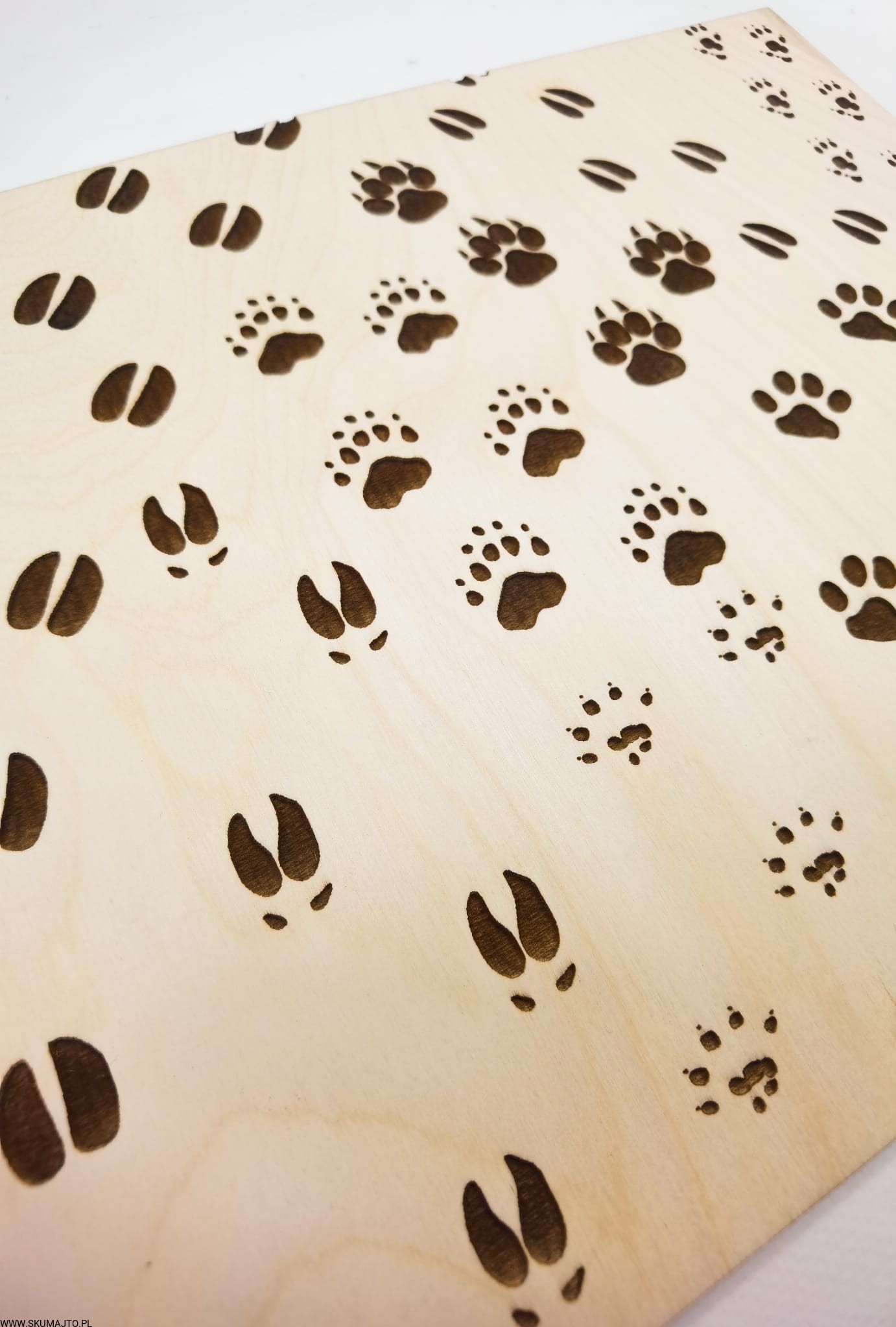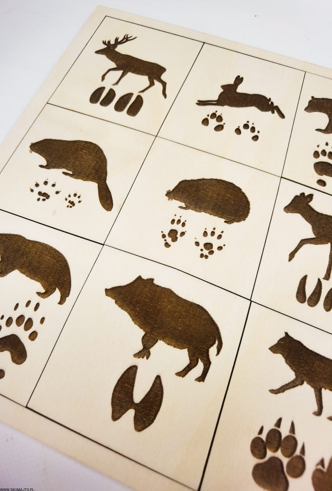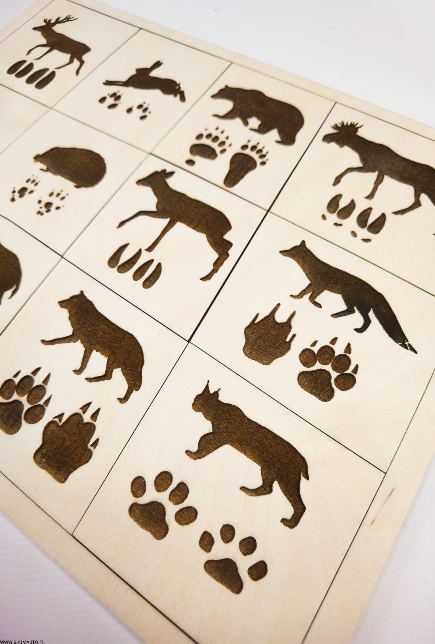 Tropy zwierząt, drewniana układanka, ślady zwierząt leśnych
