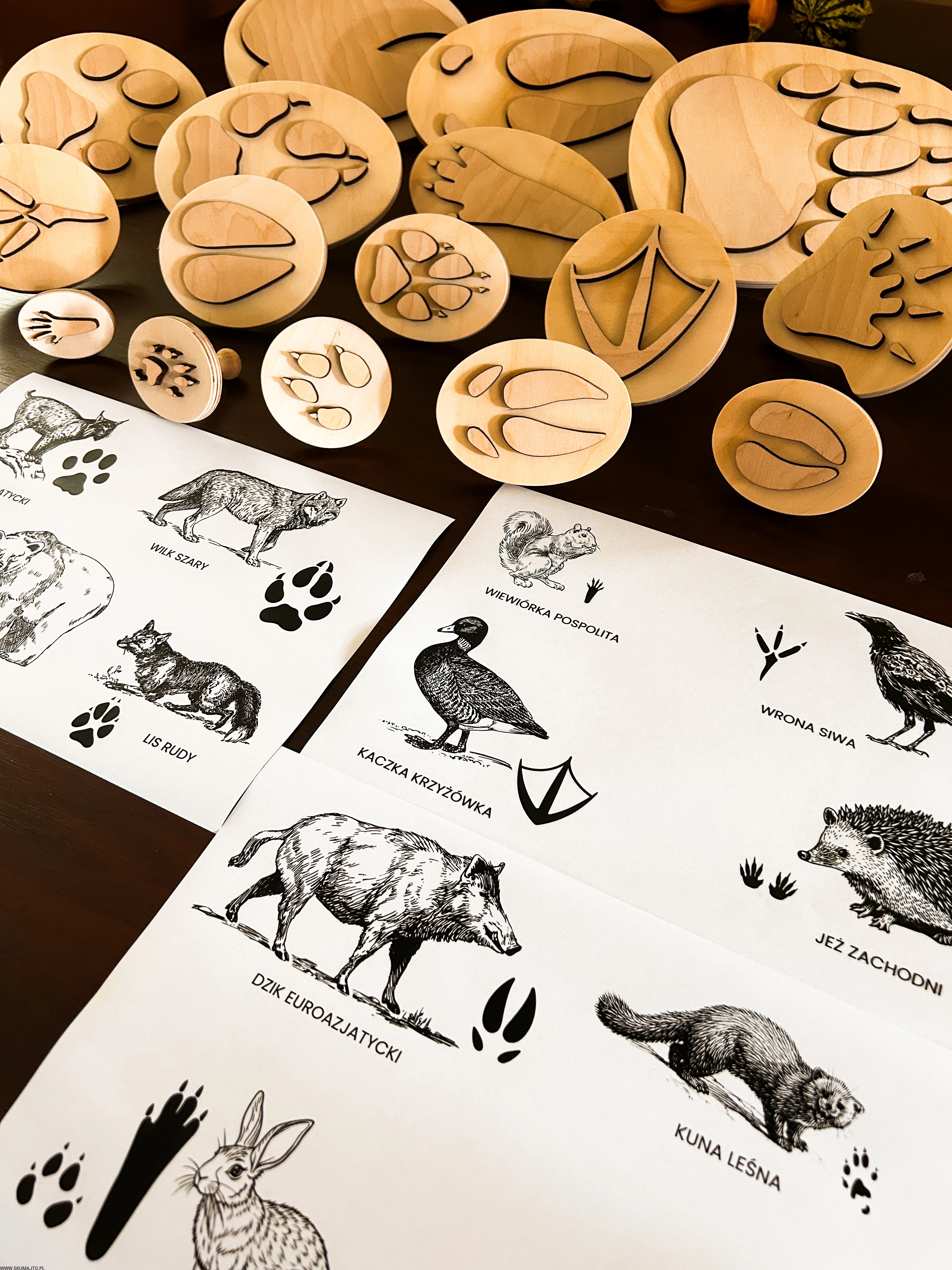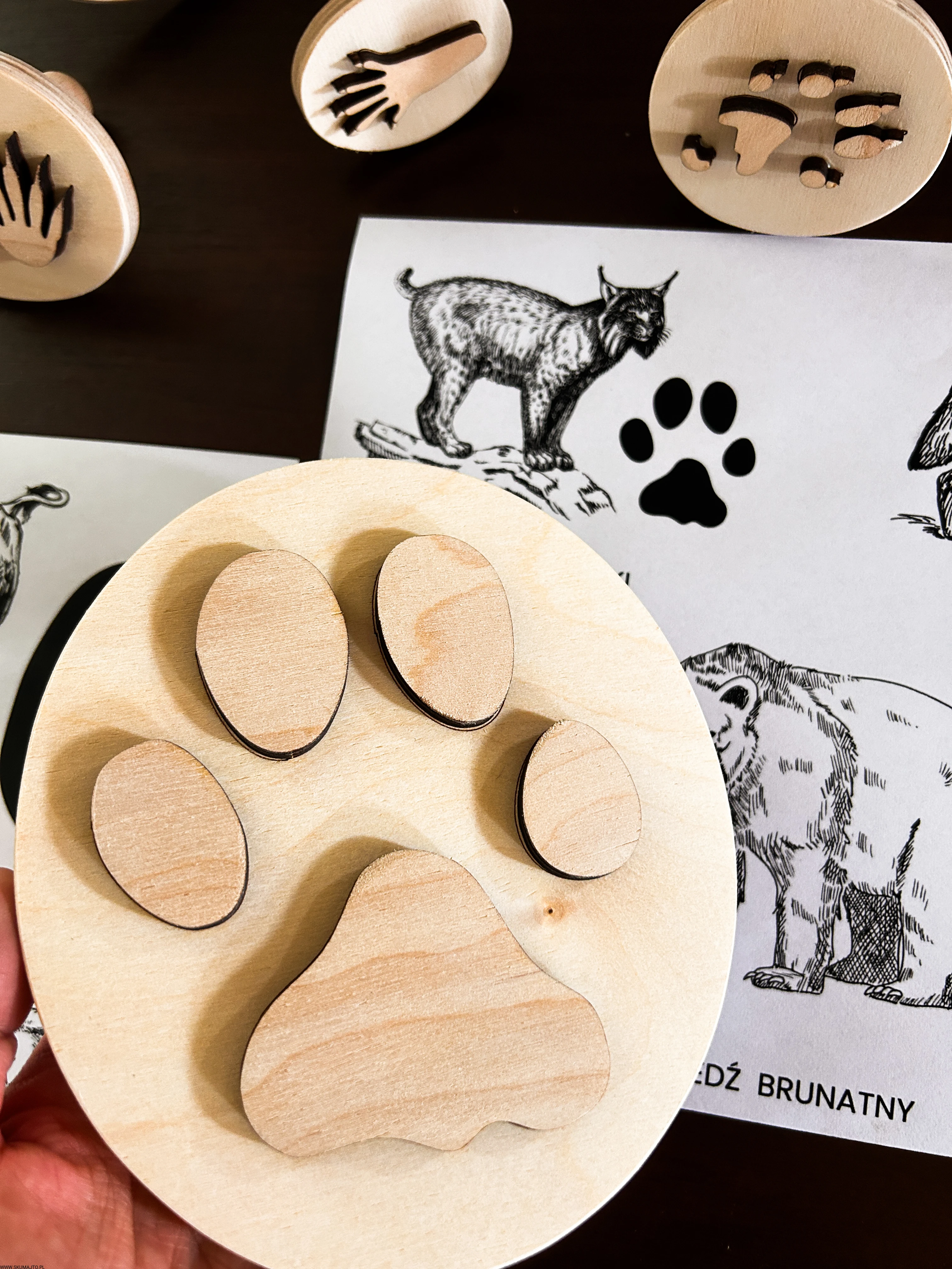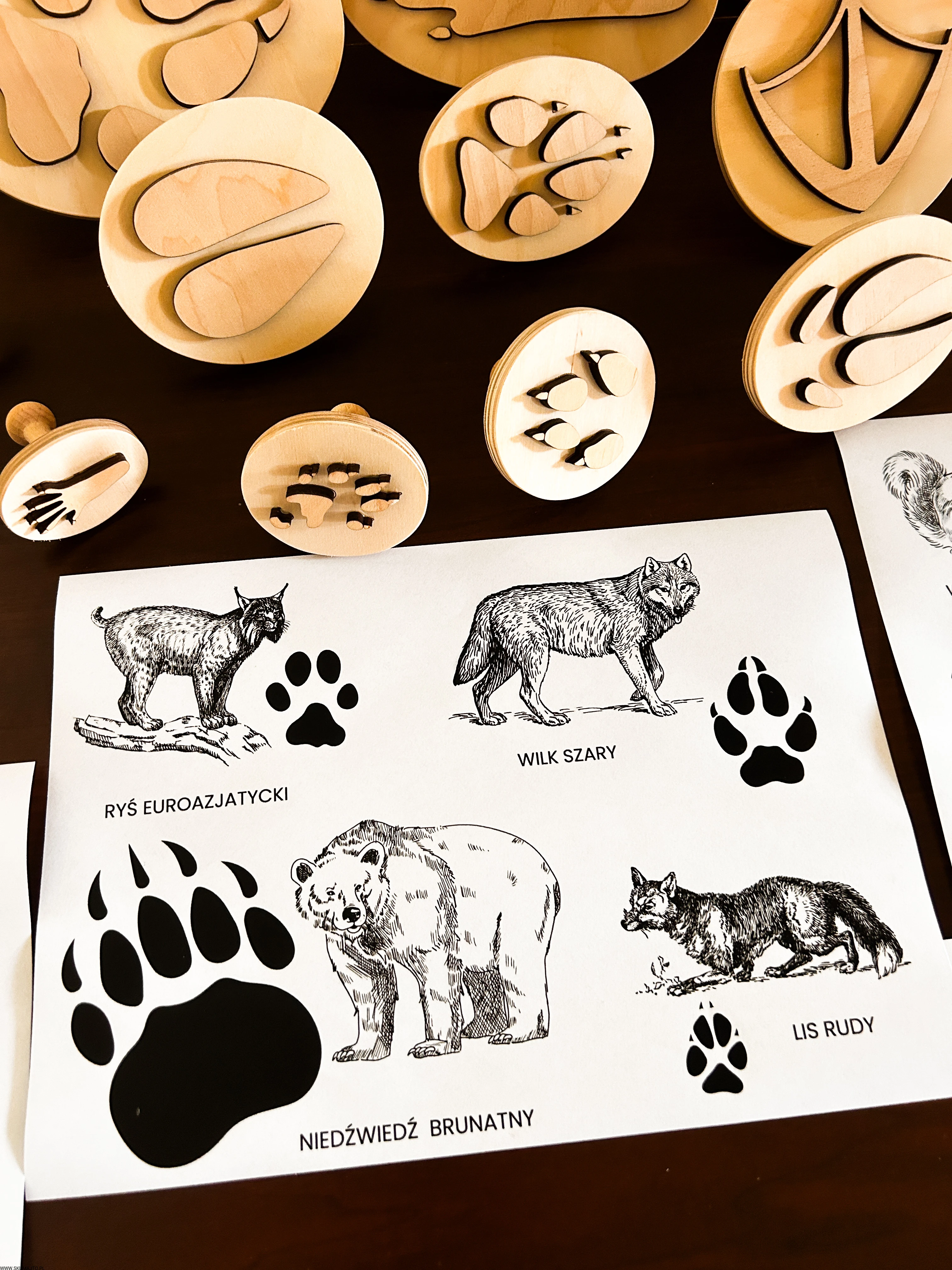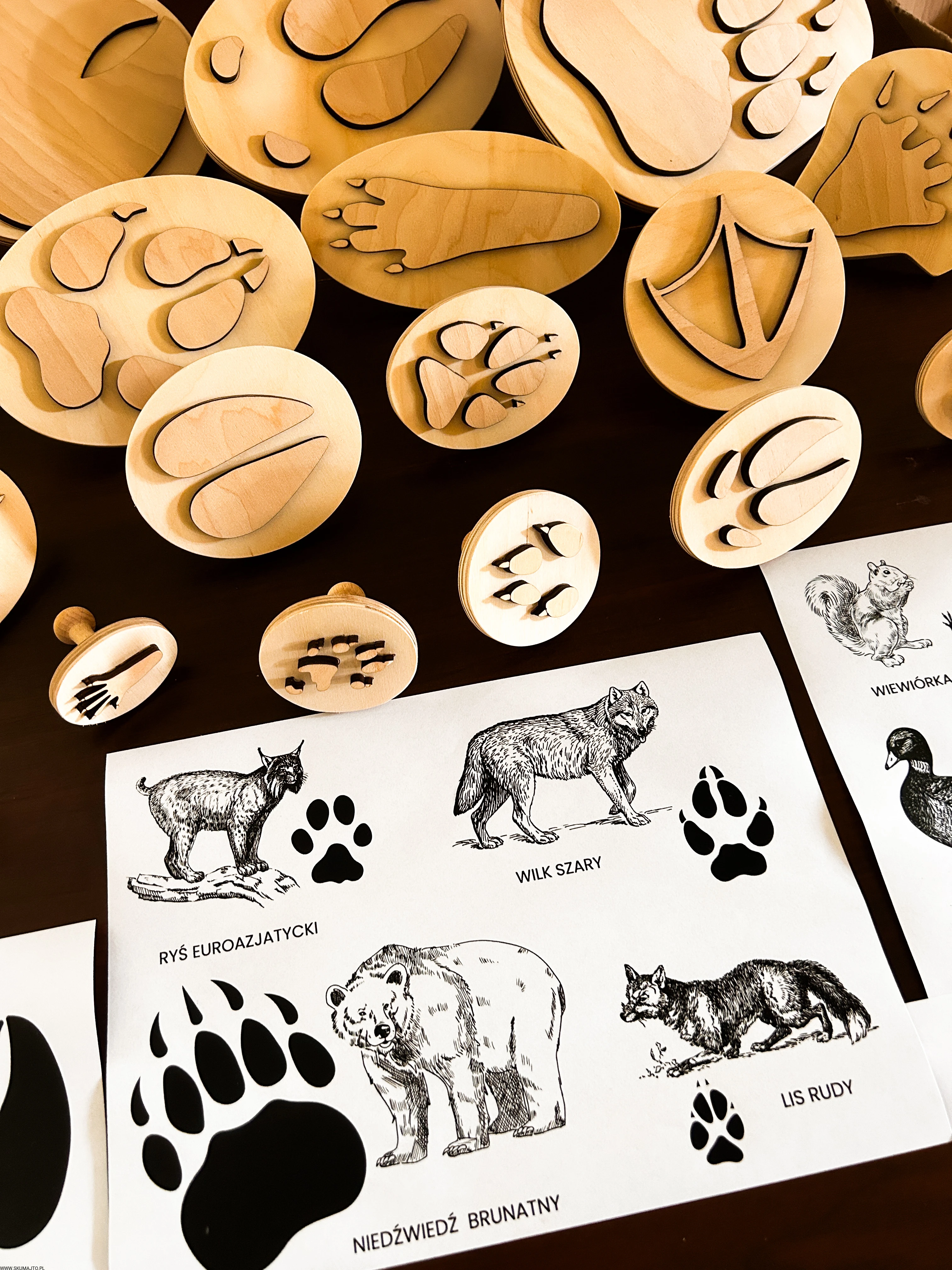 pieczątki tropy zwierząt, tropy zwierząt dla dzieci, realistyczne tropy edukacyjne, edukacja przyrodnicza pieczątki, pomoc sensoryczna tropy, ślady zwierząt leśnych, tropy do odbijania w piasku, edukacja przez zabawę, nauka o zwierzętach dla dzieci, drewniane pomoce Montessori