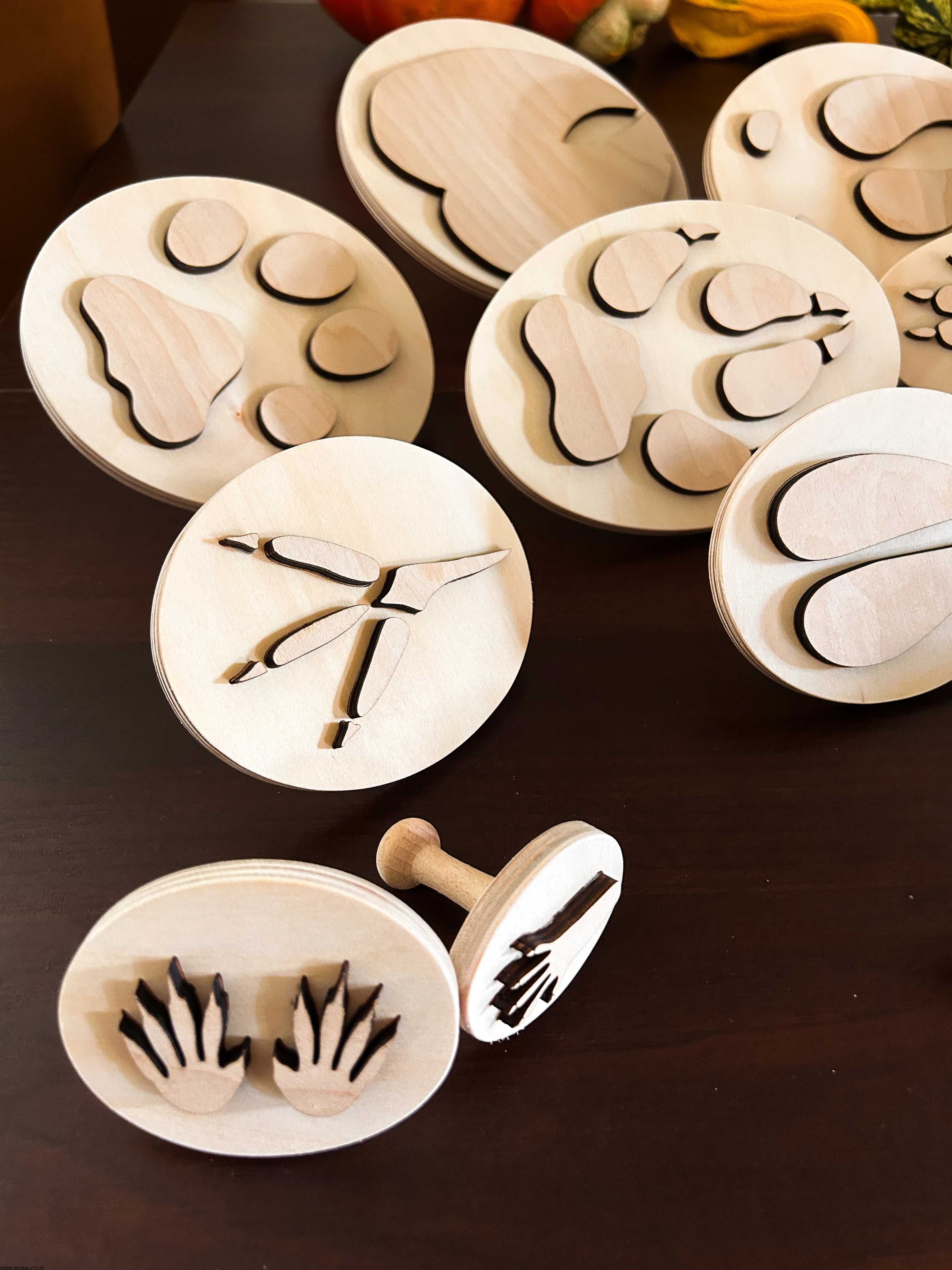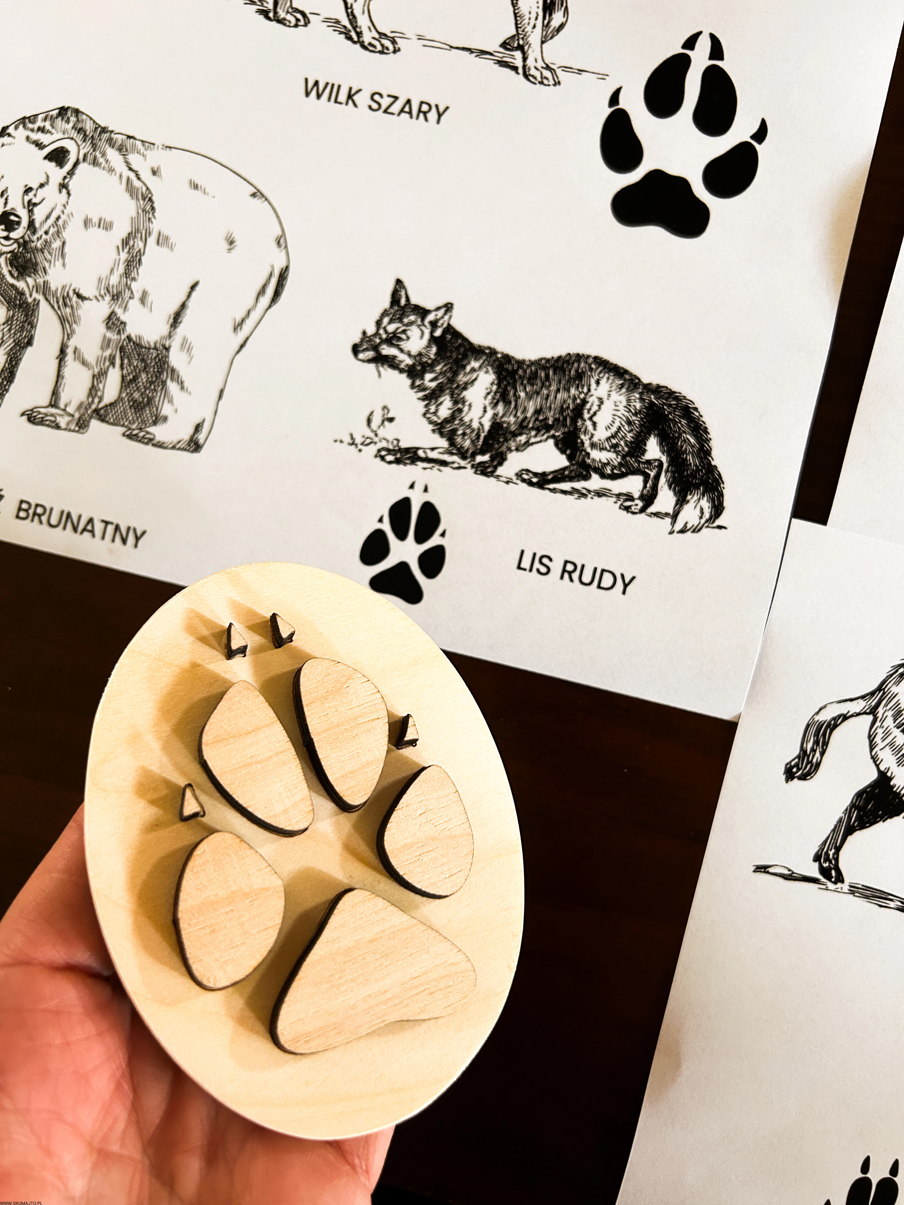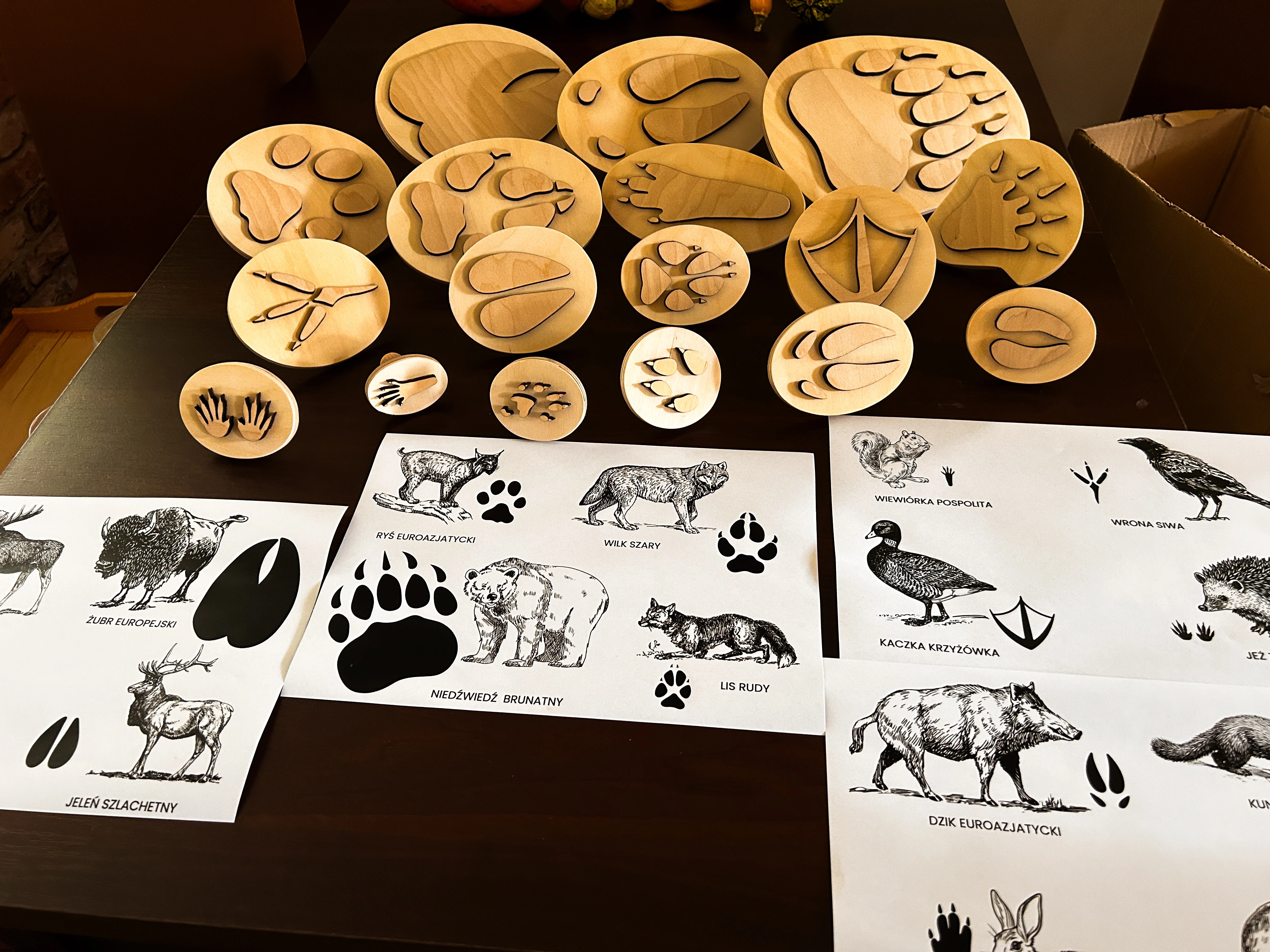 pieczątki tropy zwierząt, tropy zwierząt dla dzieci, realistyczne tropy edukacyjne, edukacja przyrodnicza pieczątki, pomoc sensoryczna tropy, ślady zwierząt leśnych, tropy do odbijania w piasku, edukacja przez zabawę, nauka o zwierzętach dla dzieci, drewniane pomoce Montessori