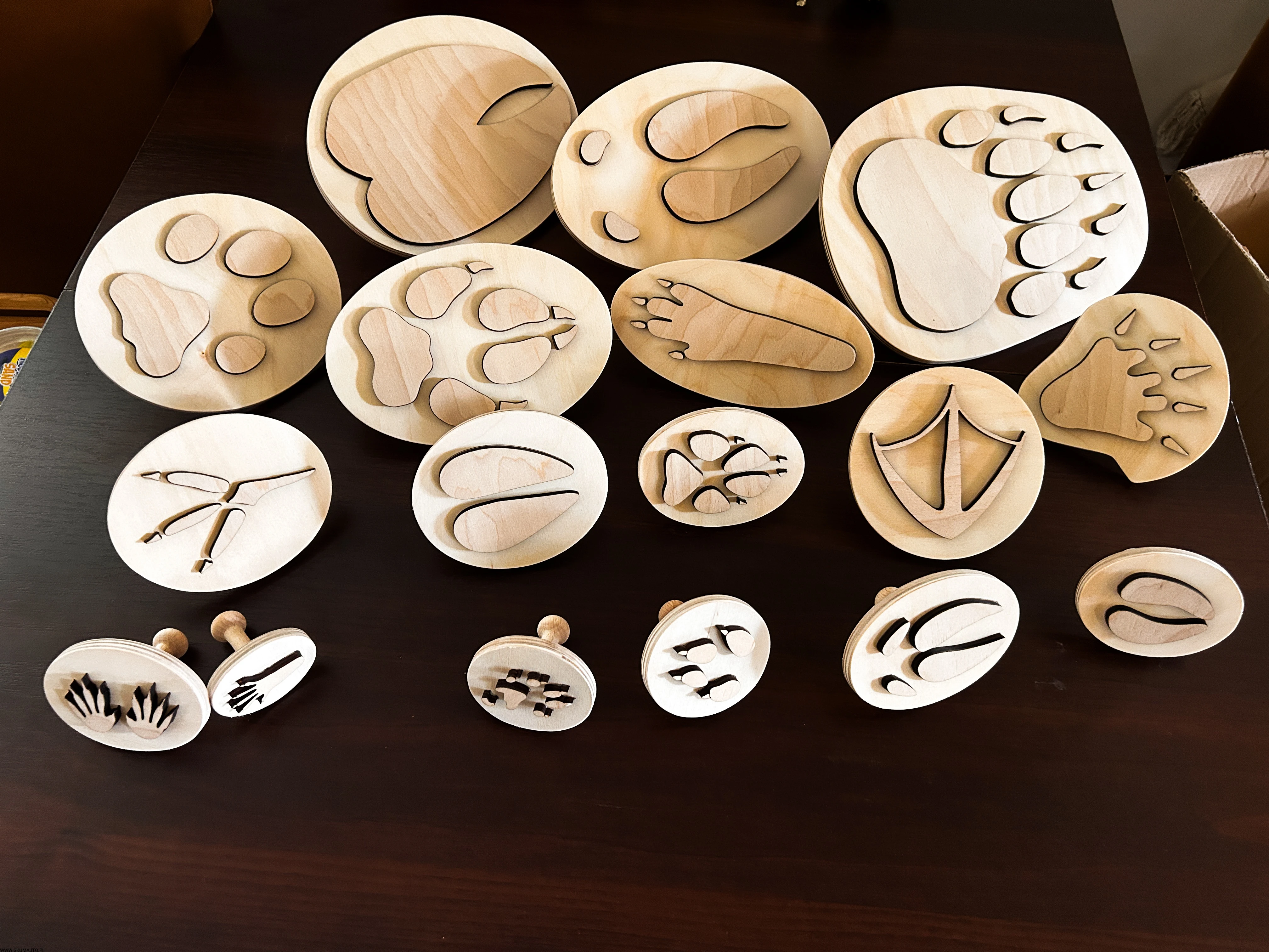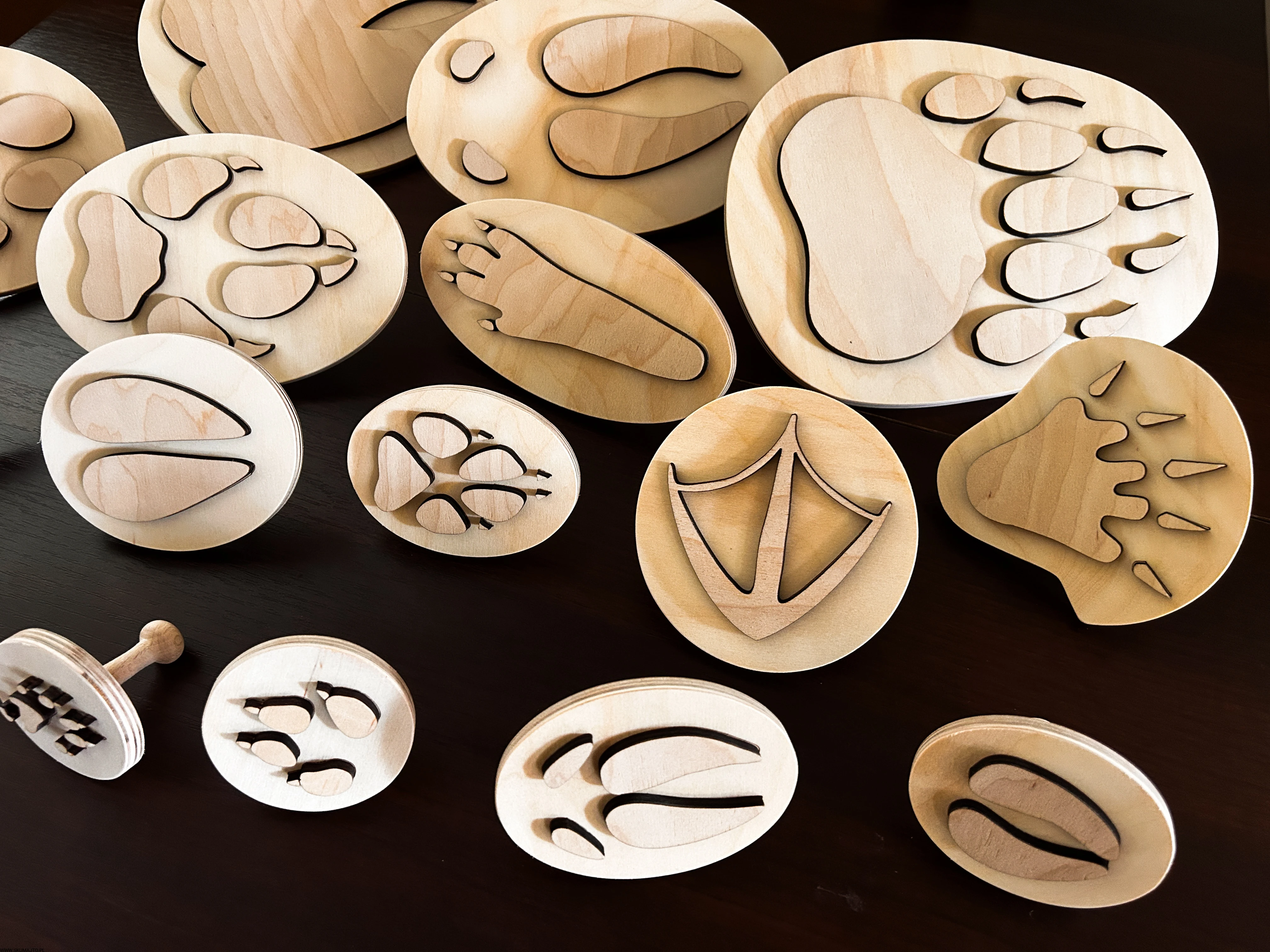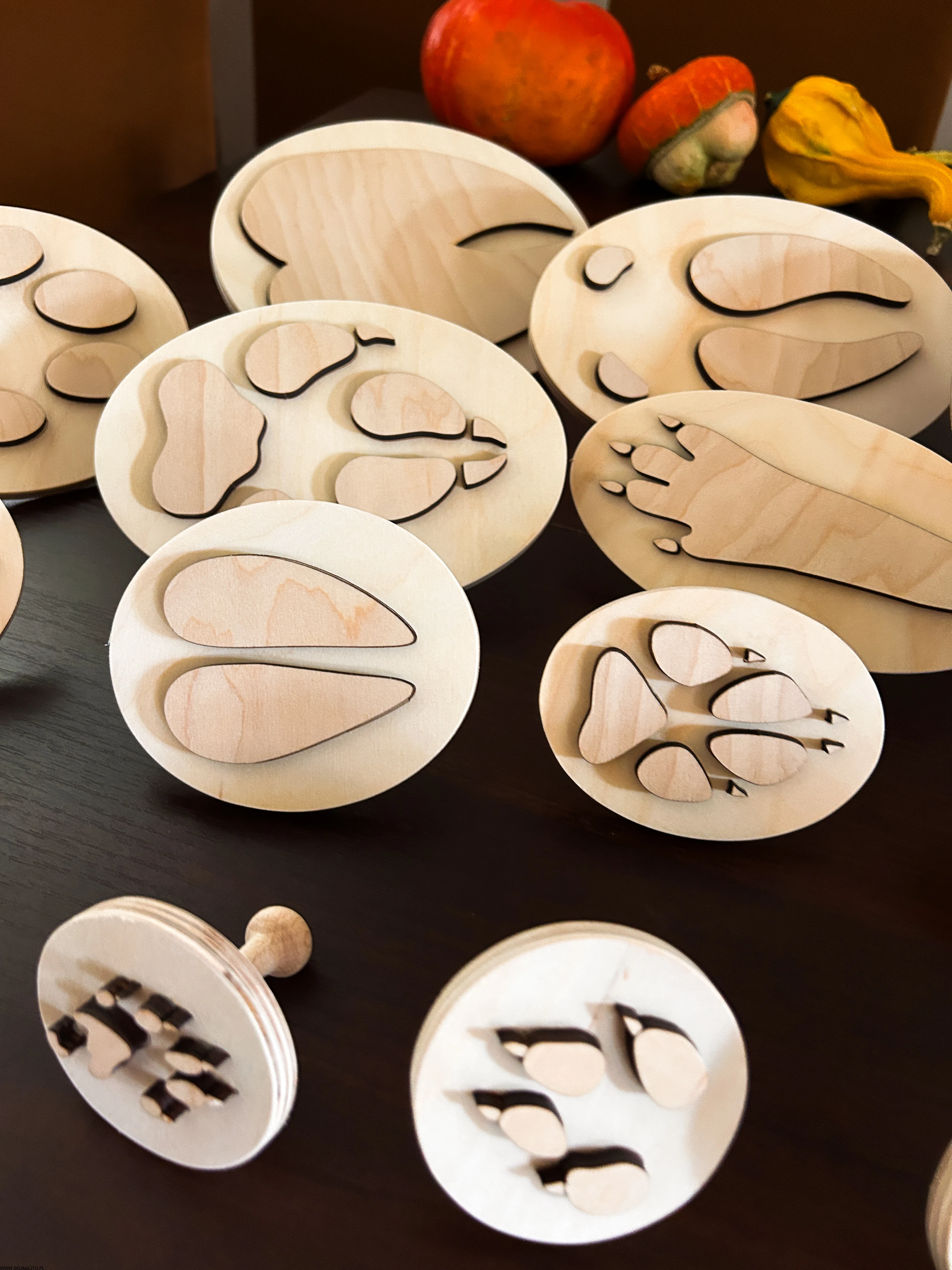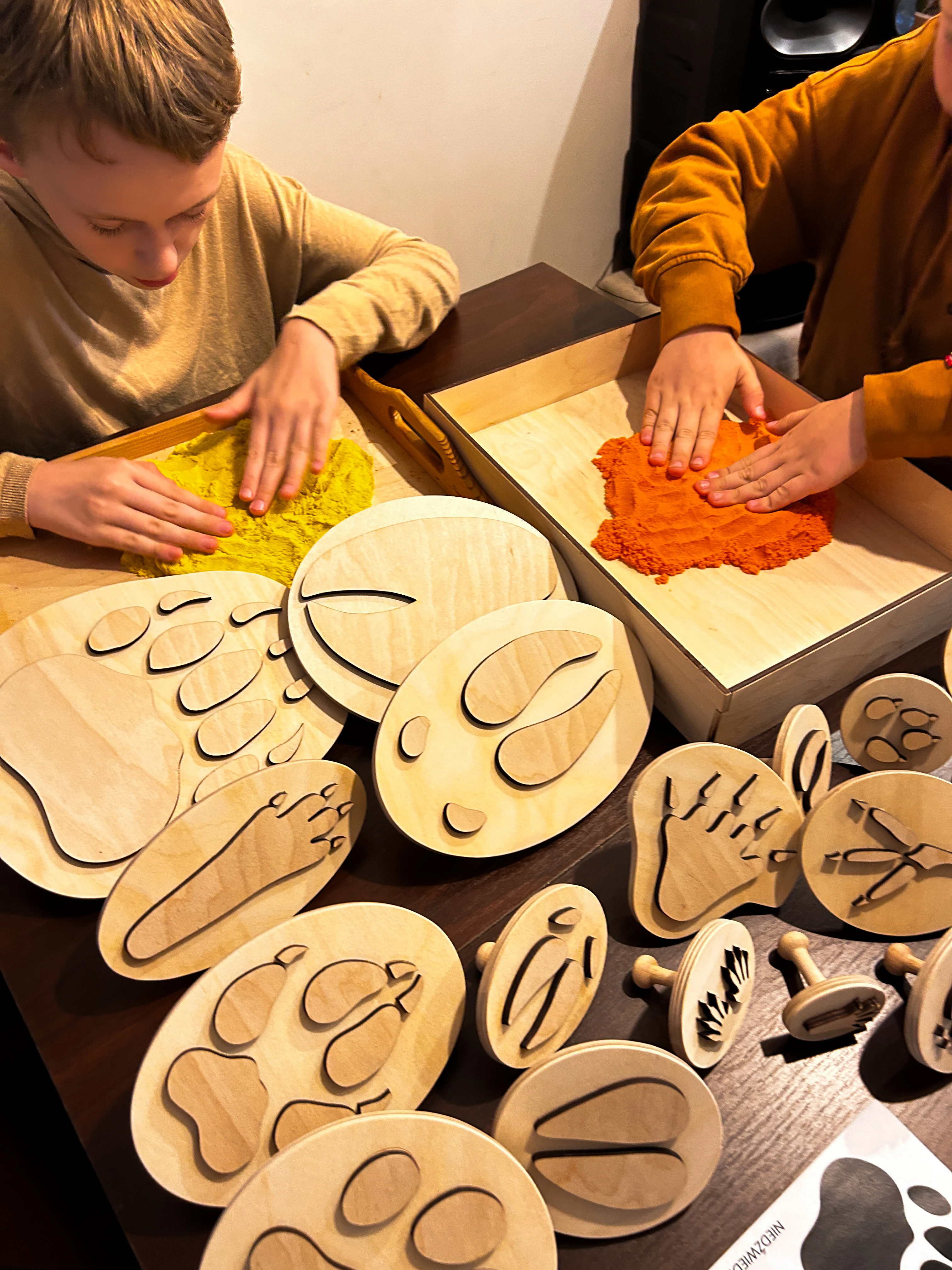 pieczątki tropy zwierząt, tropy zwierząt dla dzieci, realistyczne tropy edukacyjne, edukacja przyrodnicza pieczątki, pomoc sensoryczna tropy, ślady zwierząt leśnych, tropy do odbijania w piasku, edukacja przez zabawę, nauka o zwierzętach dla dzieci, drewniane pomoce Montessori
