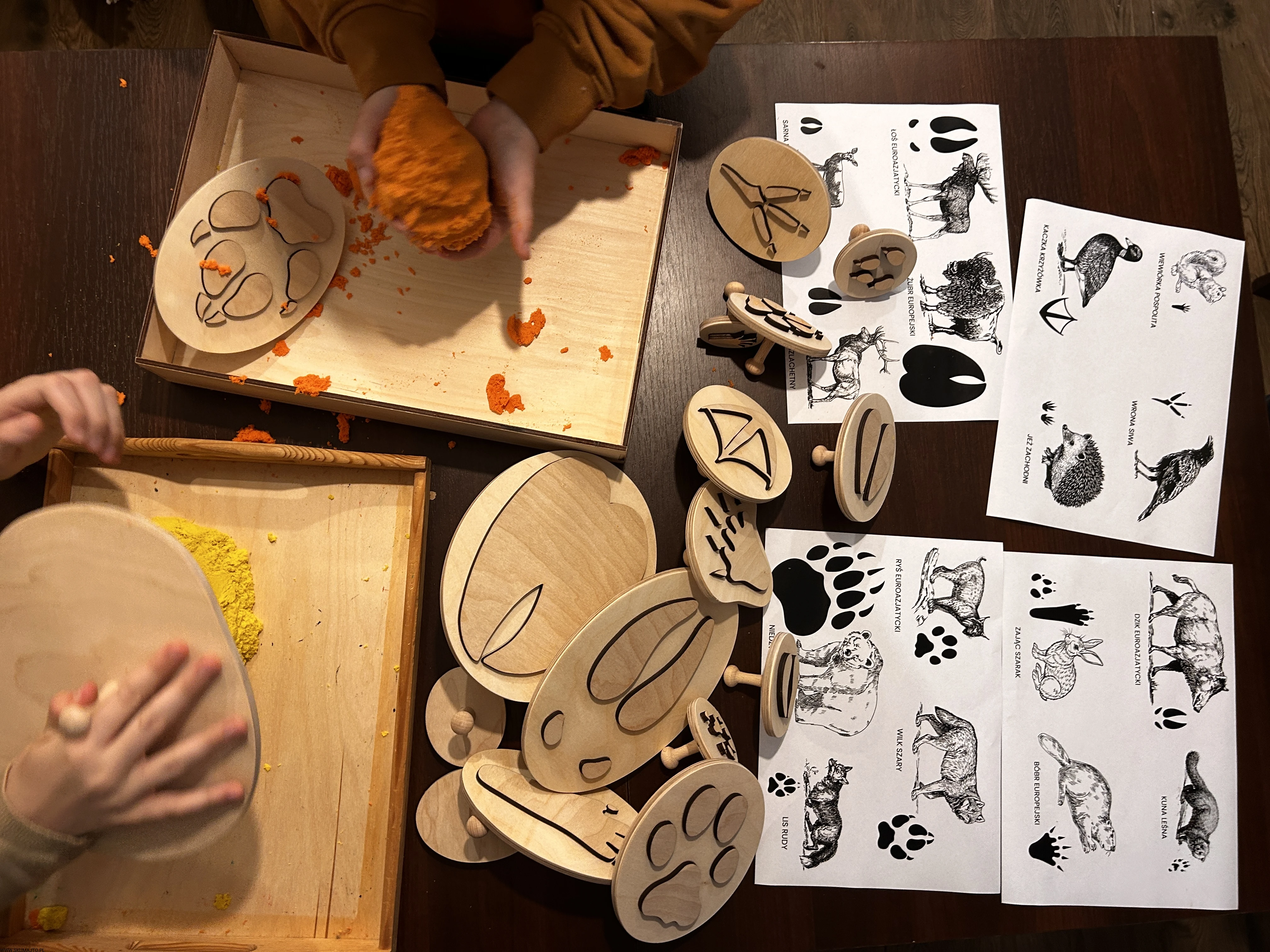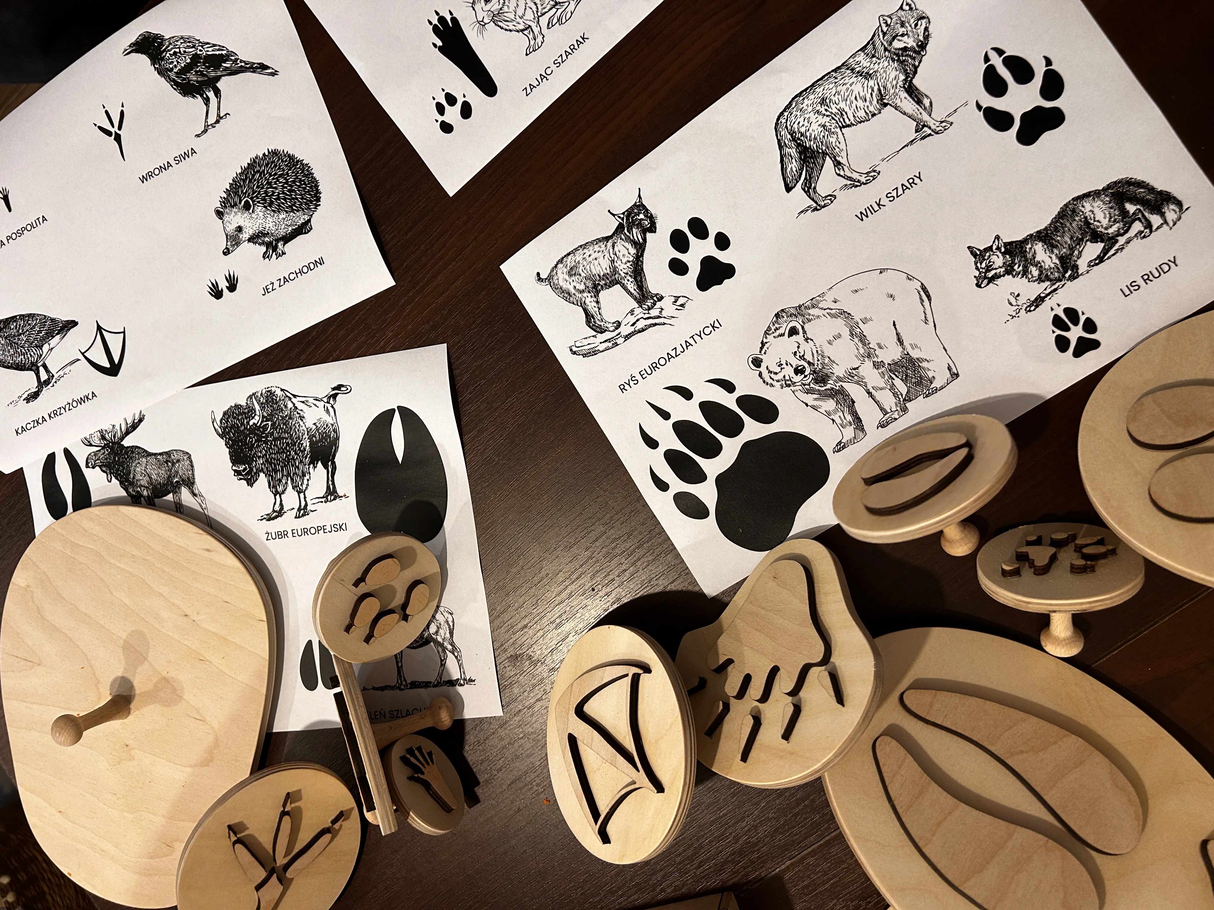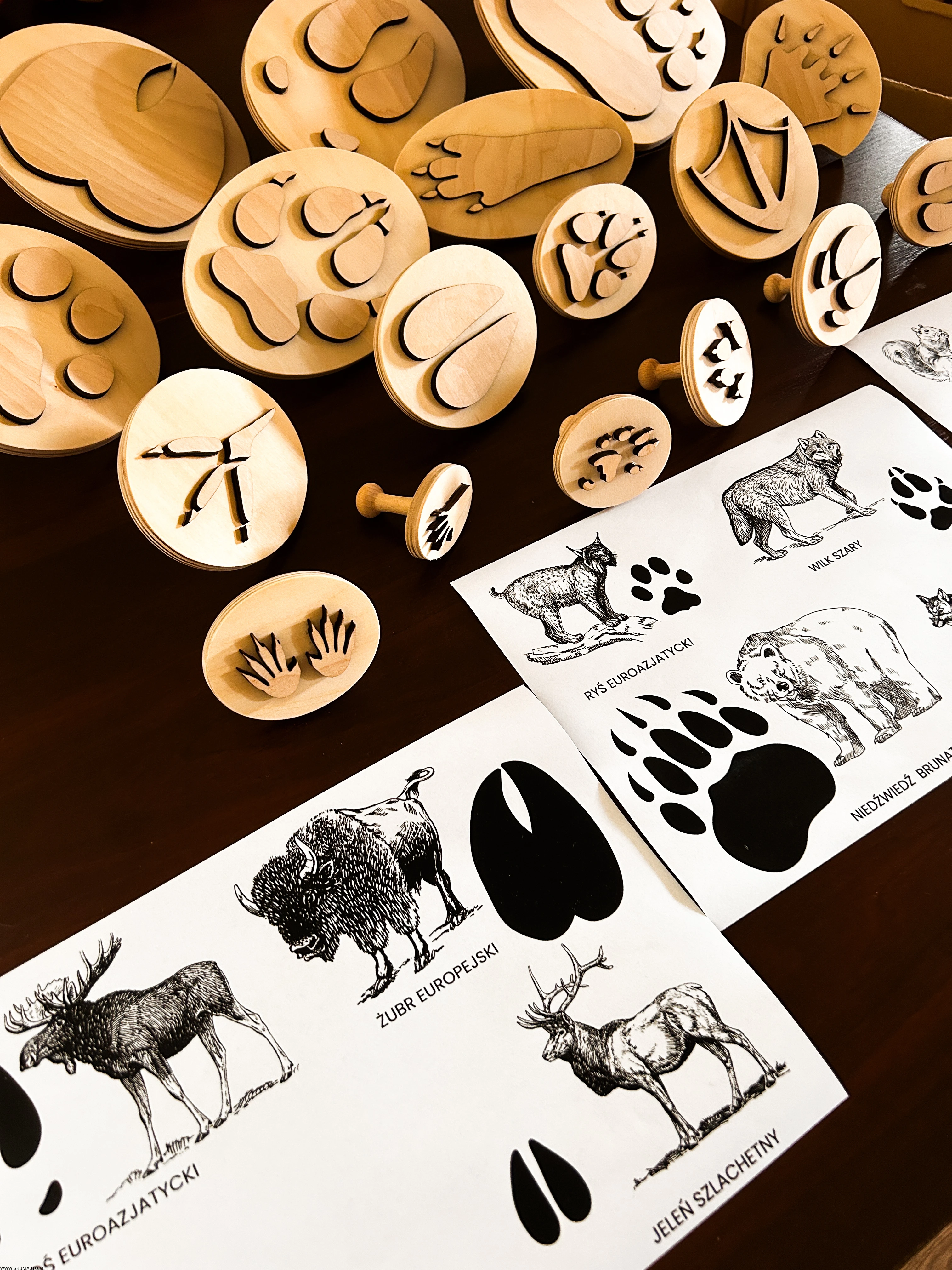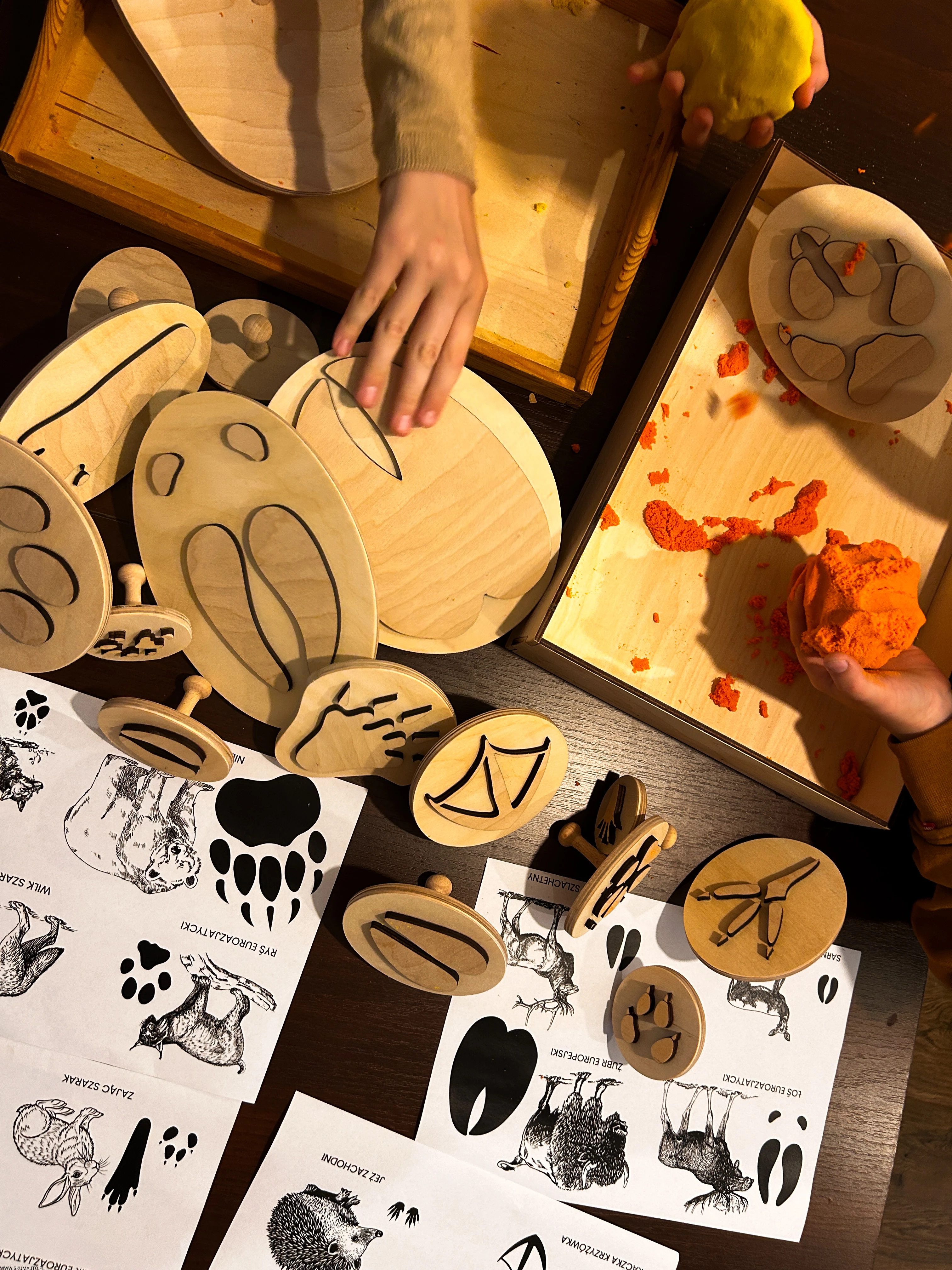 Wystarczy zestaw drewnianych pieczątek z tropami, które – dosłownie – przenoszą leśną ścieżkę do sali zabaw, przedszkola czy domu.