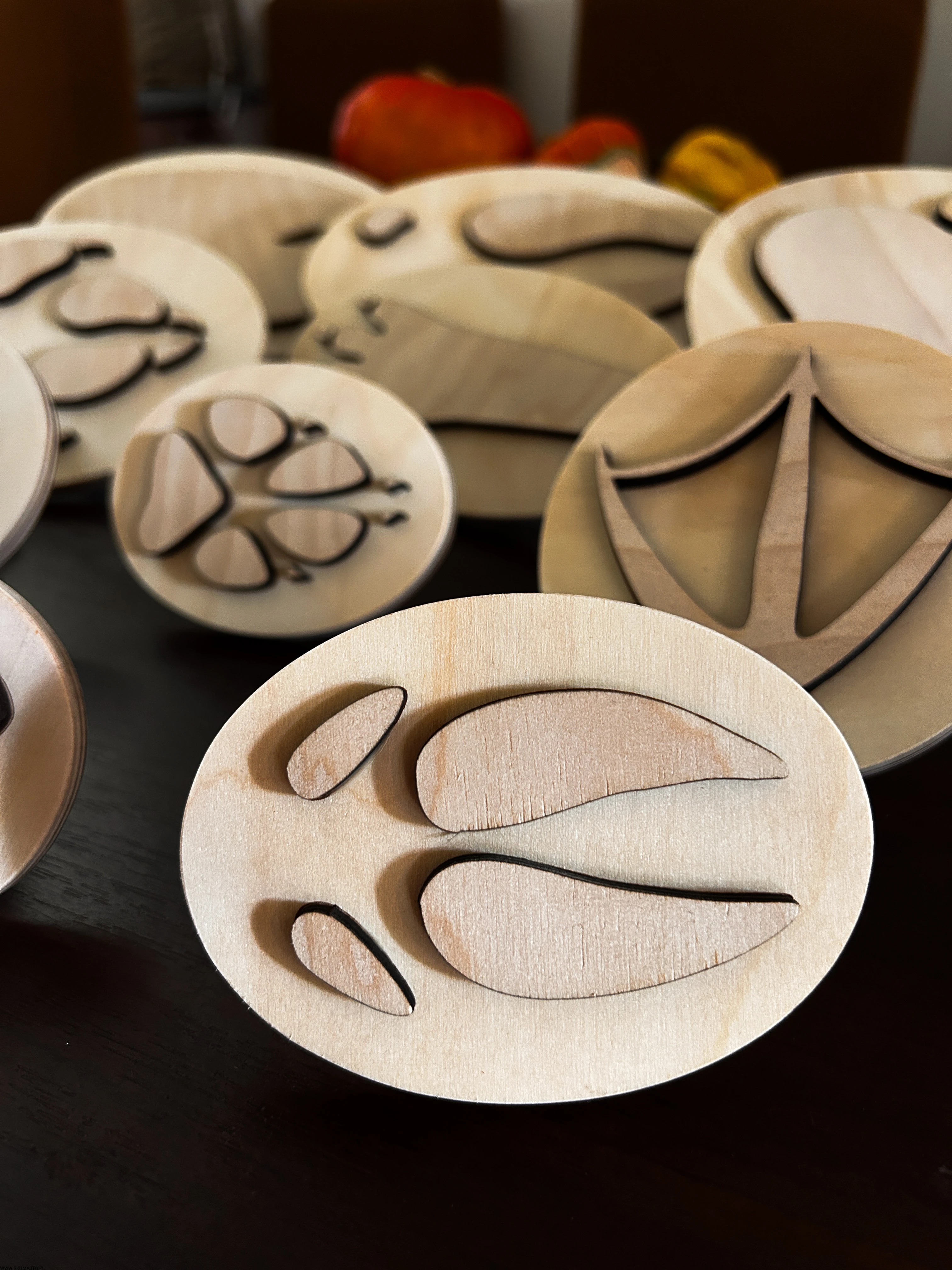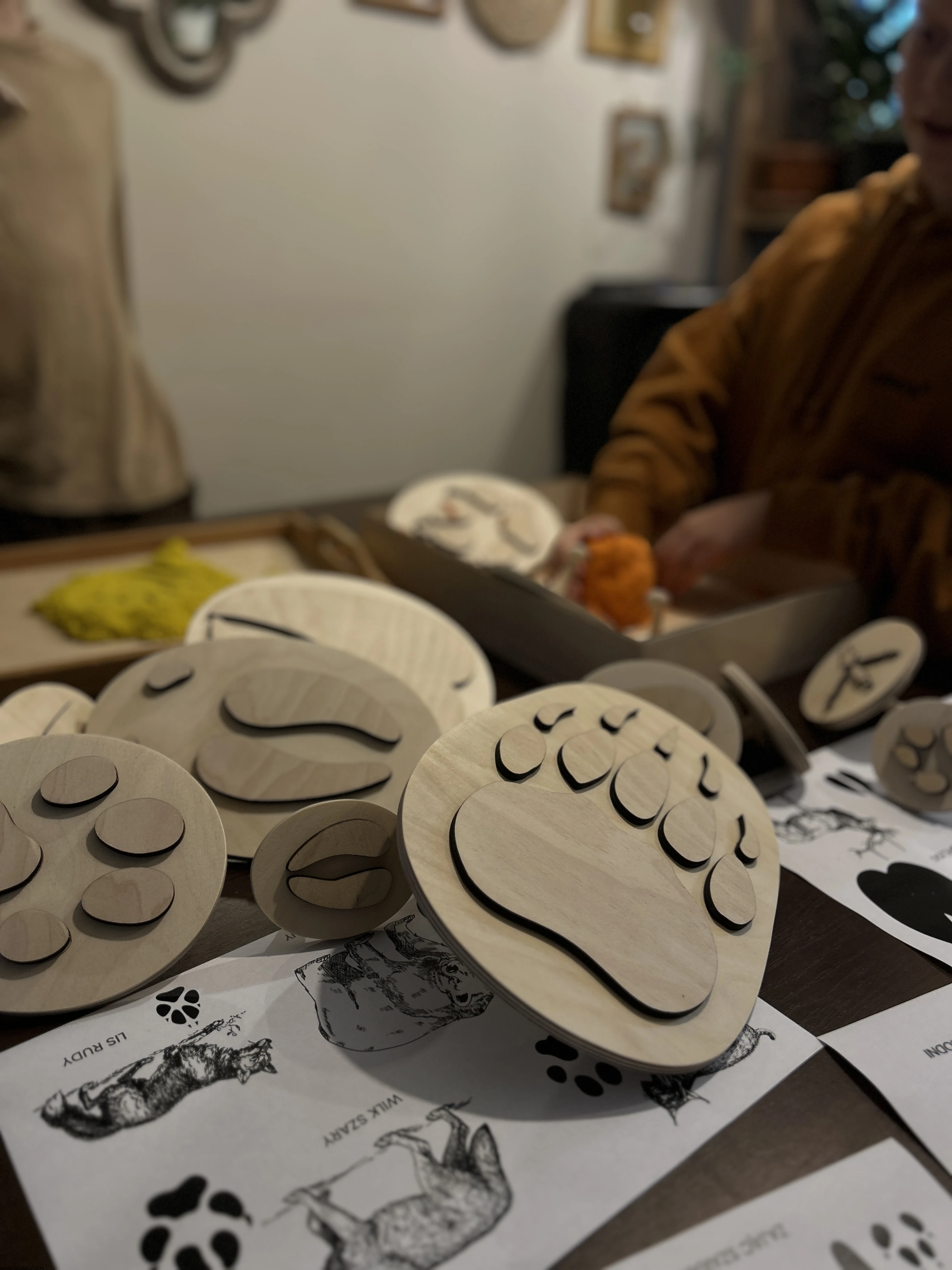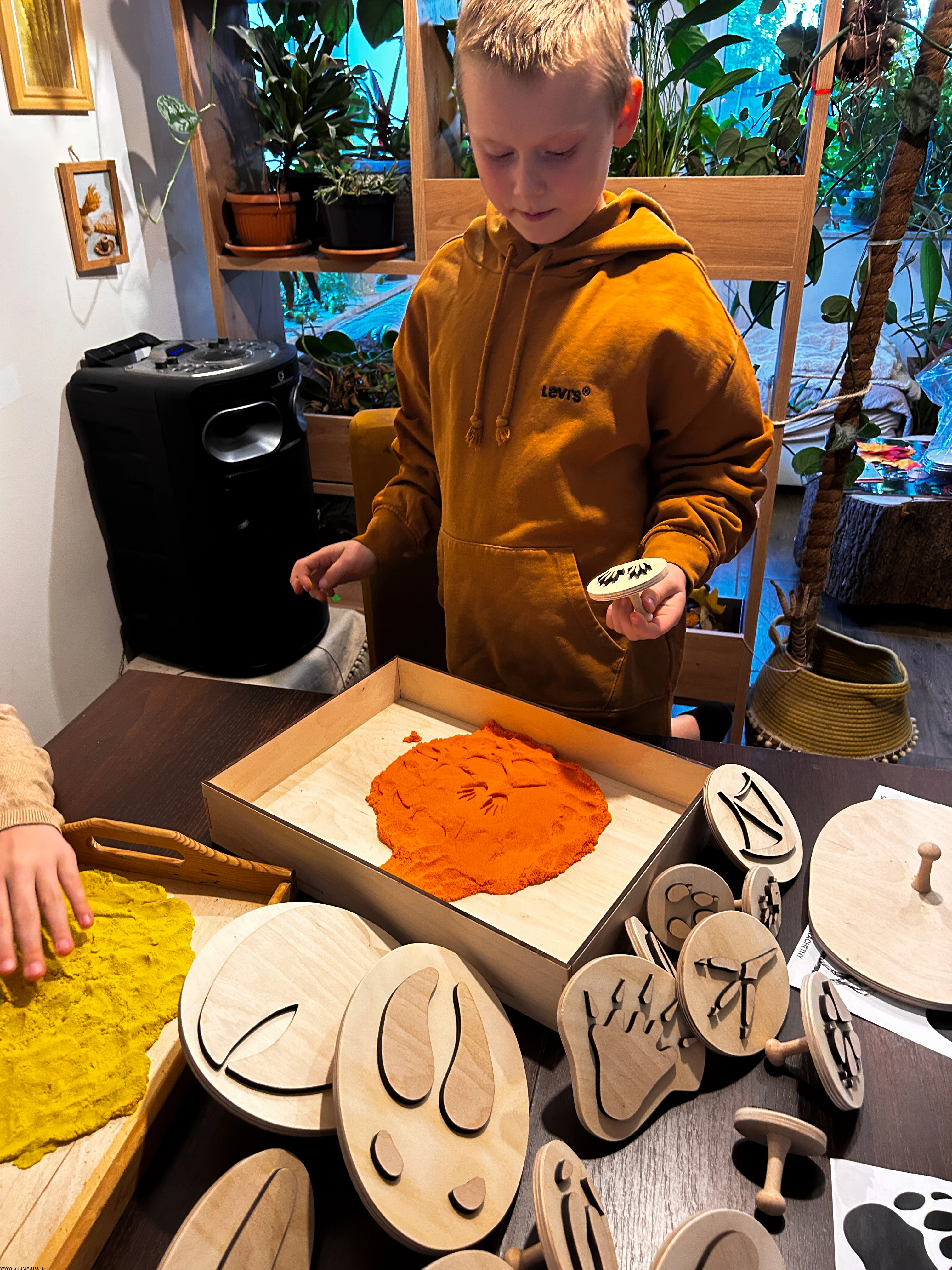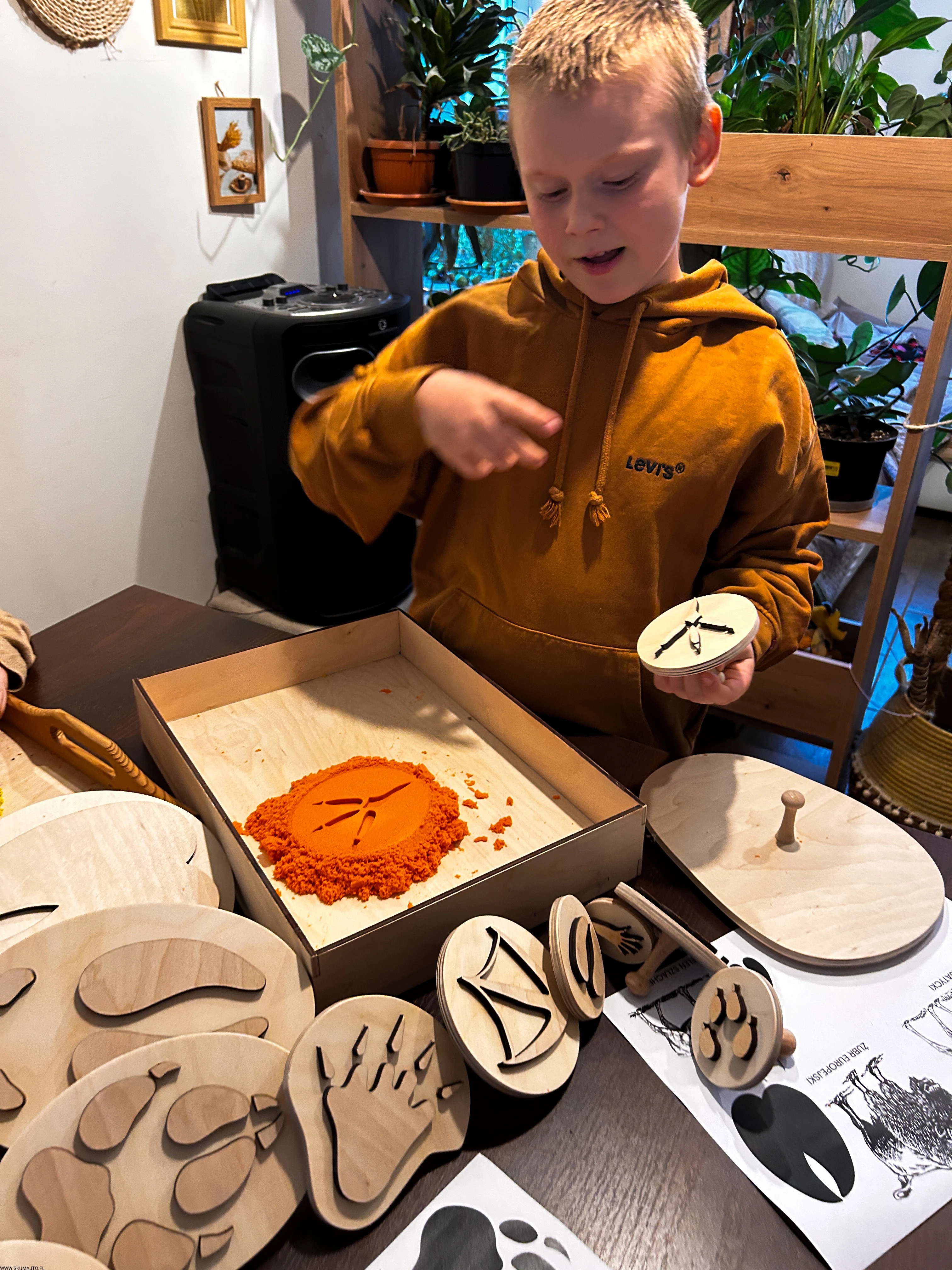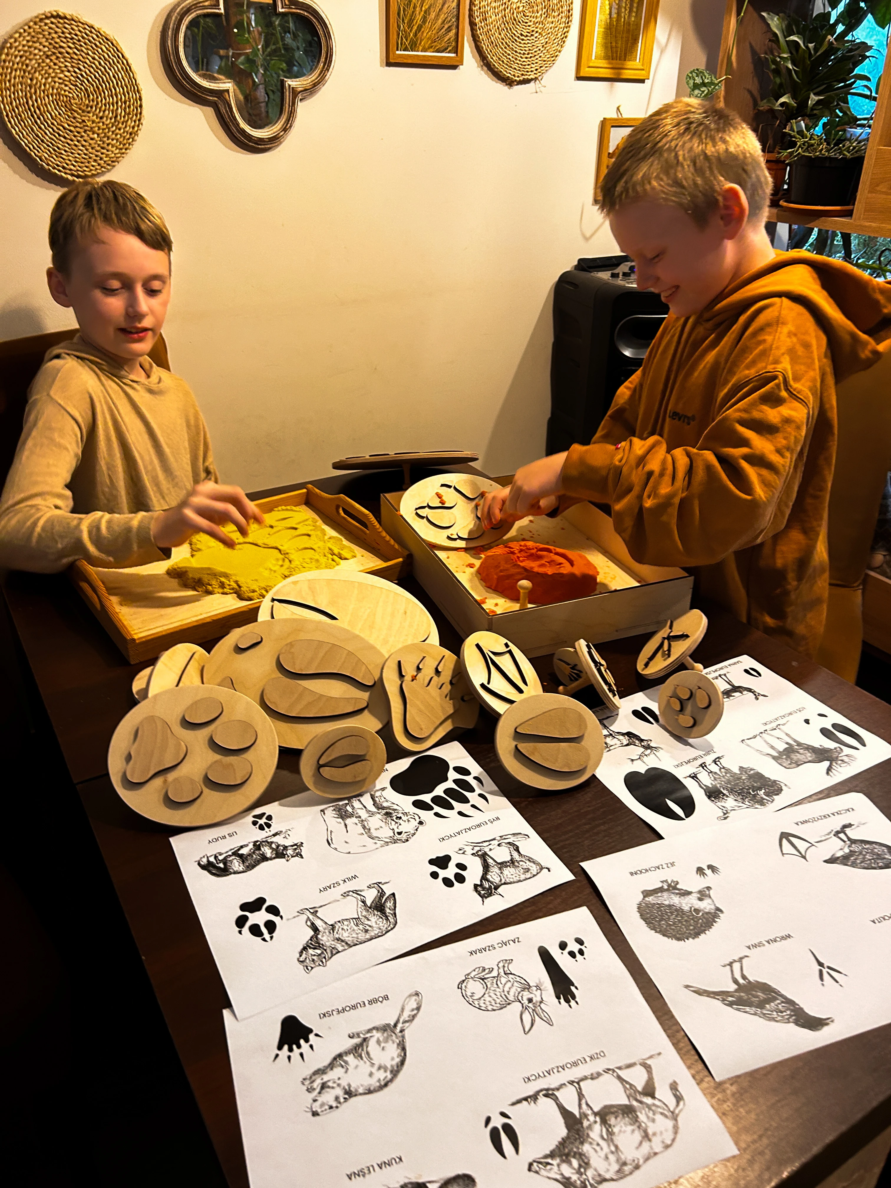 Wystarczy zestaw drewnianych pieczątek z tropami, które – dosłownie – przenoszą leśną ścieżkę do sali zabaw, przedszkola czy domu.