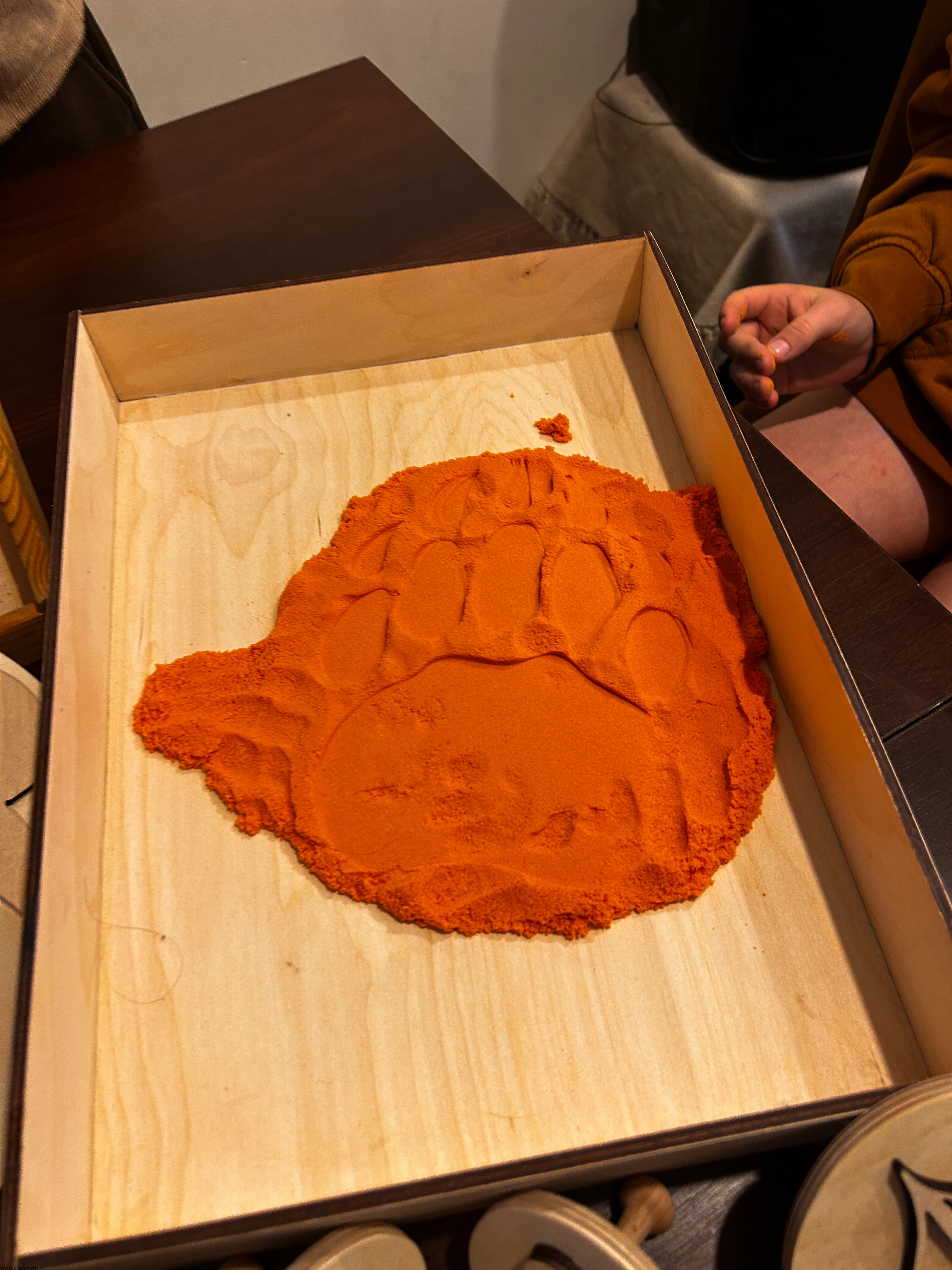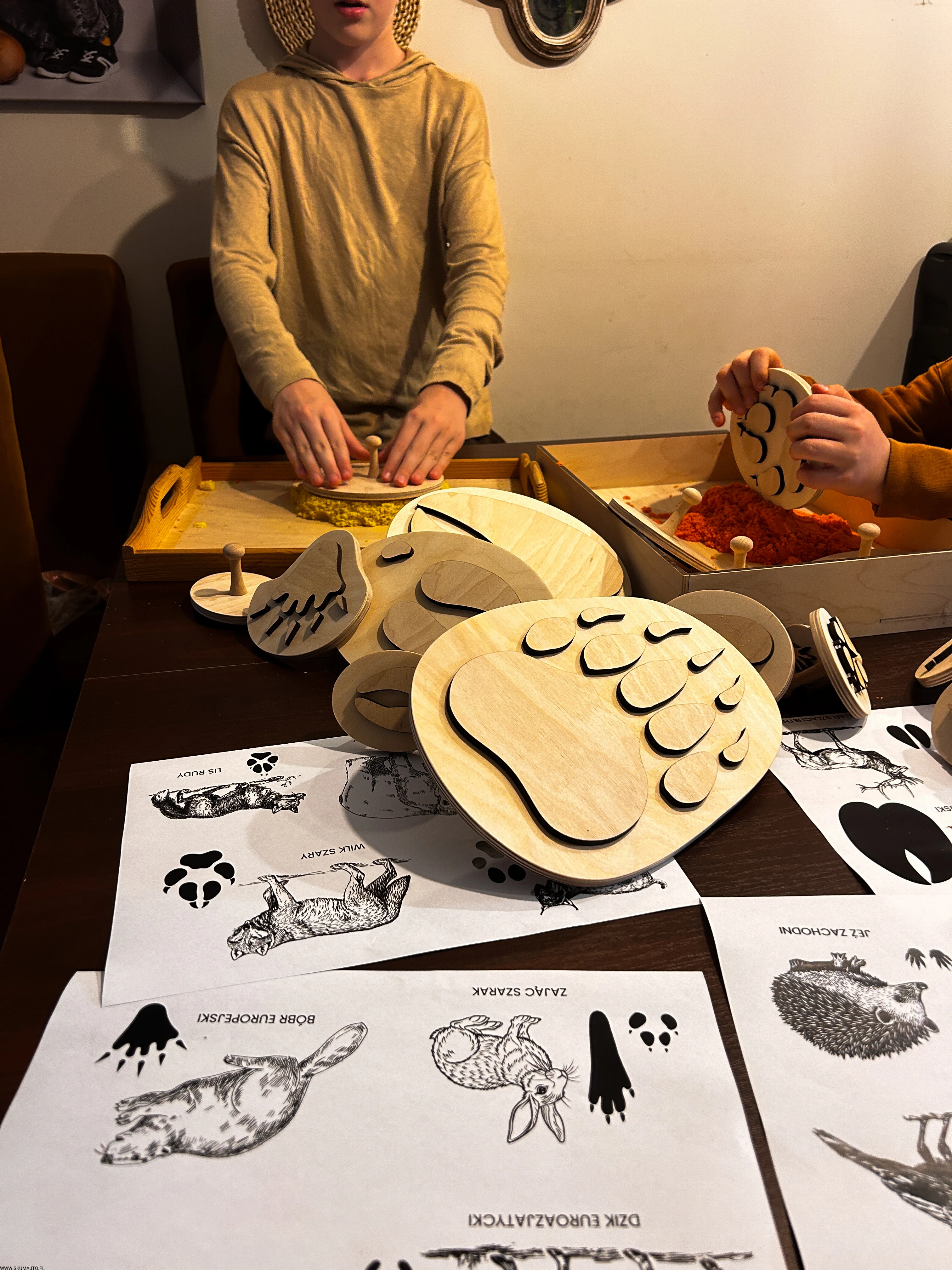Kto zostawił ten ślad? Dziecko odciska trop, a druga osoba musi odgadnąć, jakie zwierzę przeszło po „leśnej ścieżce”.