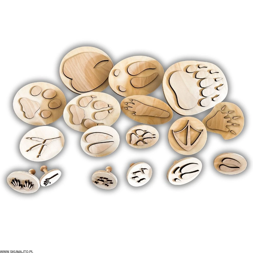 Zestaw drewnianych pieczątek – realistyczne tropy zwierząt