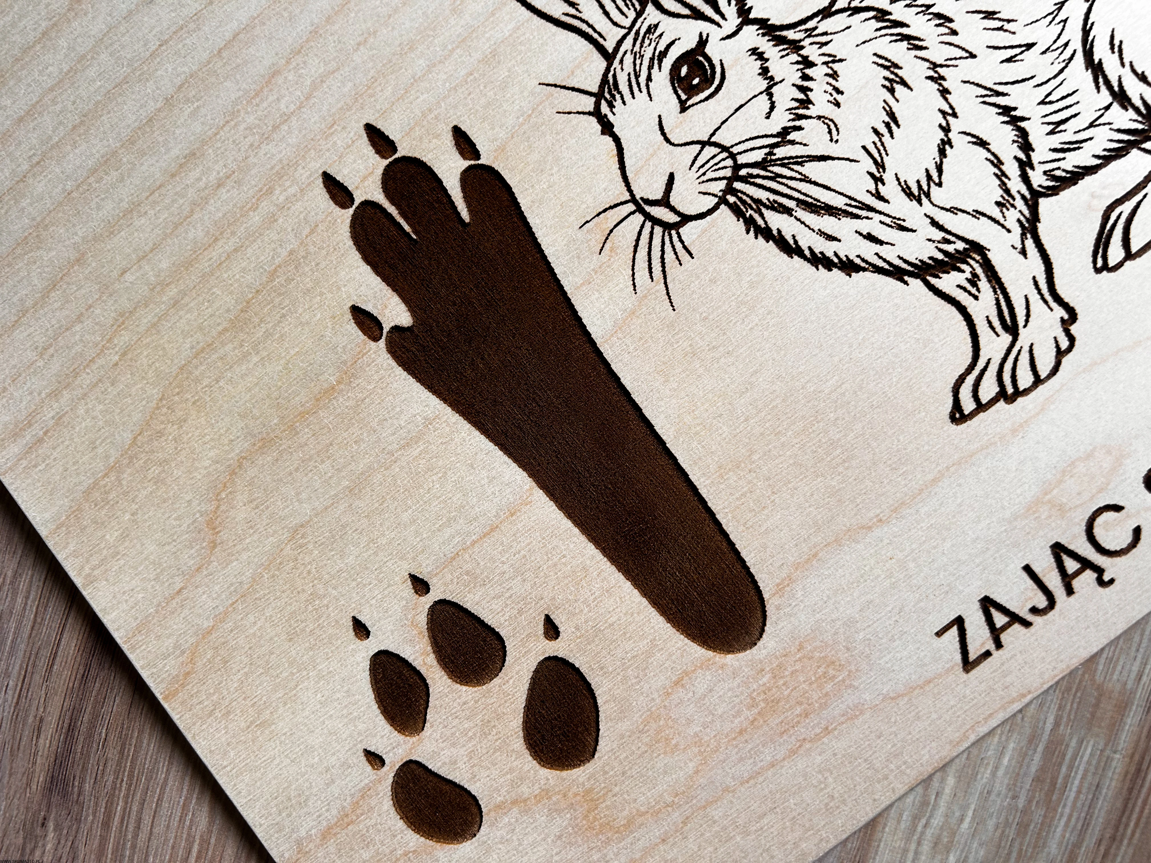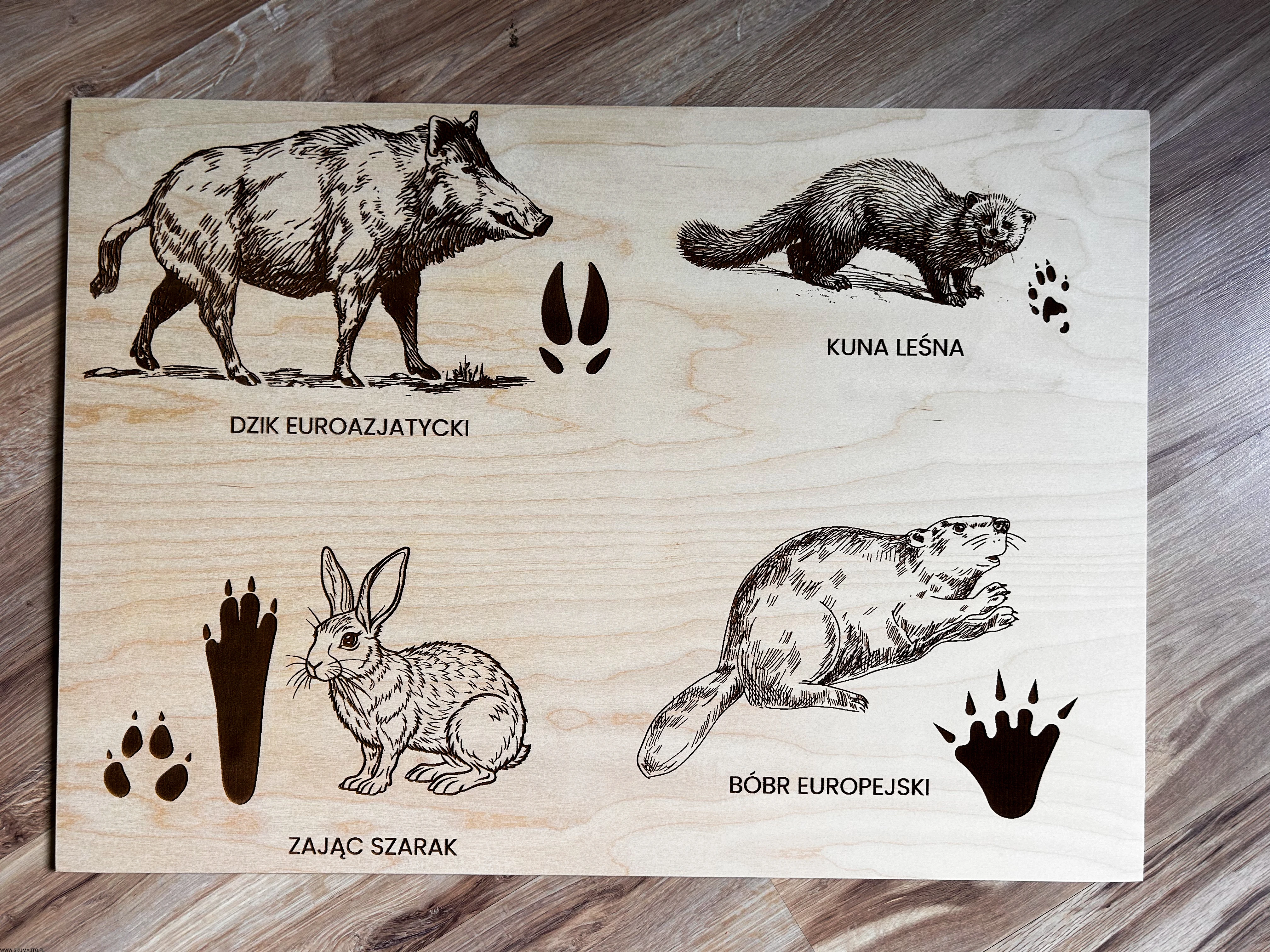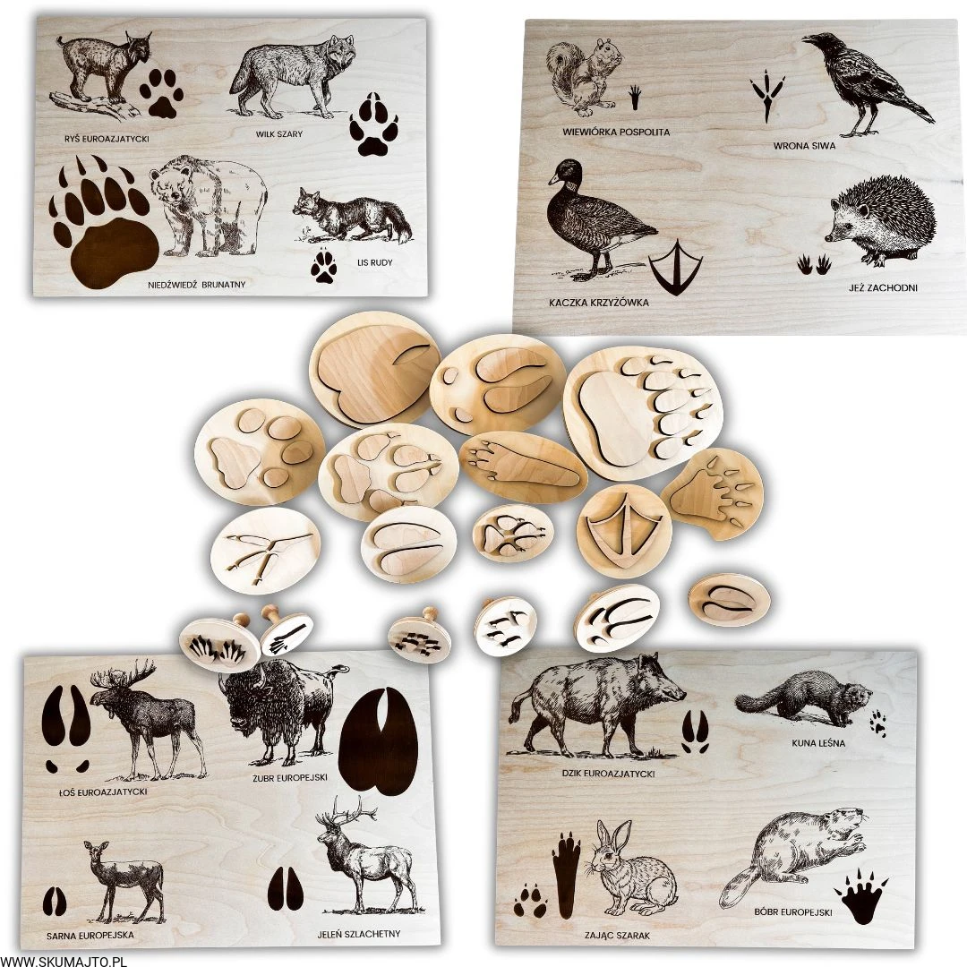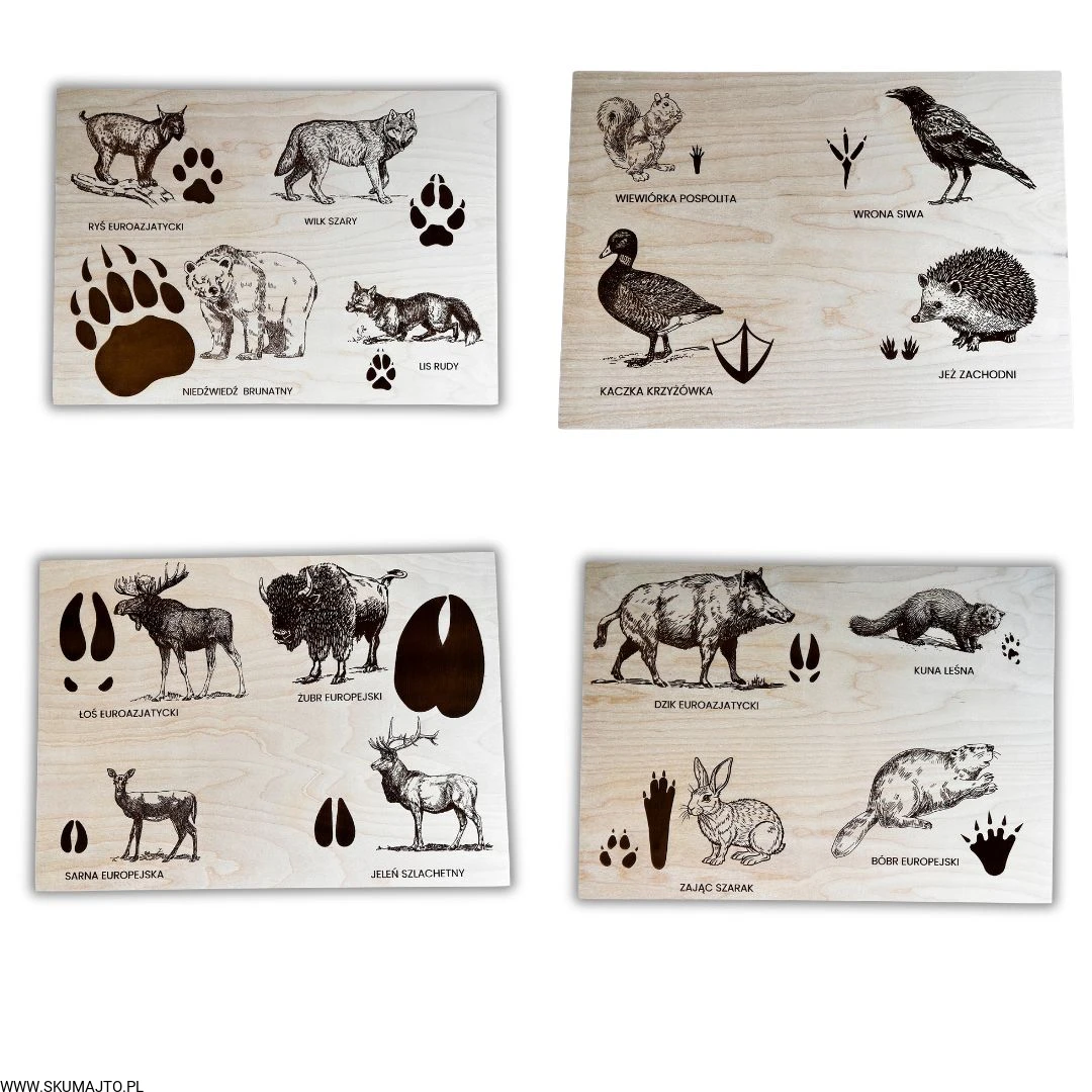Wykonane z wysokiej jakości drewna, każda plansza prezentuje sylwetki zwierząt leśnych i ich tropy – wygrawerowane w sposób precyzyjny, trwały i efektowny.