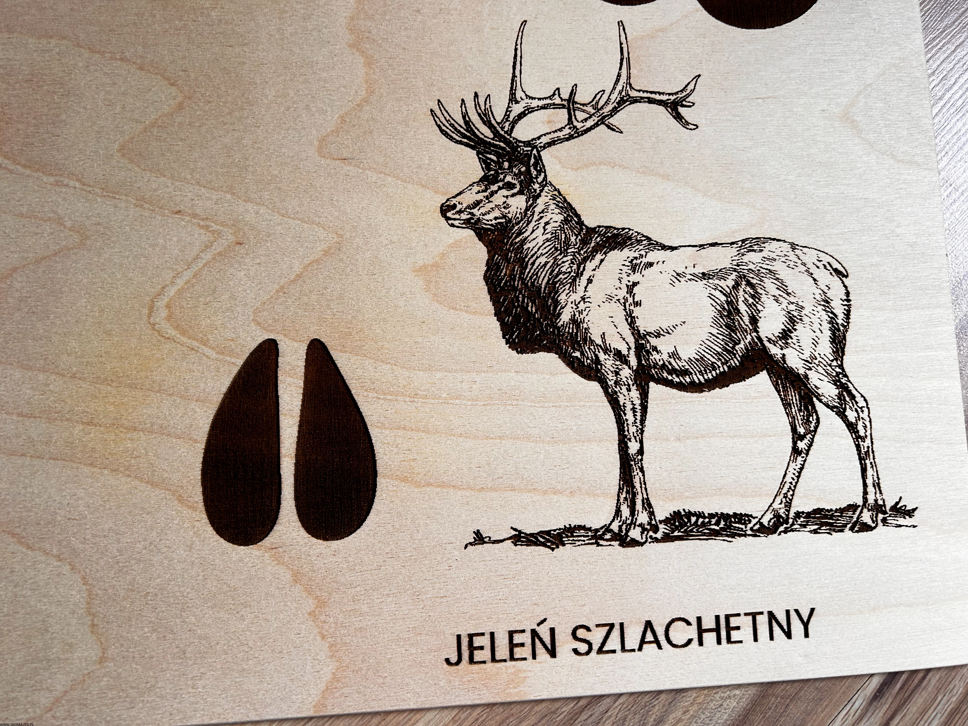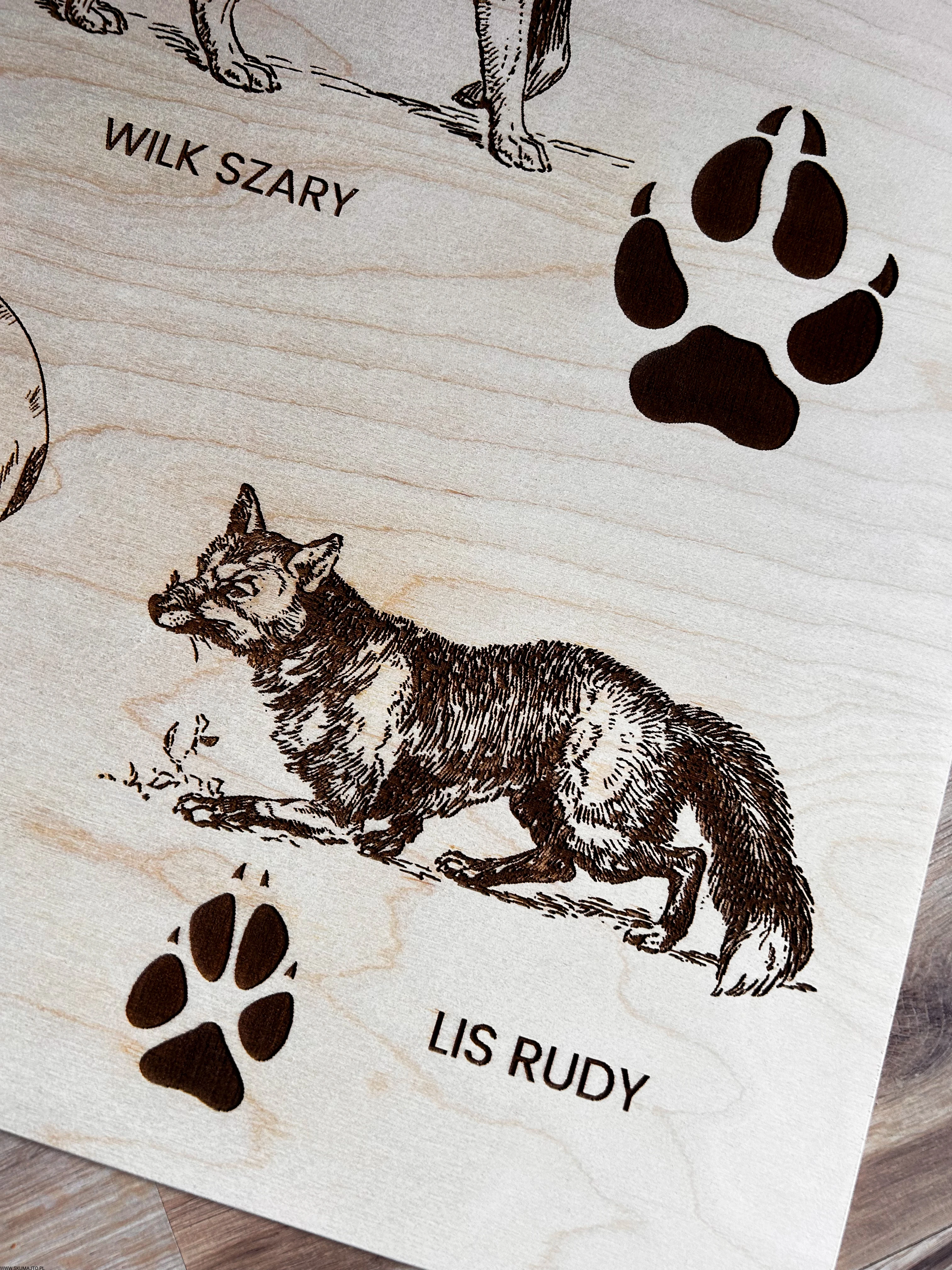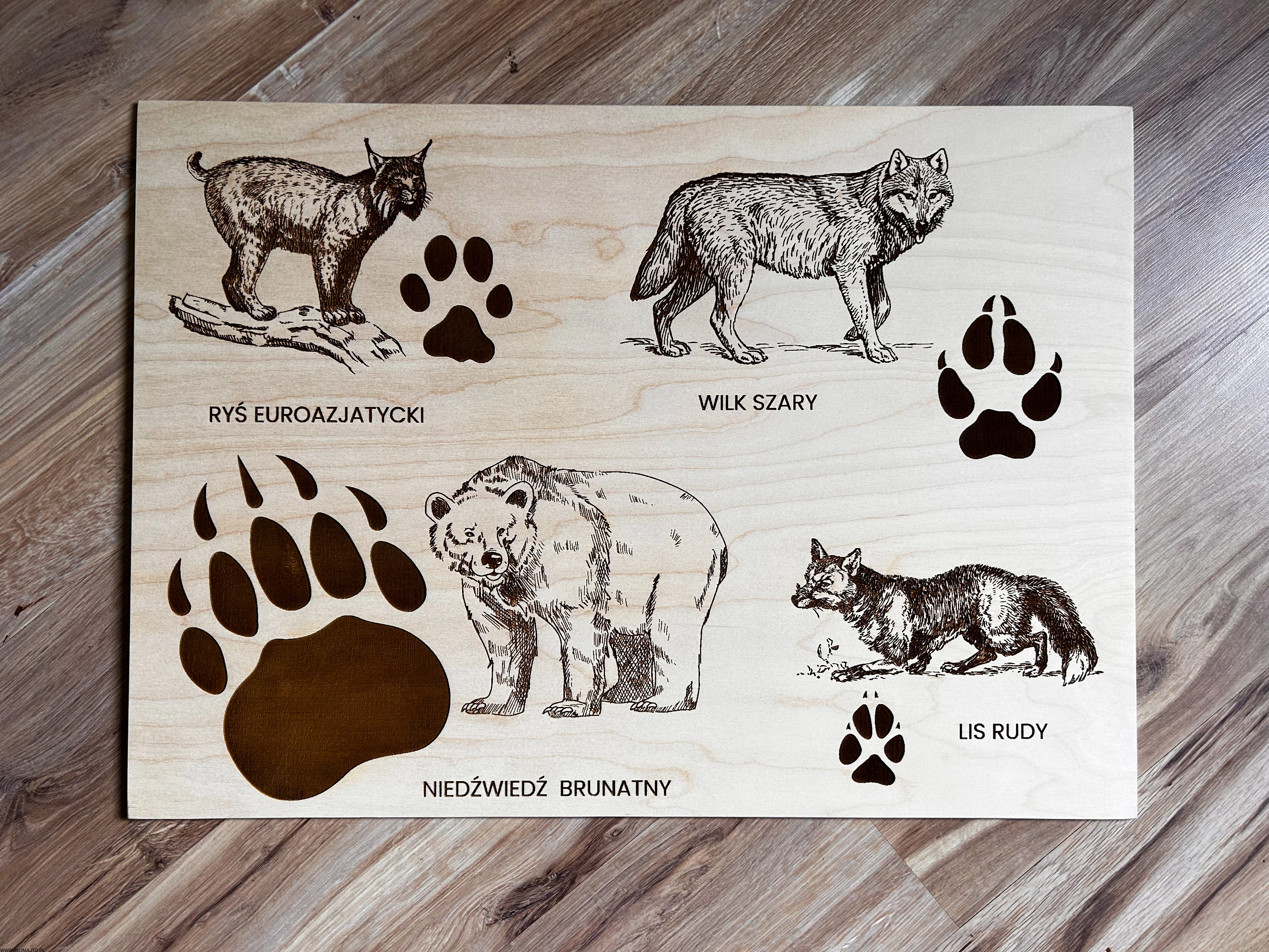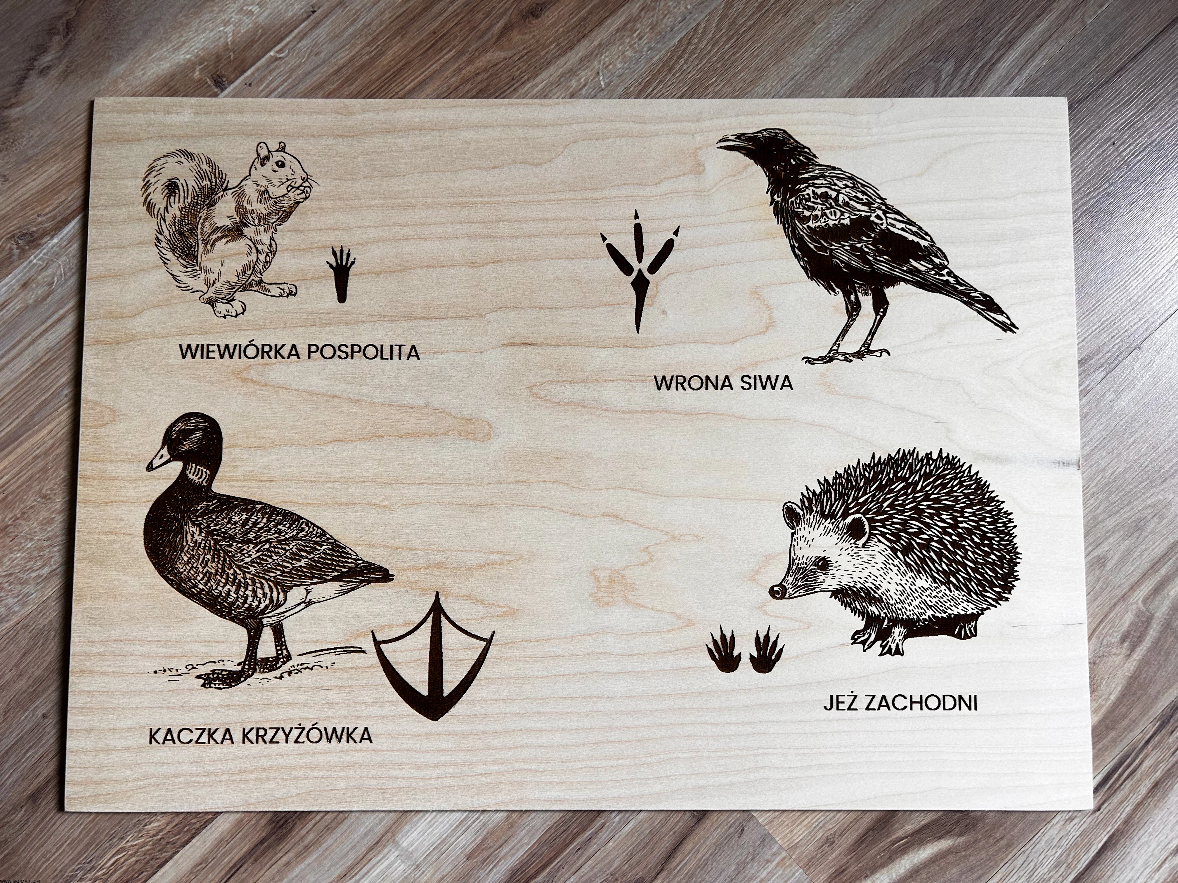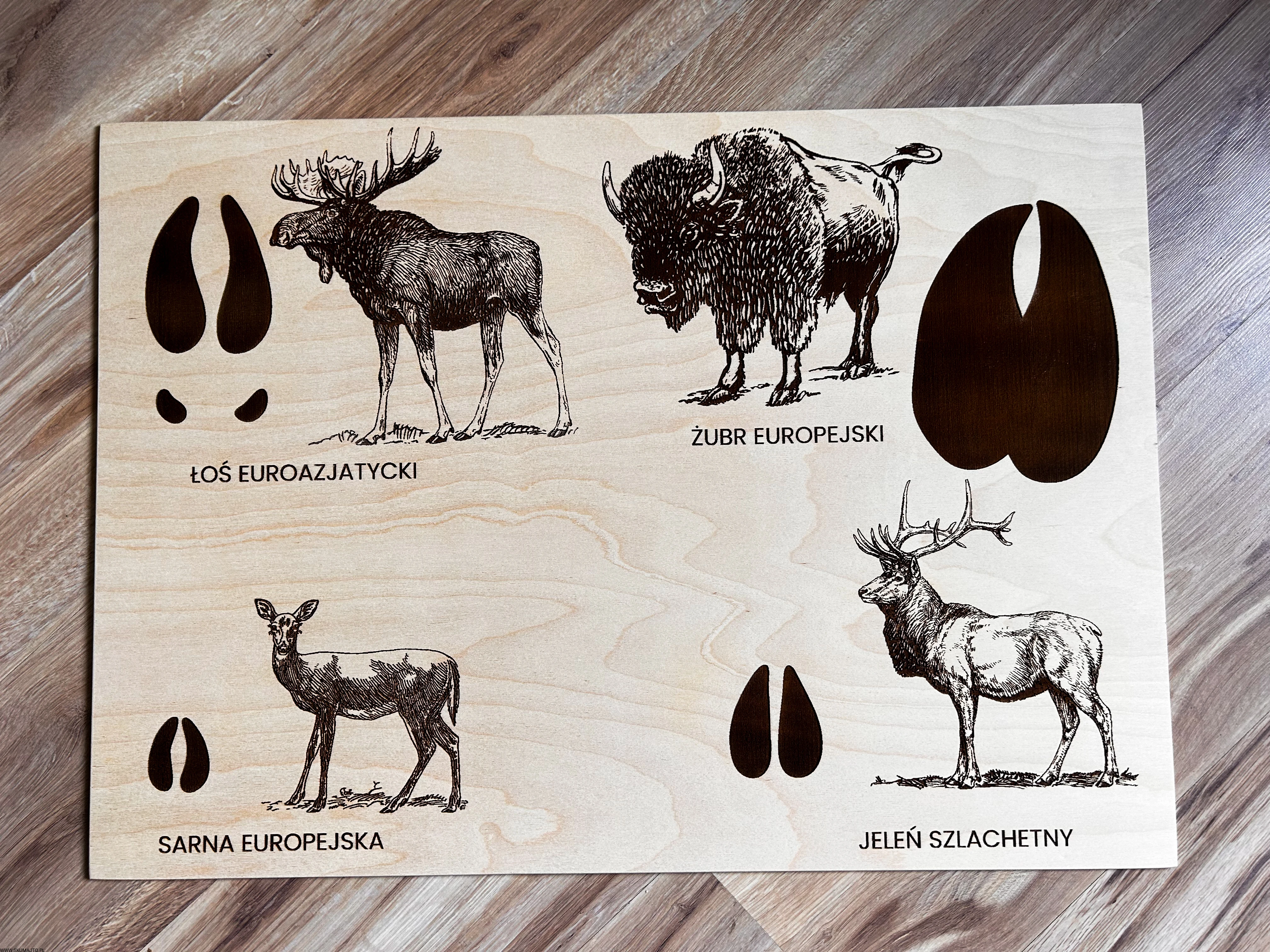 Wykonane z wysokiej jakości drewna, każda plansza prezentuje sylwetki zwierząt leśnych i ich tropy – wygrawerowane w sposób precyzyjny, trwały i efektowny.