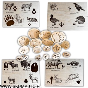 W zestawie znajduje się komplet pieczątek z tropami wszystkich zwierząt z plansz. Co wyjątkowe – każda pieczątka jest w skali 1:1, czyli przedstawia realistyczny rozmiar śladu, jaki dane zwierzę zostawia w lesie.