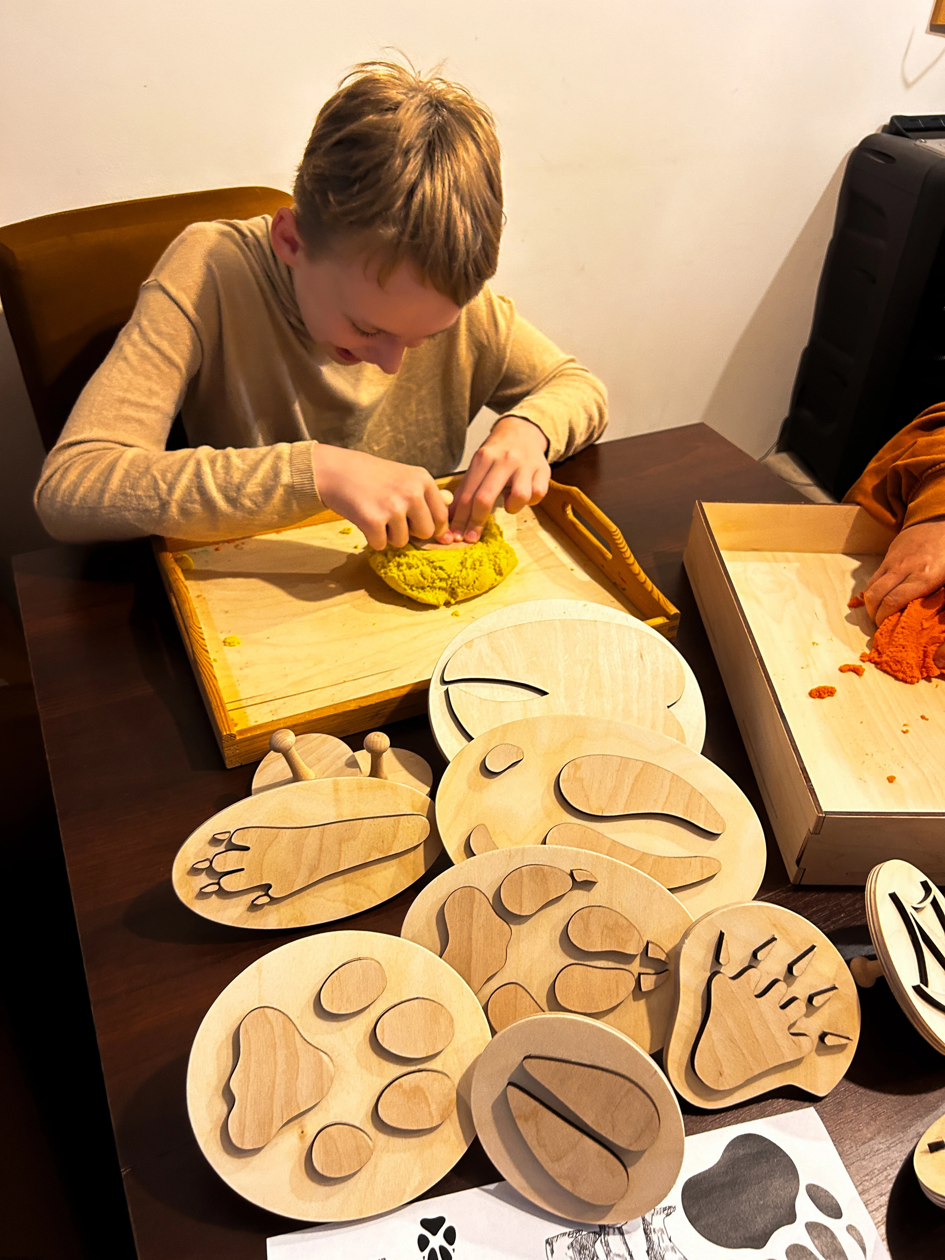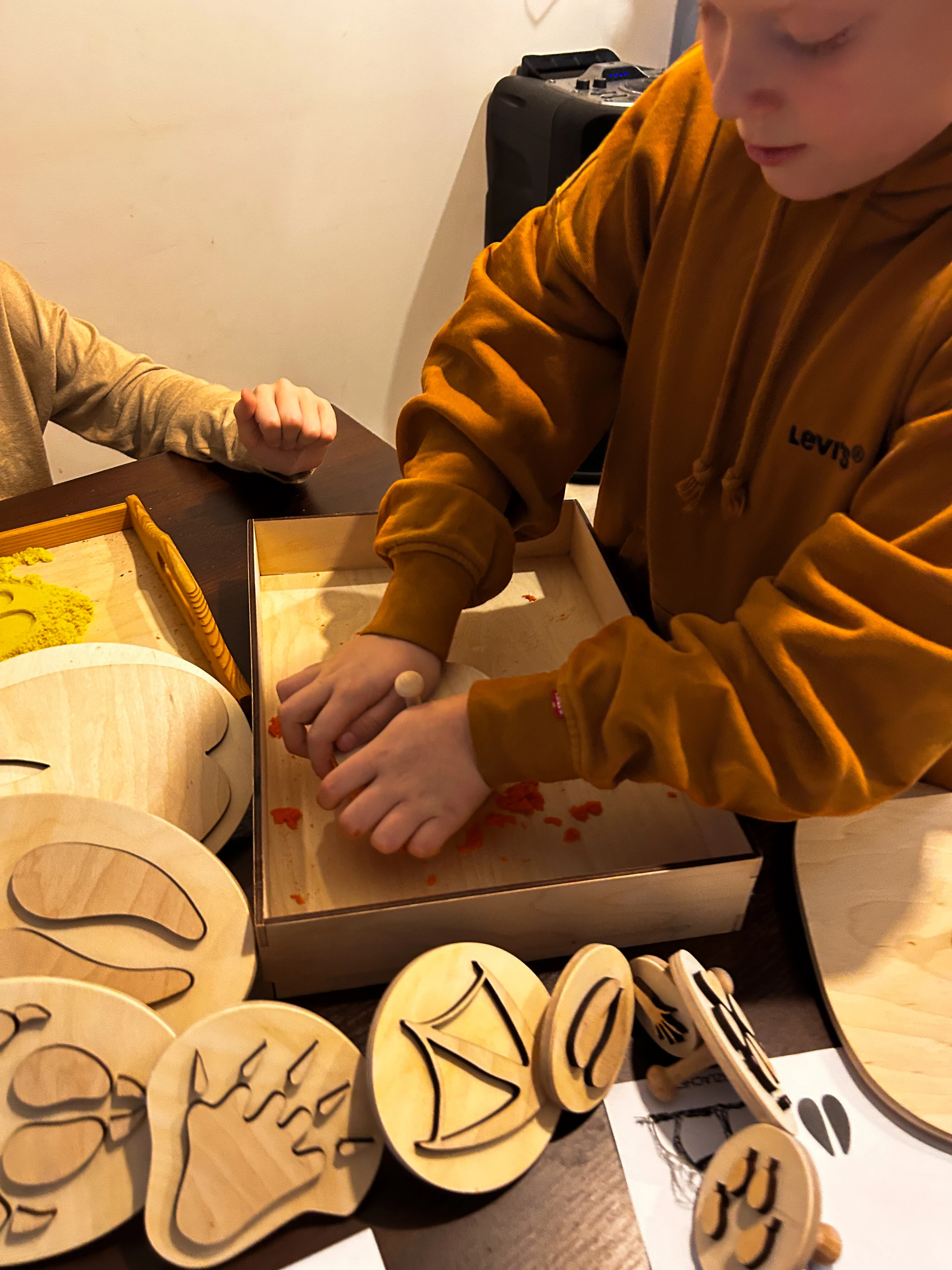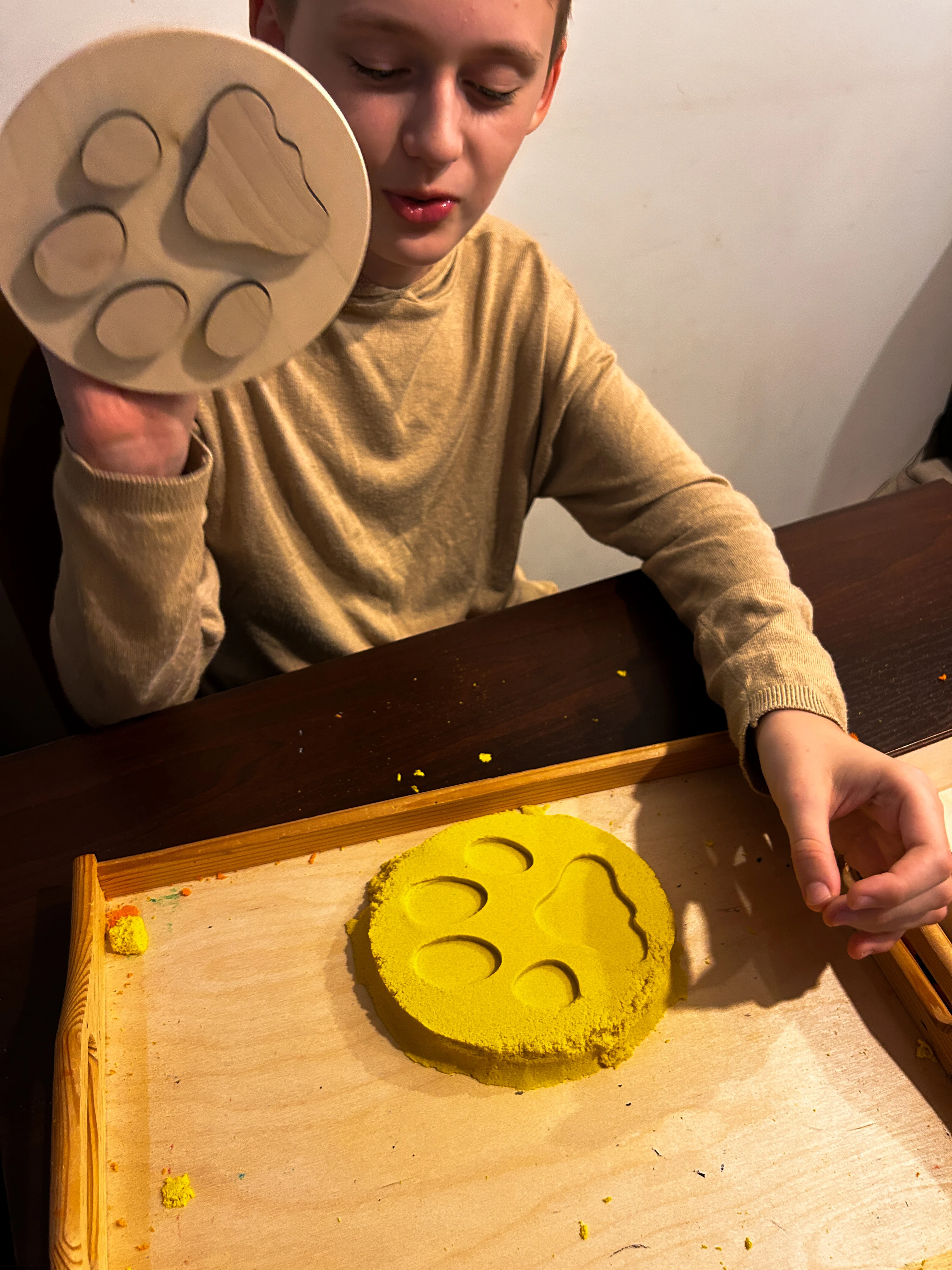 Odciskamy tropy w piasku kinetycznym, a dzieci mają za zadanie ustalić, który zwierzak „przebiegł” przez pokój. Idealna zabawa na logikę i pamięć.