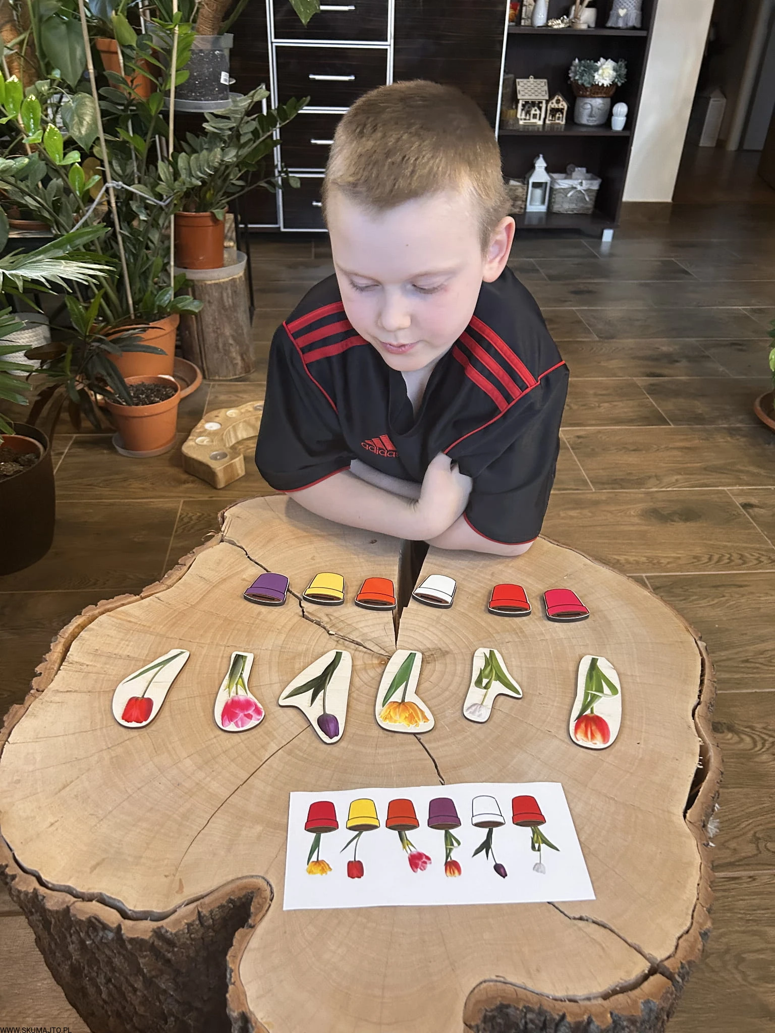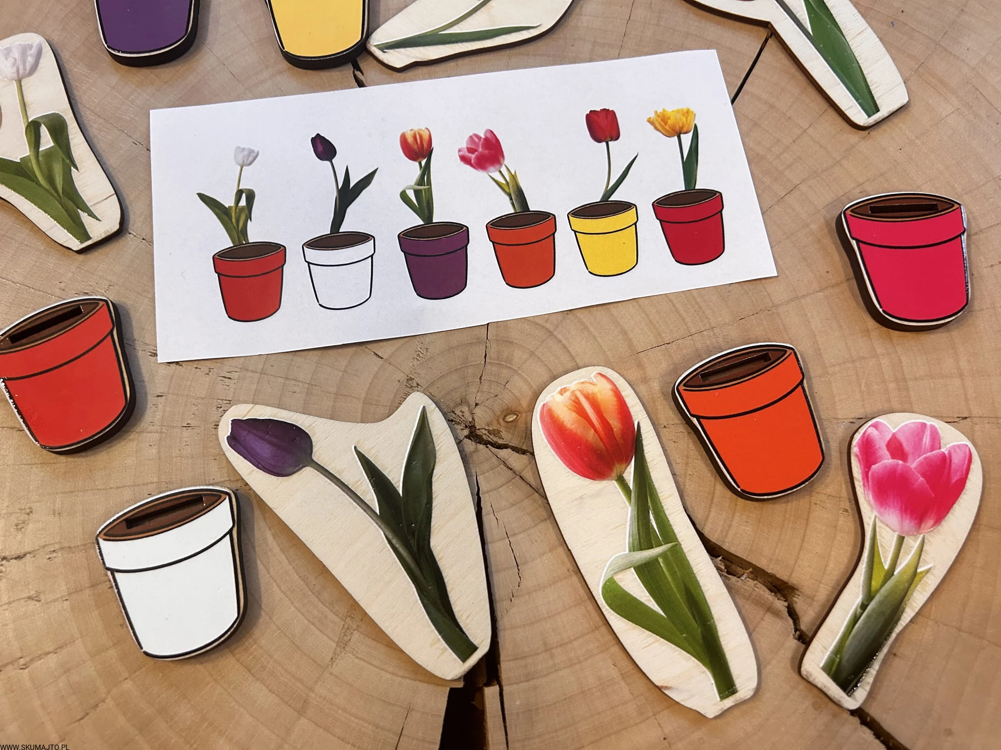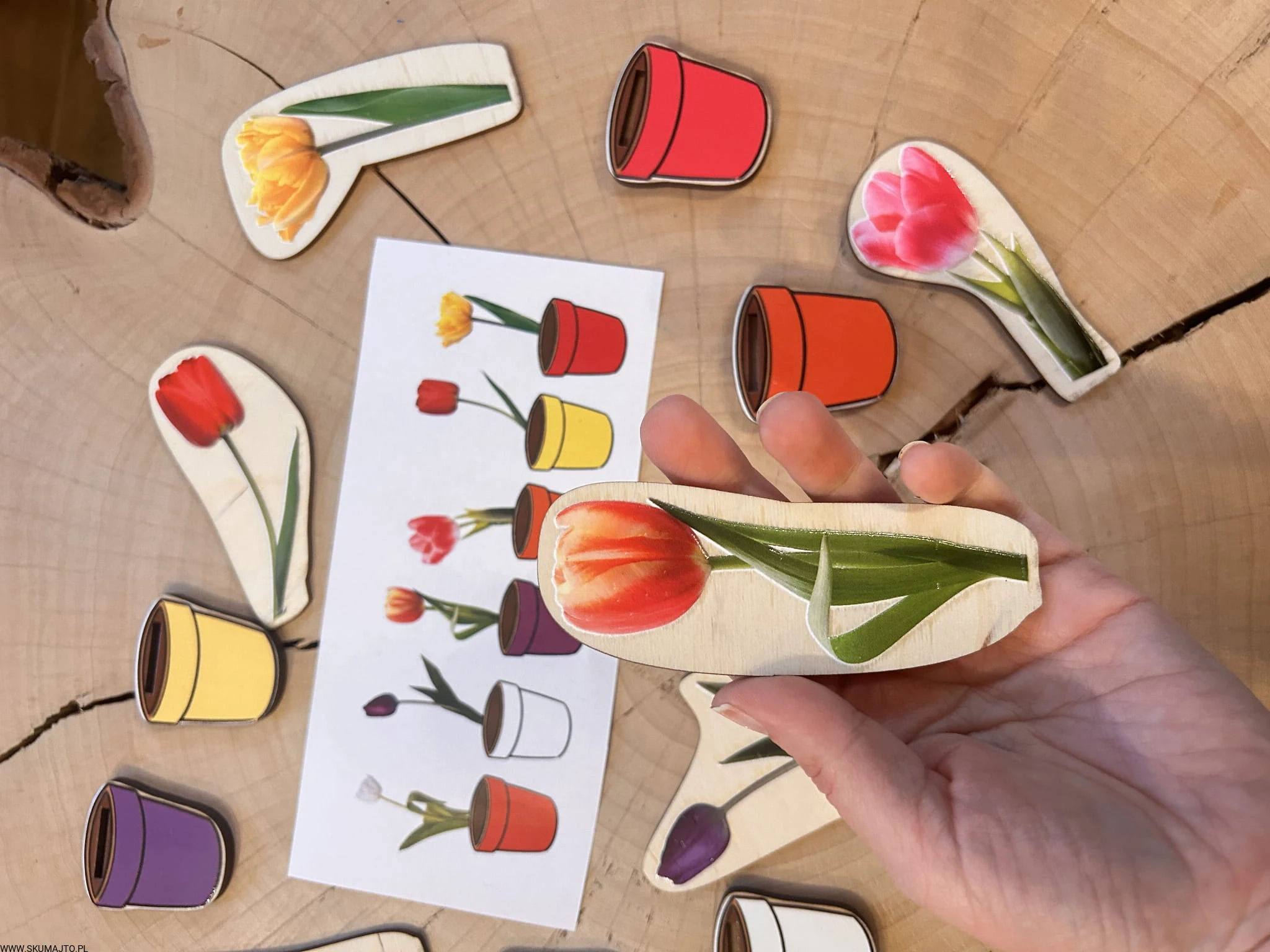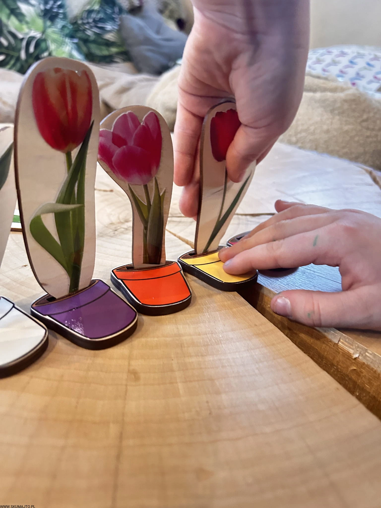 ✔️ Rozwój motoryki małej – dopasowywanie tulipanów i doniczek, chwytanie i układanie elementów to świetne ćwiczenie precyzji rączek i koordynacji ręka-oko.