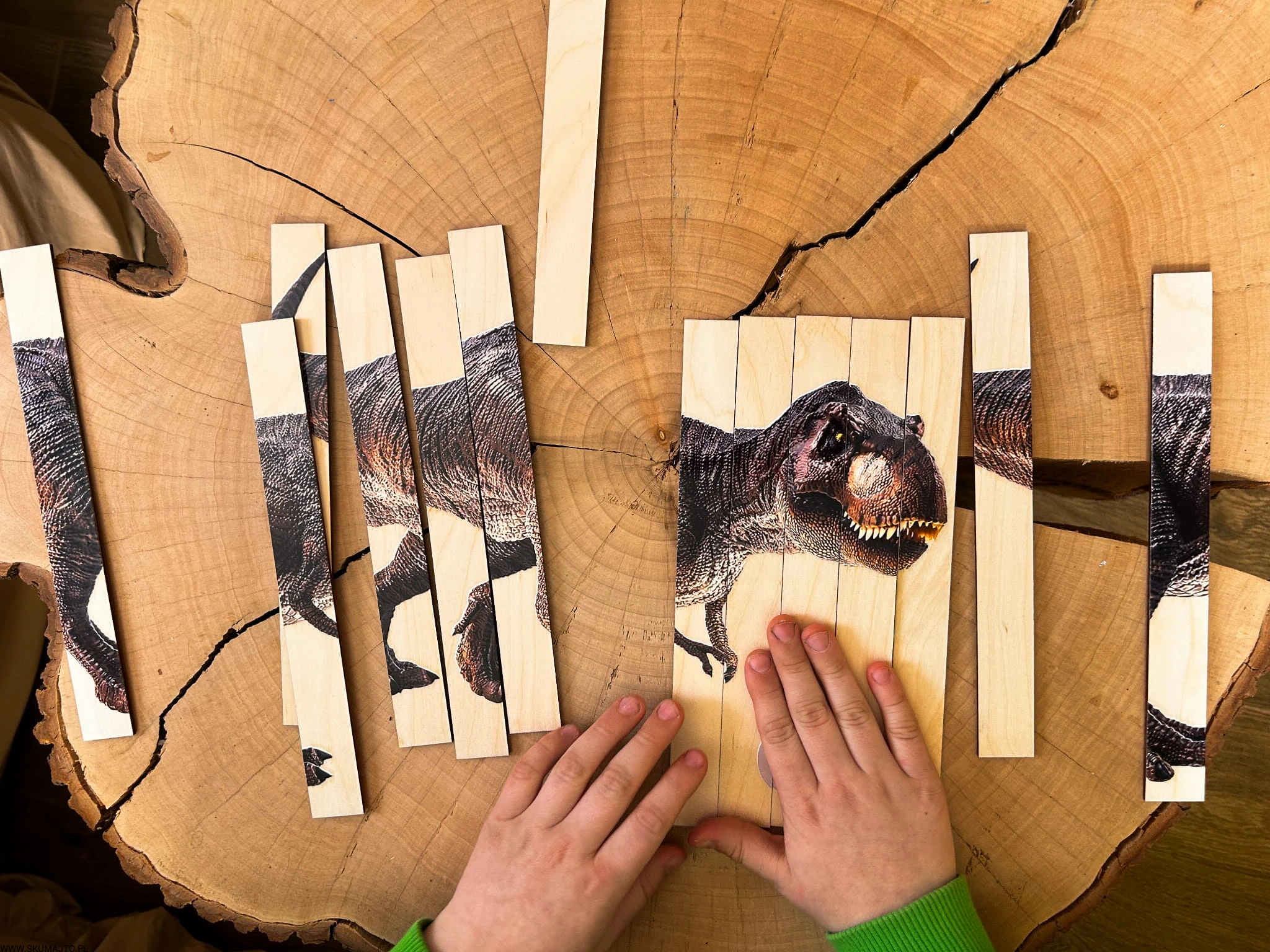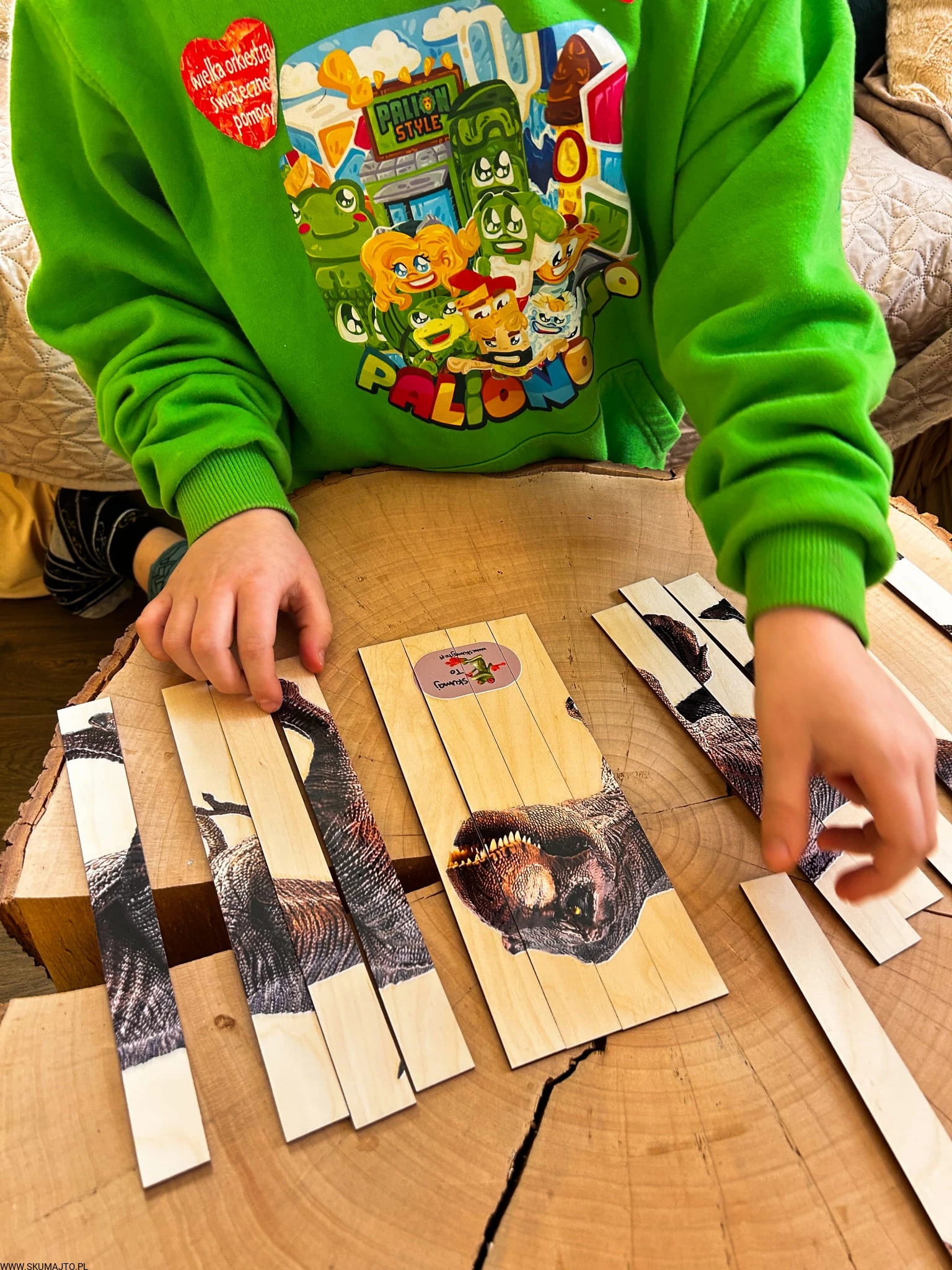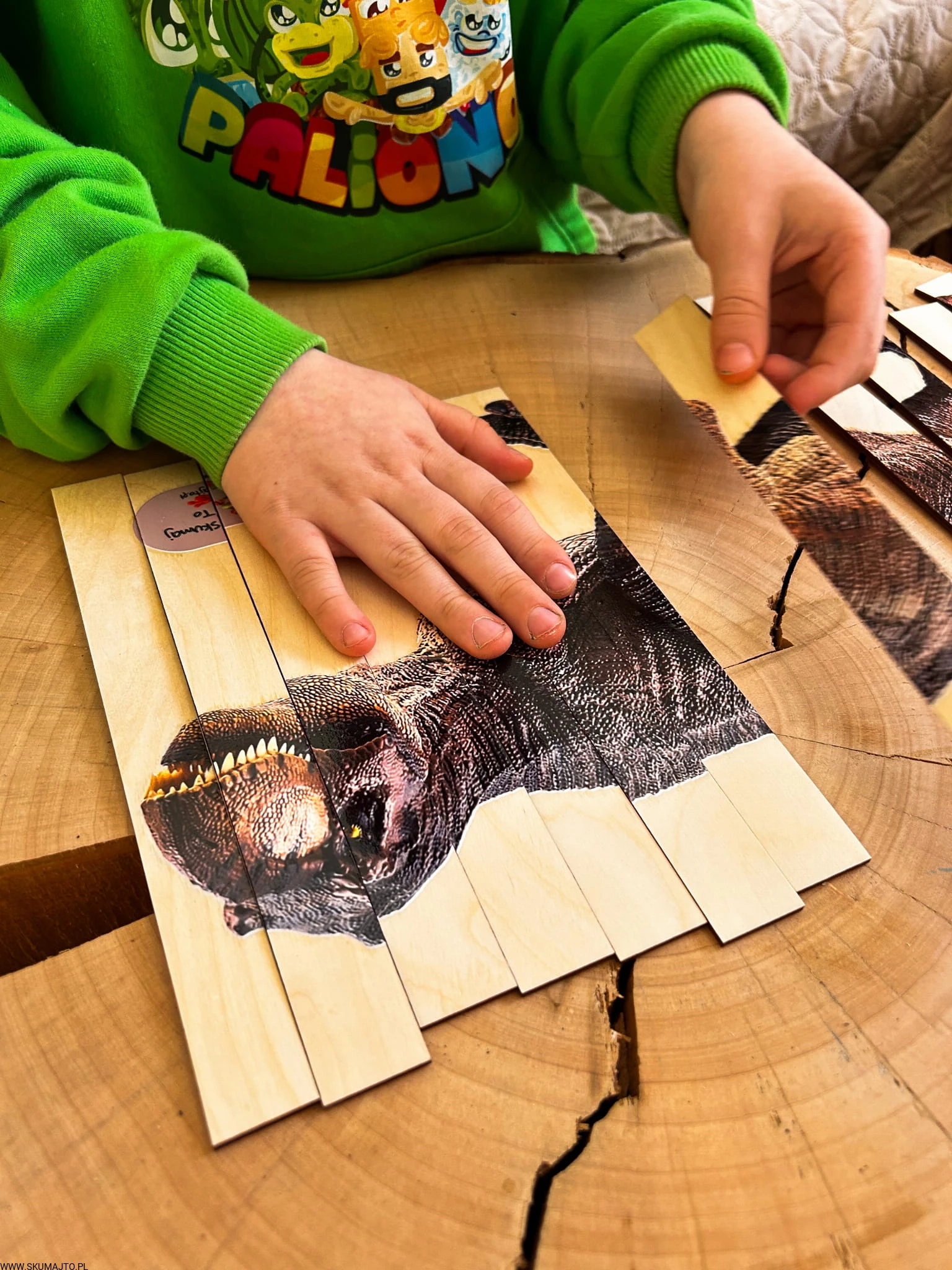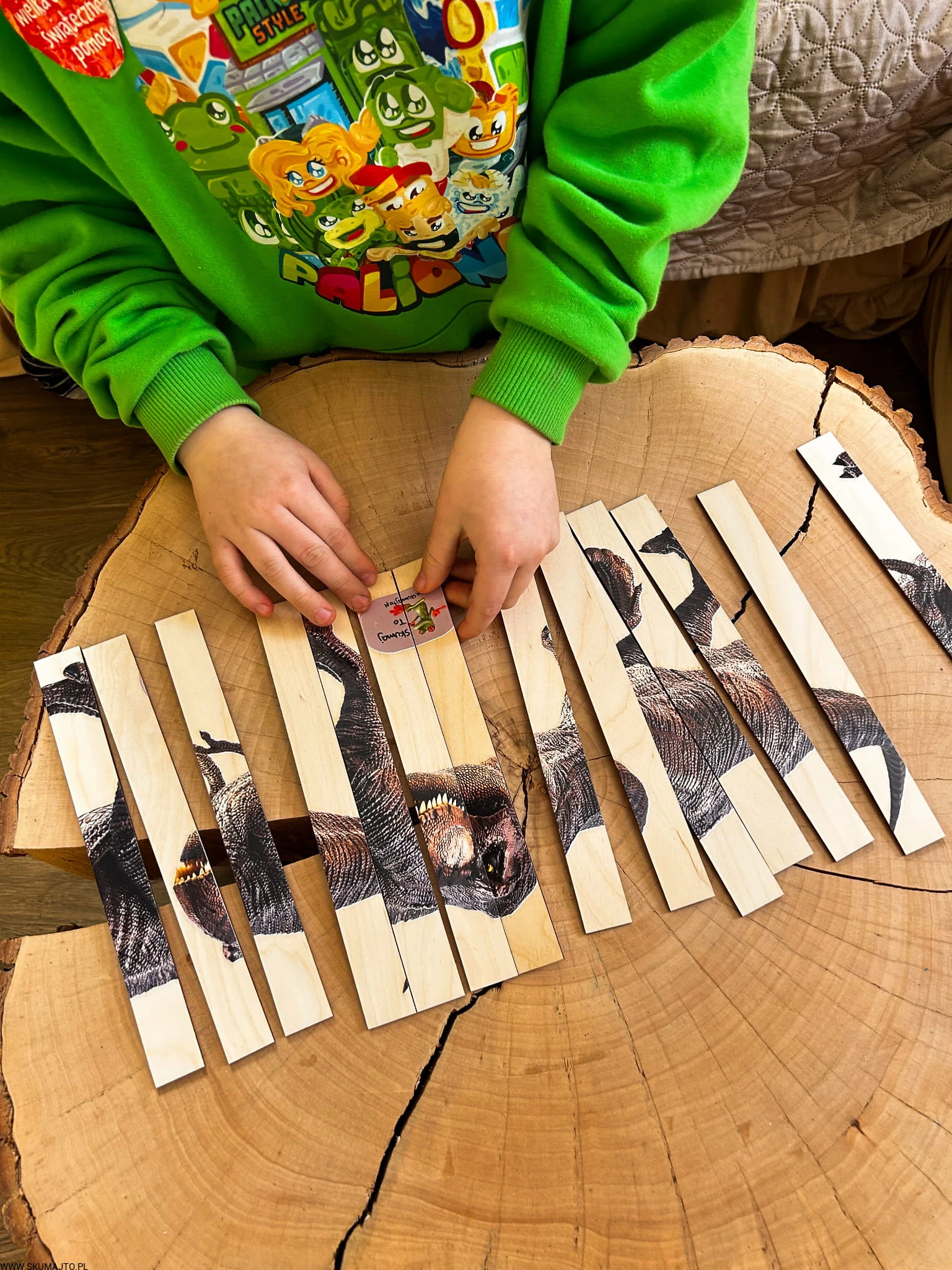 Dziecko dostaje 14 drewnianych pasków z realistycznym nadrukiem dinozaura. Zadanie? Ułożyć je w odpowiedniej kolejności, by stworzyć kompletny obraz tyranozaura. To wcale nie jest takie łatwe – paski są podobne do siebie, a ich kolejność wymaga spostrzegawczości i cierpliwości.
