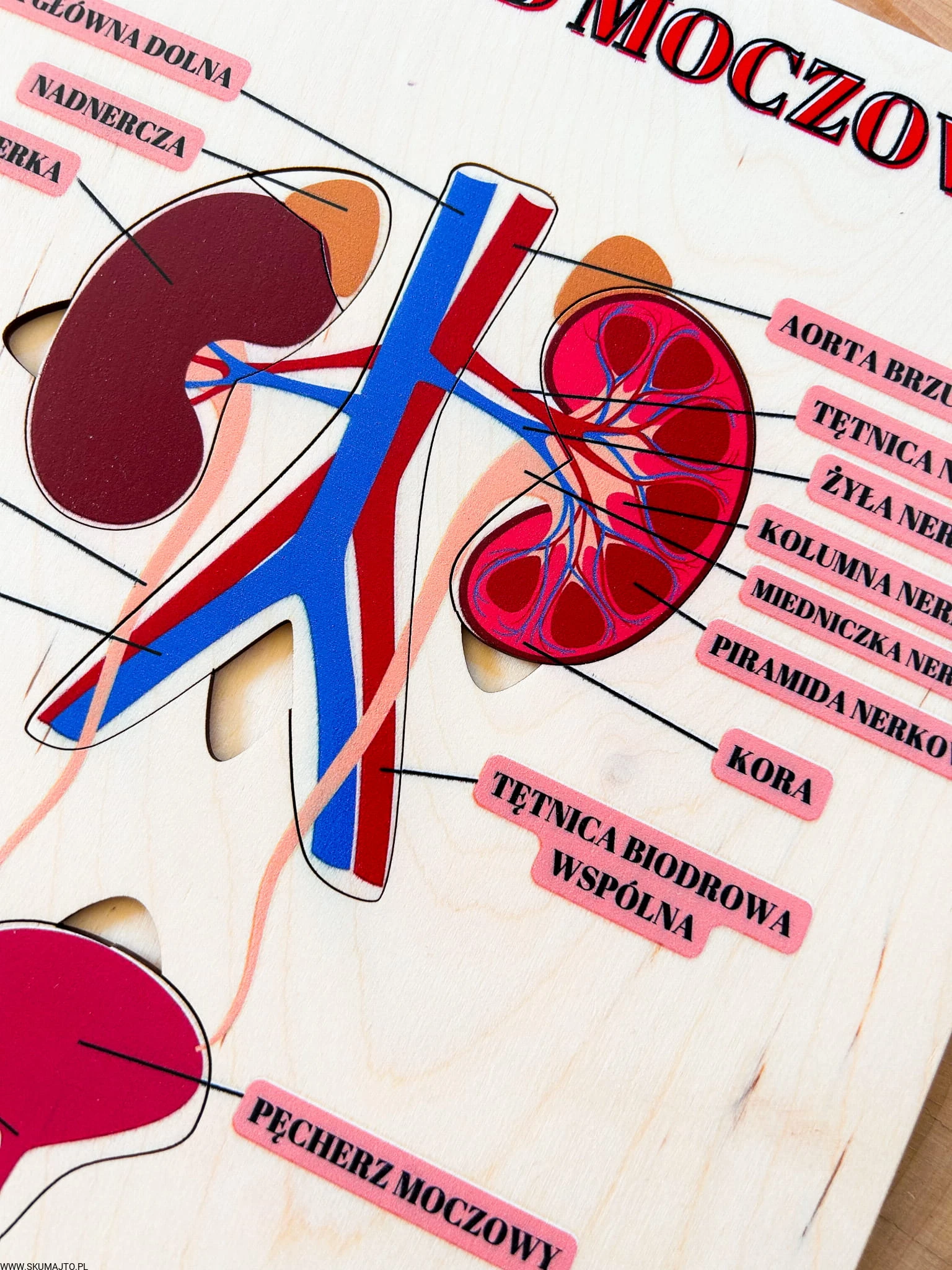 - Realistyczny Nadruk: Szczegółowy, kolorowy nadruk na sklejce wiernie odwzorowuje budowę układu moczowego, co wspiera naukę i rozwija zainteresowanie anatomią.