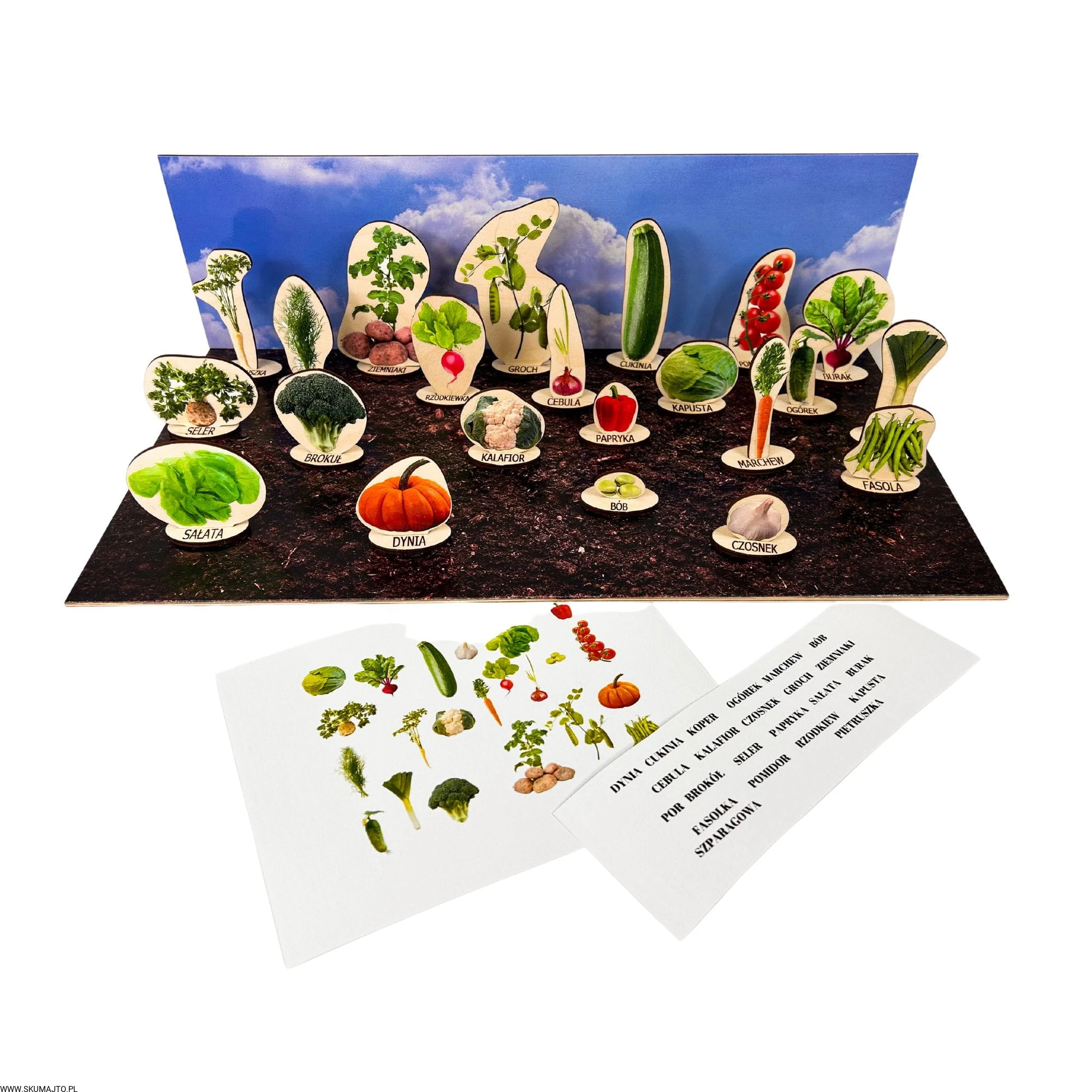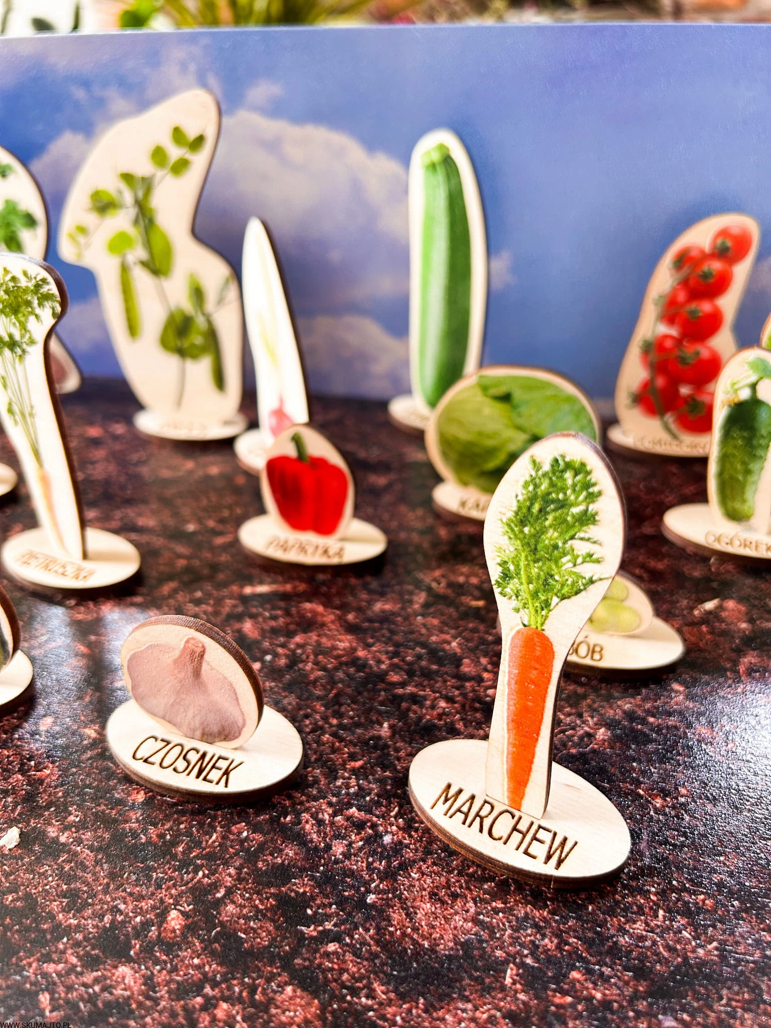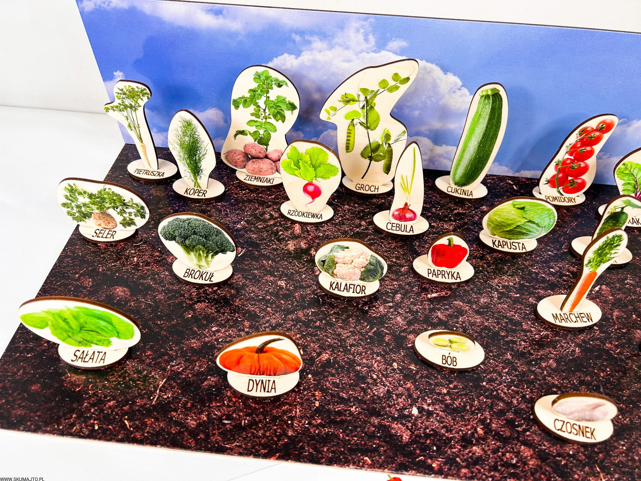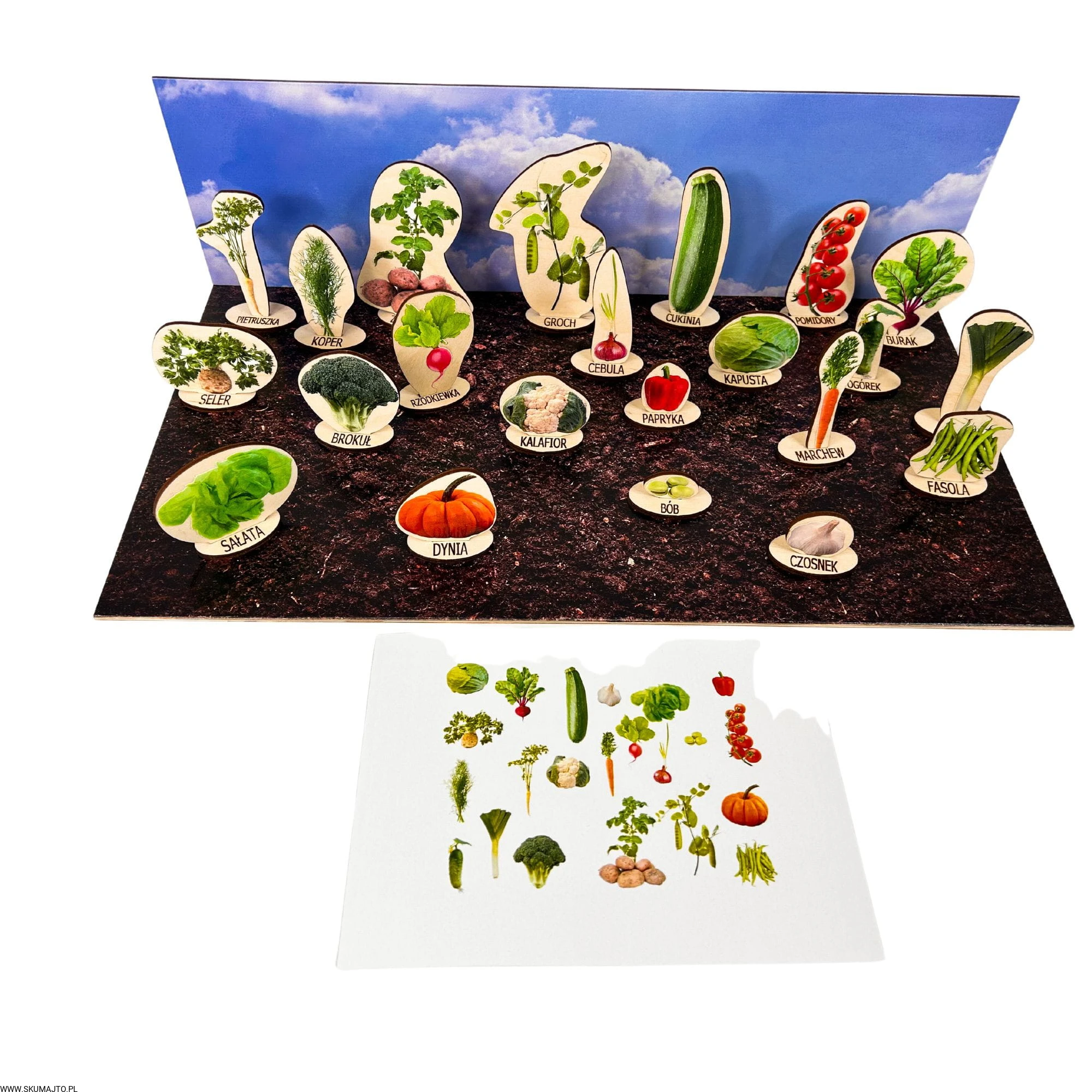 W ogródku, układanka drewniana o warzywach, odwzorowywanie, stojące elementy na kolorowej podstawie
