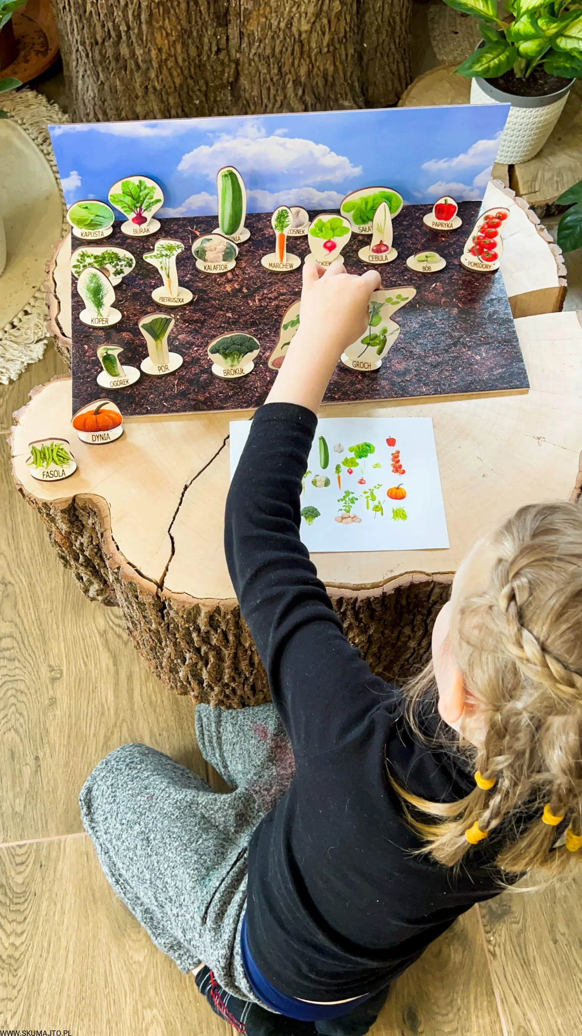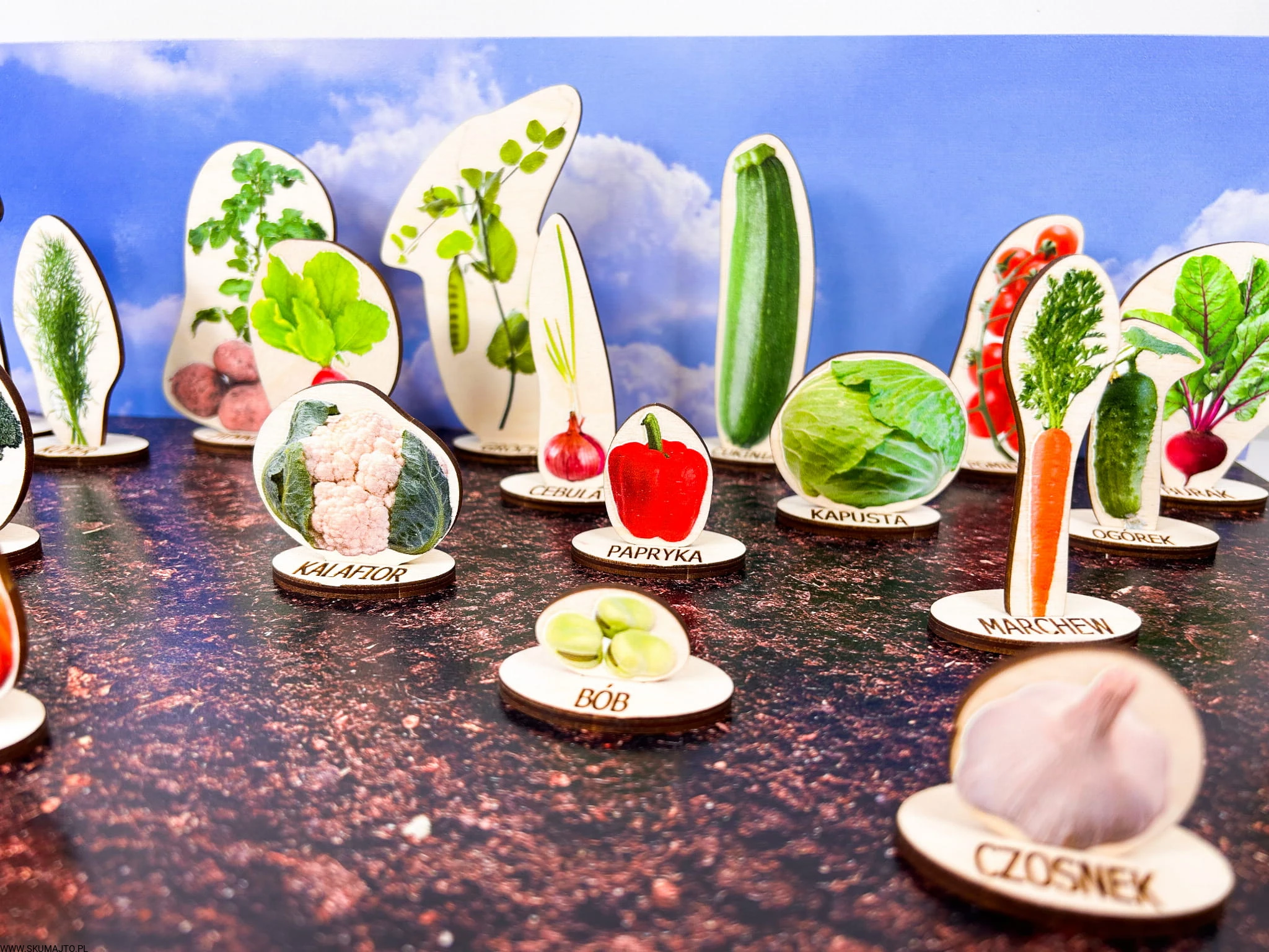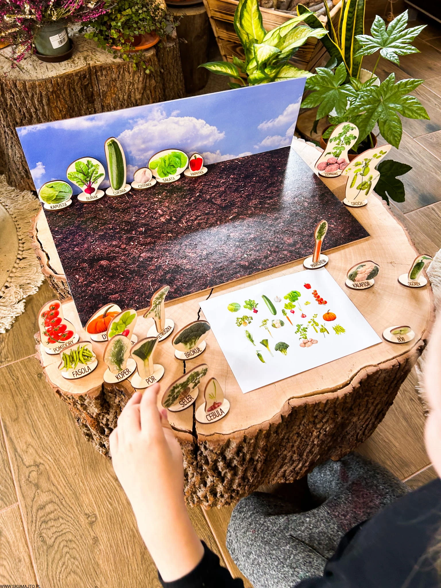 W ogródku, układanka drewniana o warzywach, odwzorowywanie, stojące elementy na kolorowej podstawie