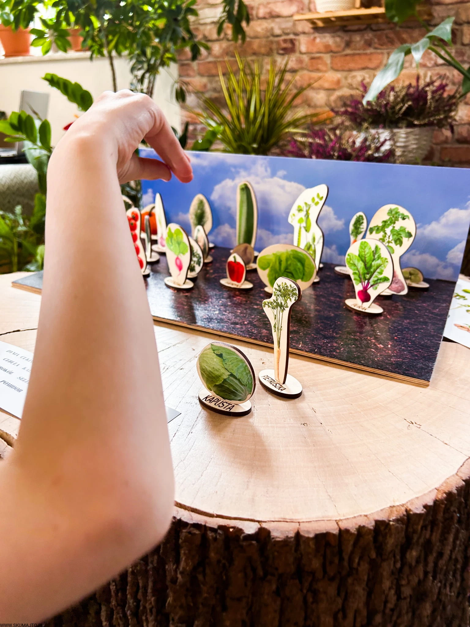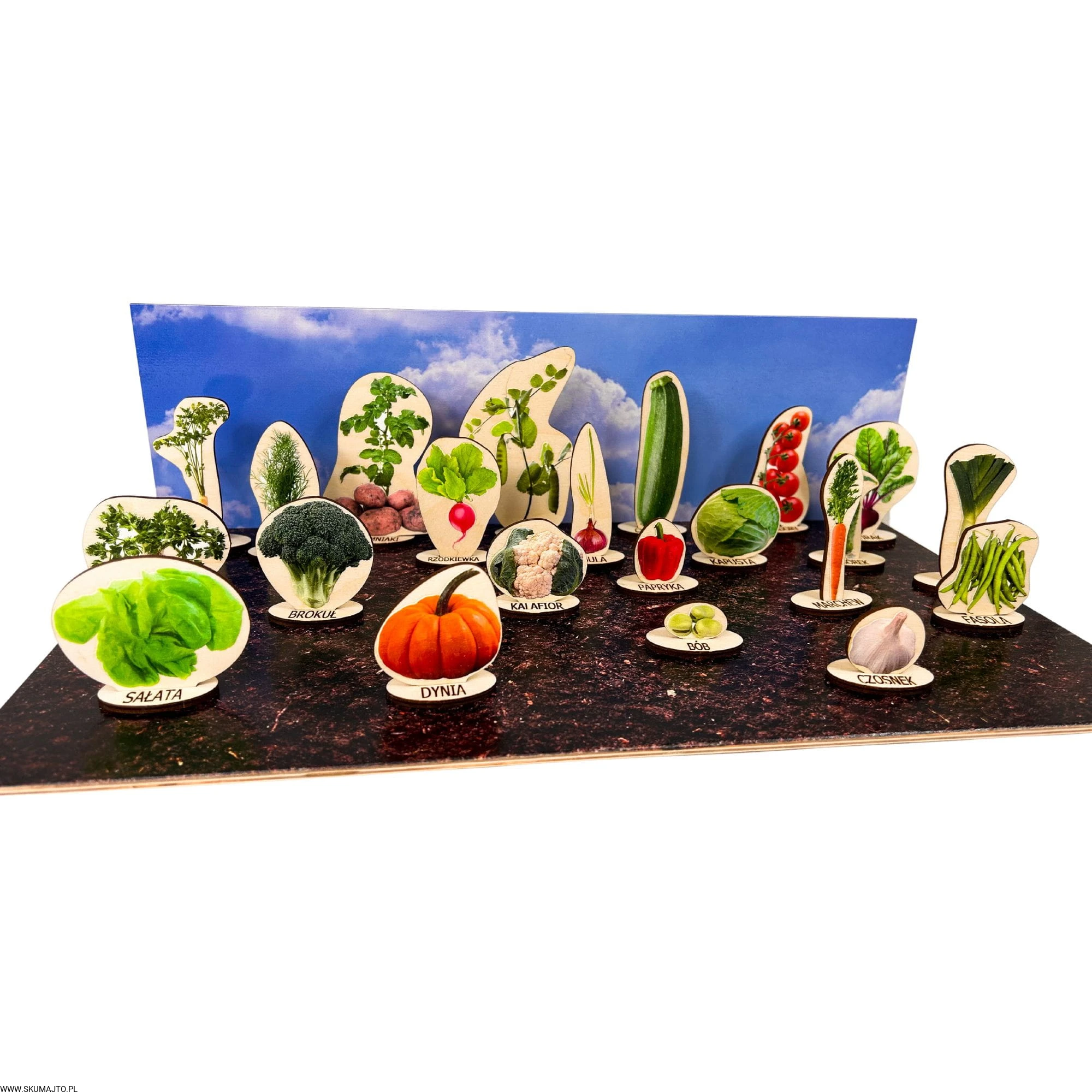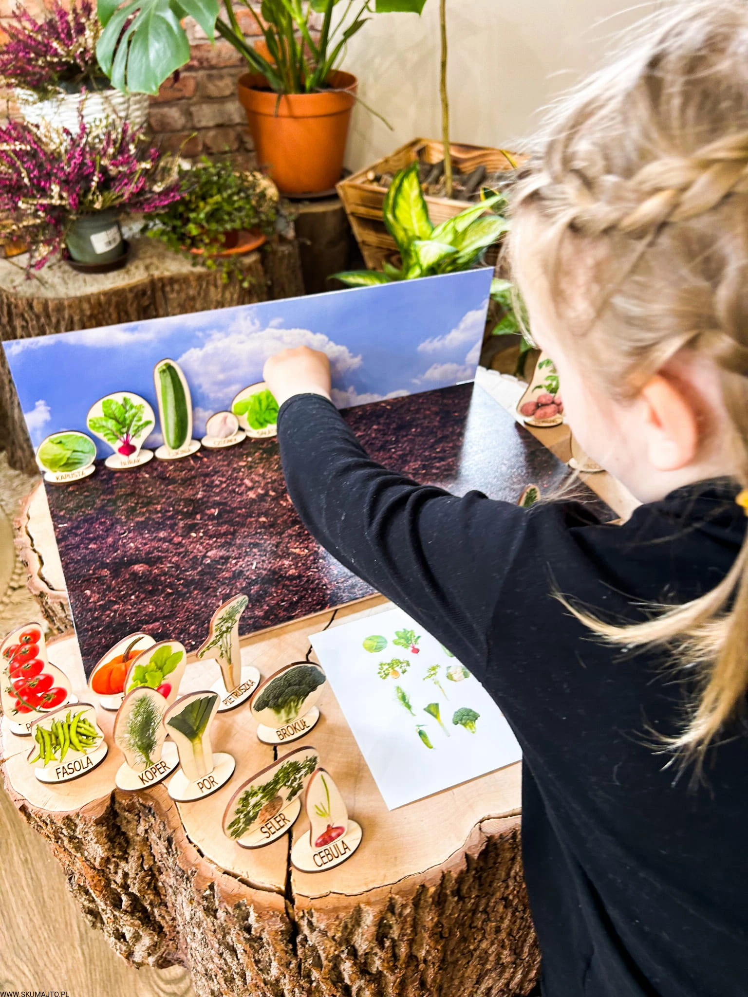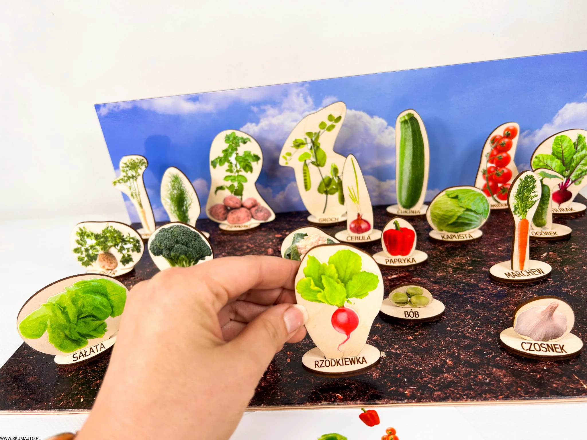 W ogródku, układanka drewniana o warzywach, odwzorowywanie, stojące elementy na kolorowej podstawie