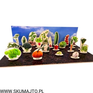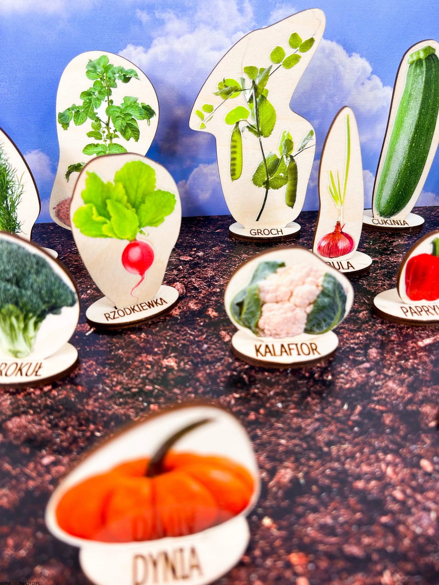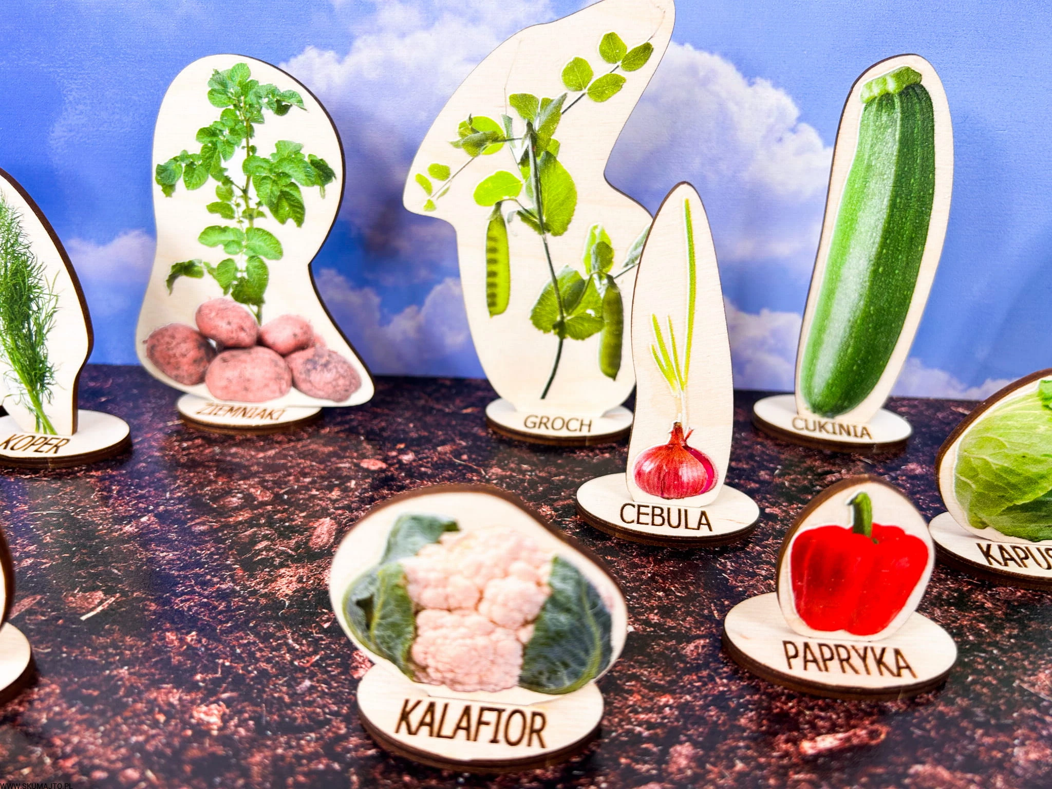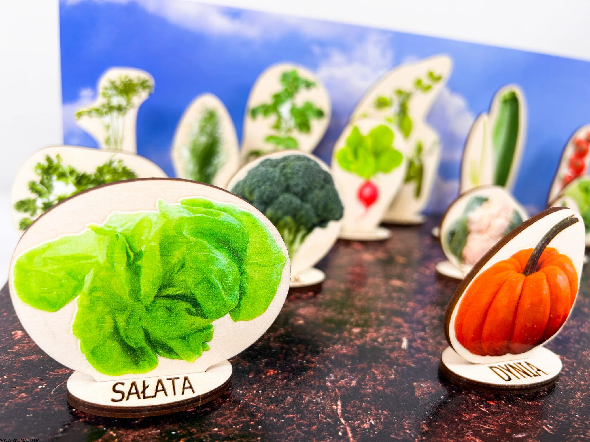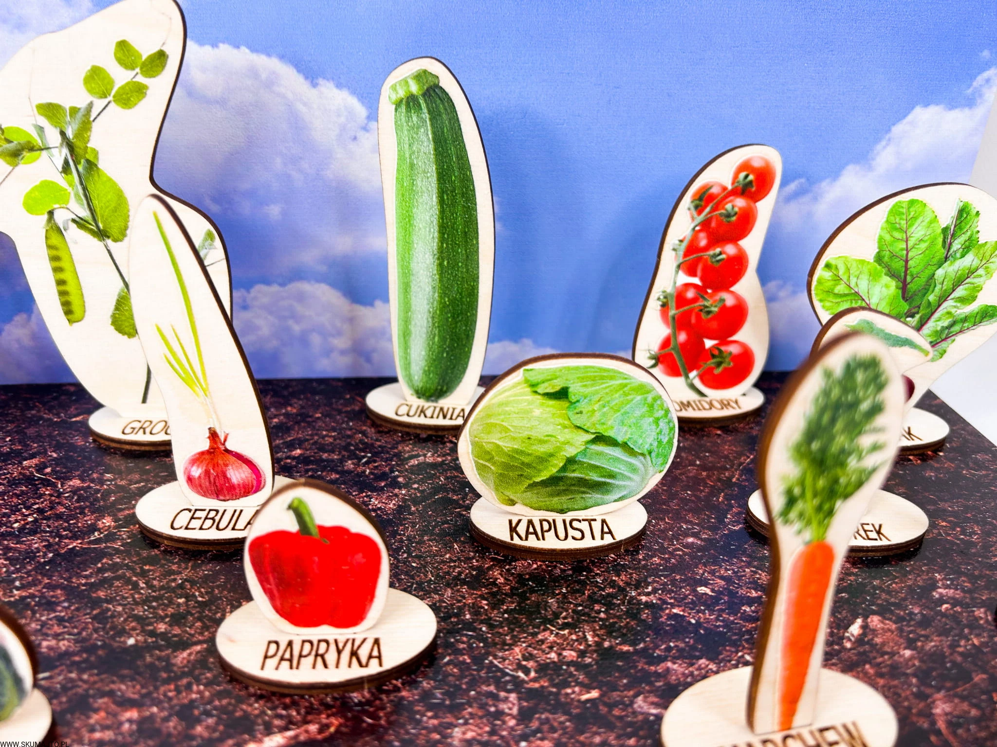- Każde warzywo ma swój podpis, co wspomaga naukę czytania.