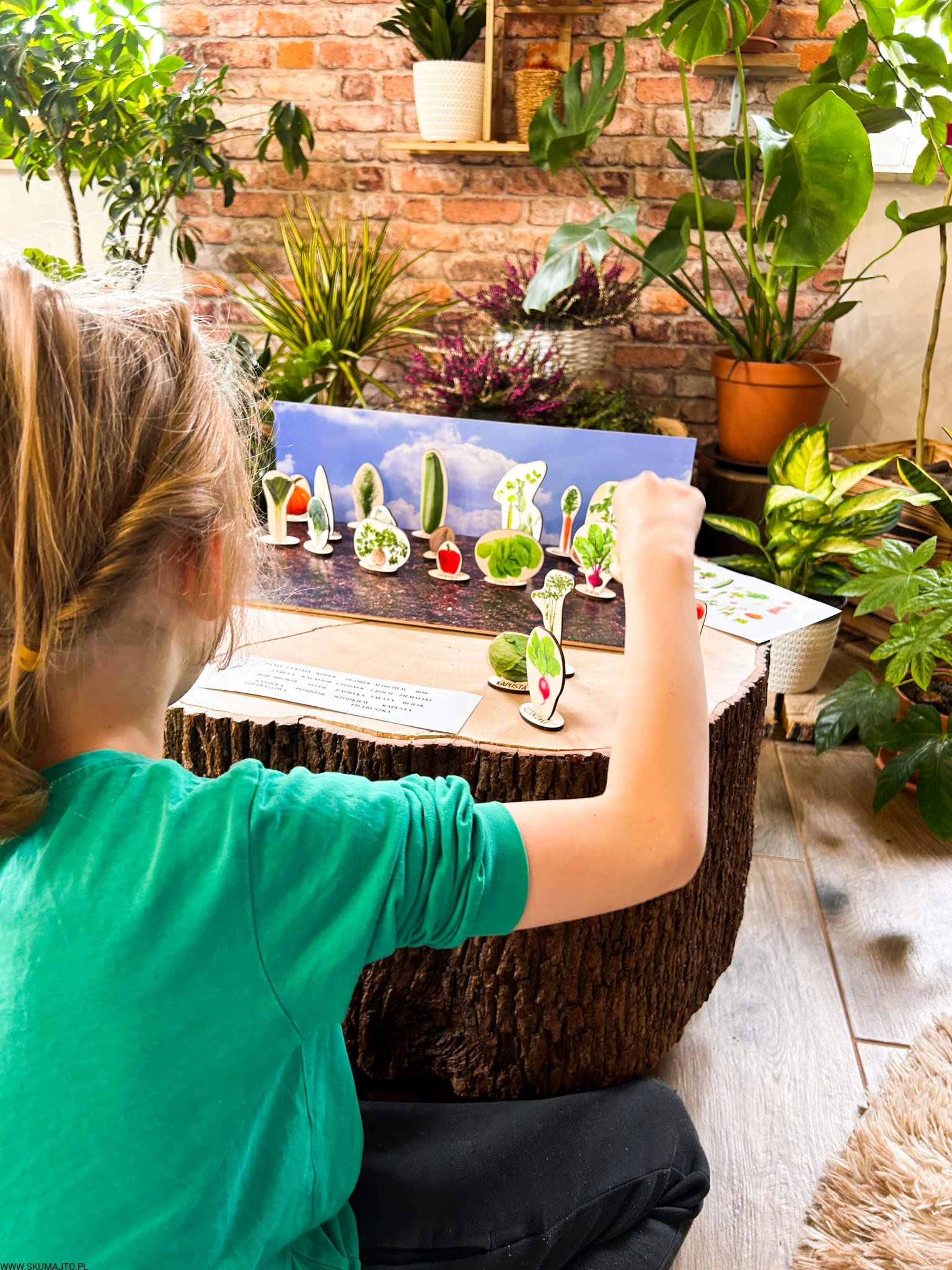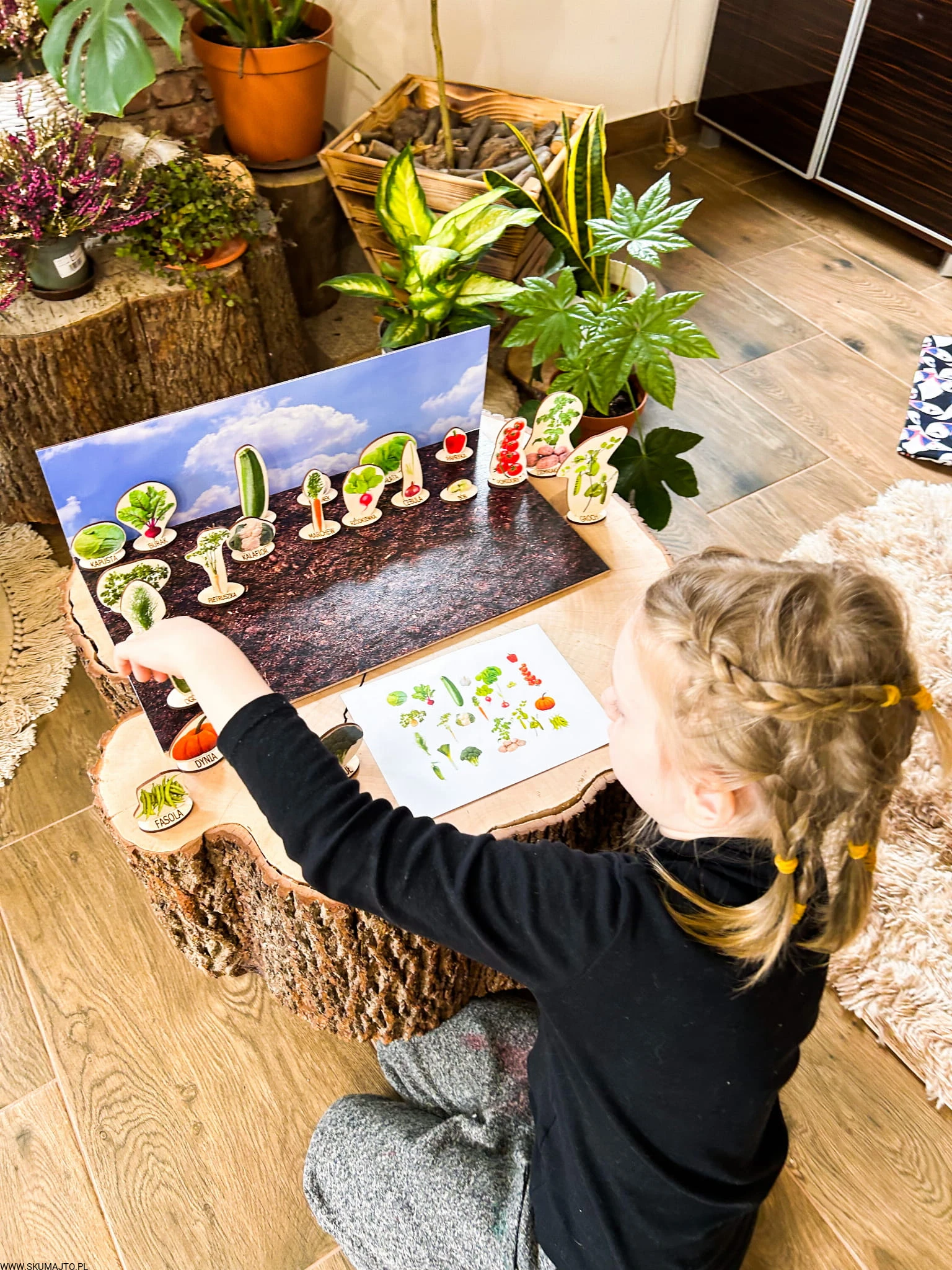 - Specjalnie zaprojektowane karty do odwzorowywania pozwalają dziecku na tworzenie wzorów z warzyw na grządce.