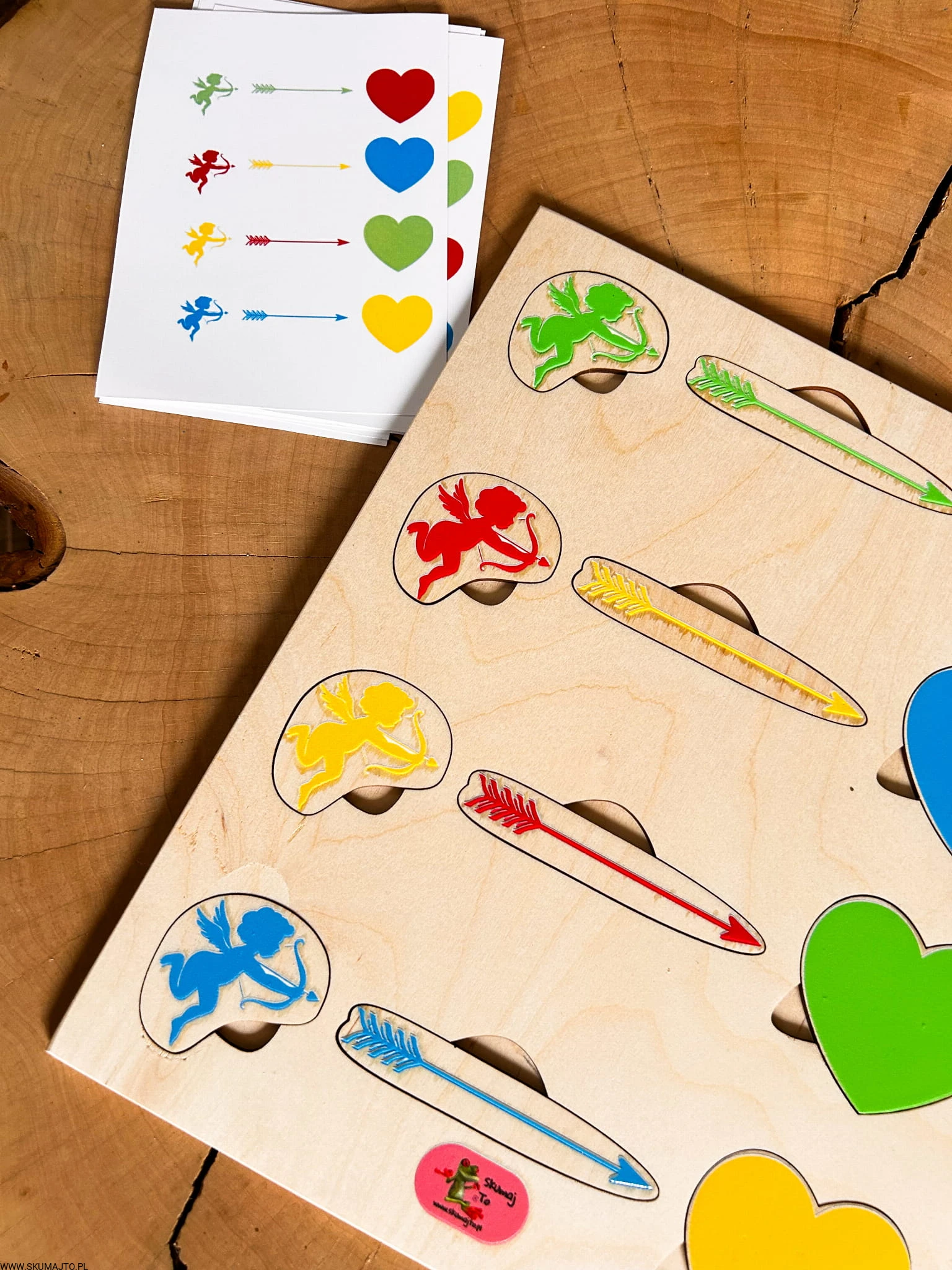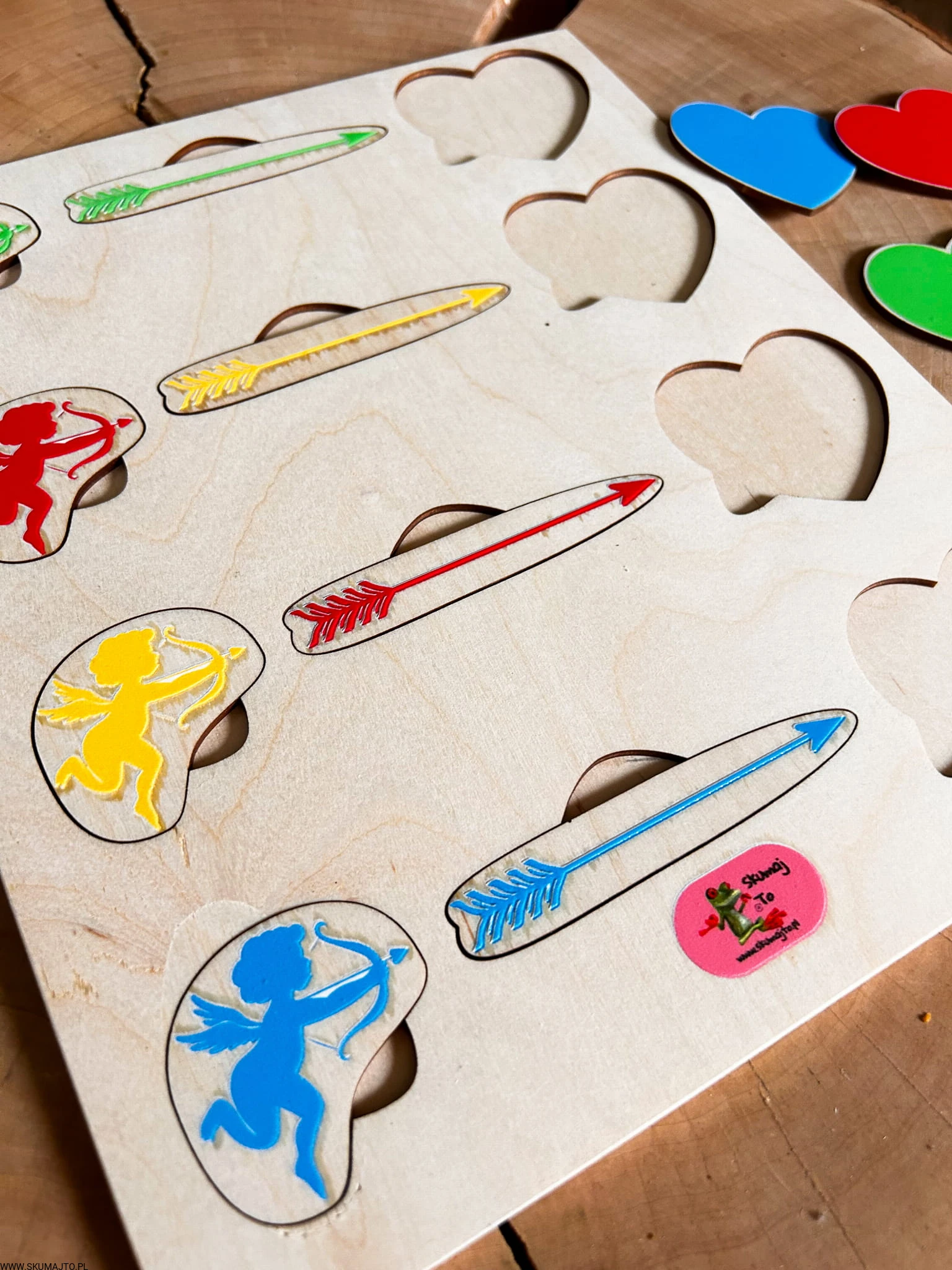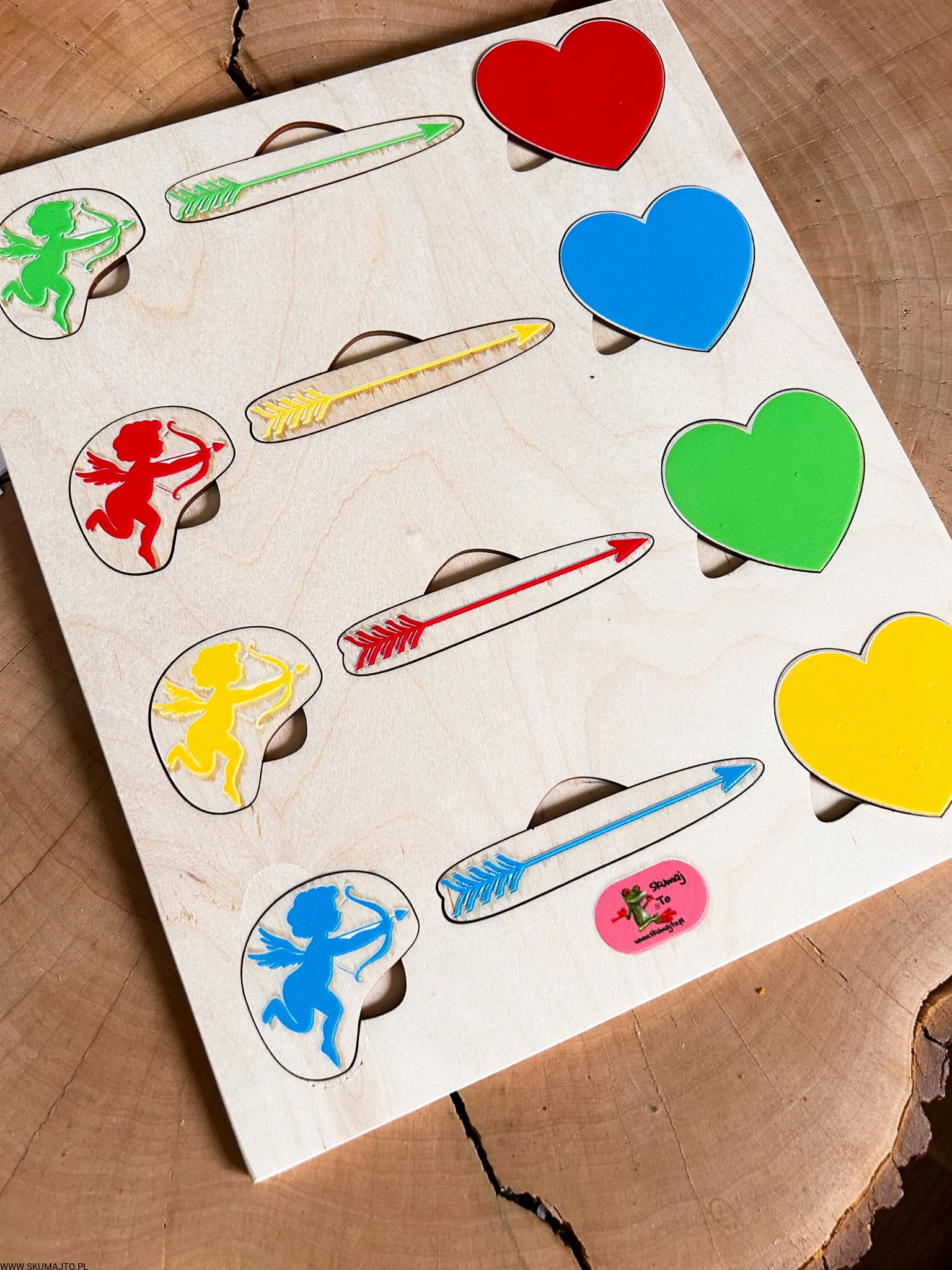 To nie jest zwykła układanka. To magiczna historia pełna amorków, strzał i serduszek, które można dowolnie układać i dopasowywać. Dzięki niej maluchy uczą się nie tylko rozpoznawania kolorów i kształtów, ale także rozwijają swoją pamięć wzrokową i koordynację ręka-oko.