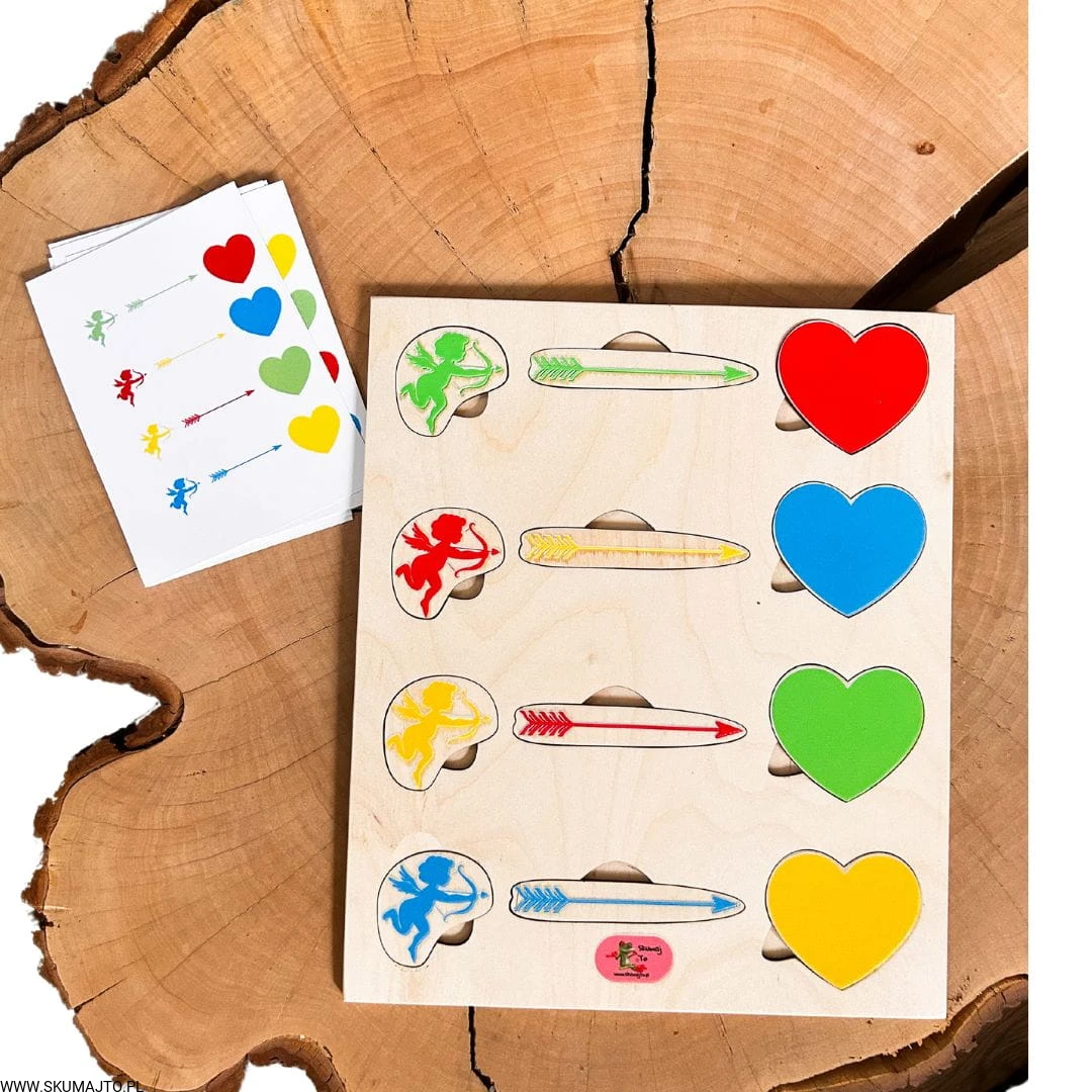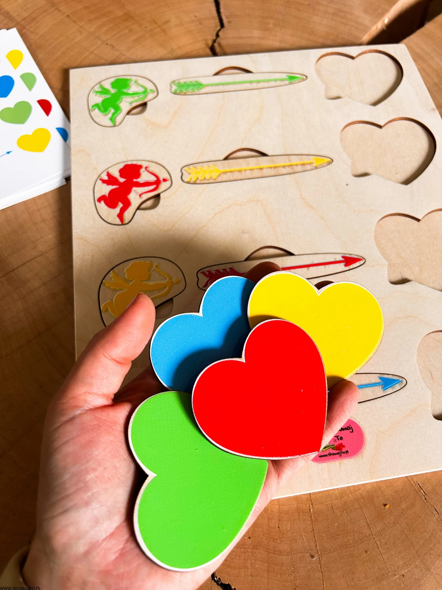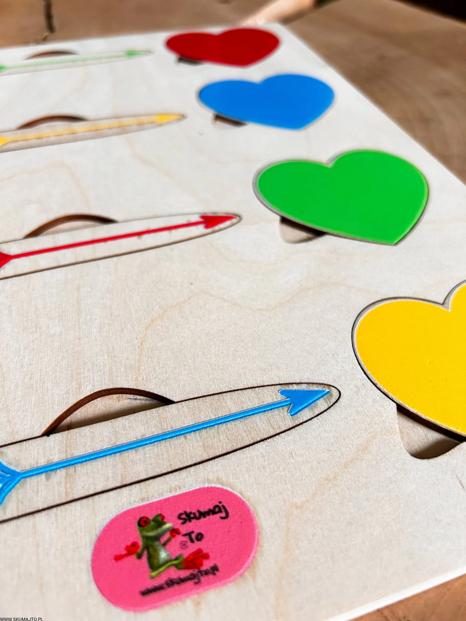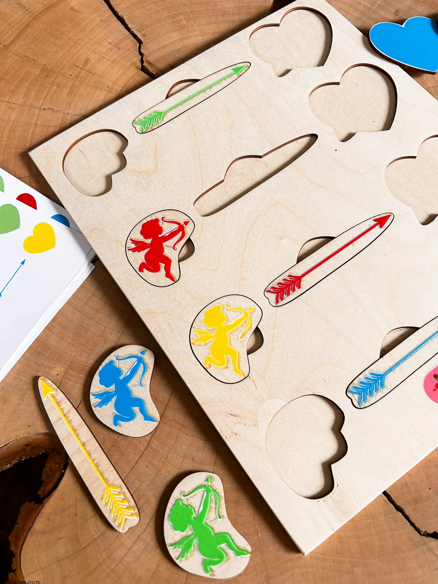 To nie jest zwykła układanka. To magiczna historia pełna amorków, strzał i serduszek, które można dowolnie układać i dopasowywać. Dzięki niej maluchy uczą się nie tylko rozpoznawania kolorów i kształtów, ale także rozwijają swoją pamięć wzrokową i koordynację ręka-oko.
