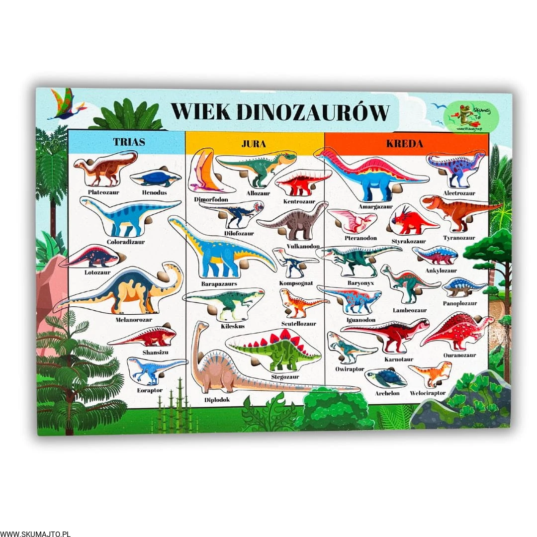 To nie jest zwykła układanka. To połączenie nauki, logicznego myślenia i świetnej zabawy. Dziecko nie tylko dopasowuje kształty, ale także odkrywa tajemnice dinozaurów, poznając ich nazwy i epoki, w których żyły.