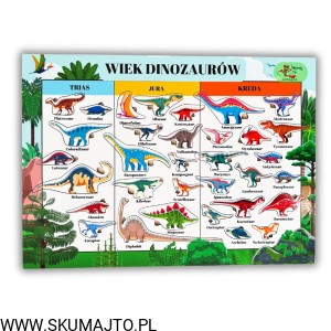 ✔ 40 x 35 cm – duża, kolorowa plansza podzielona na trzy epoki (trias, jurę i kredę)