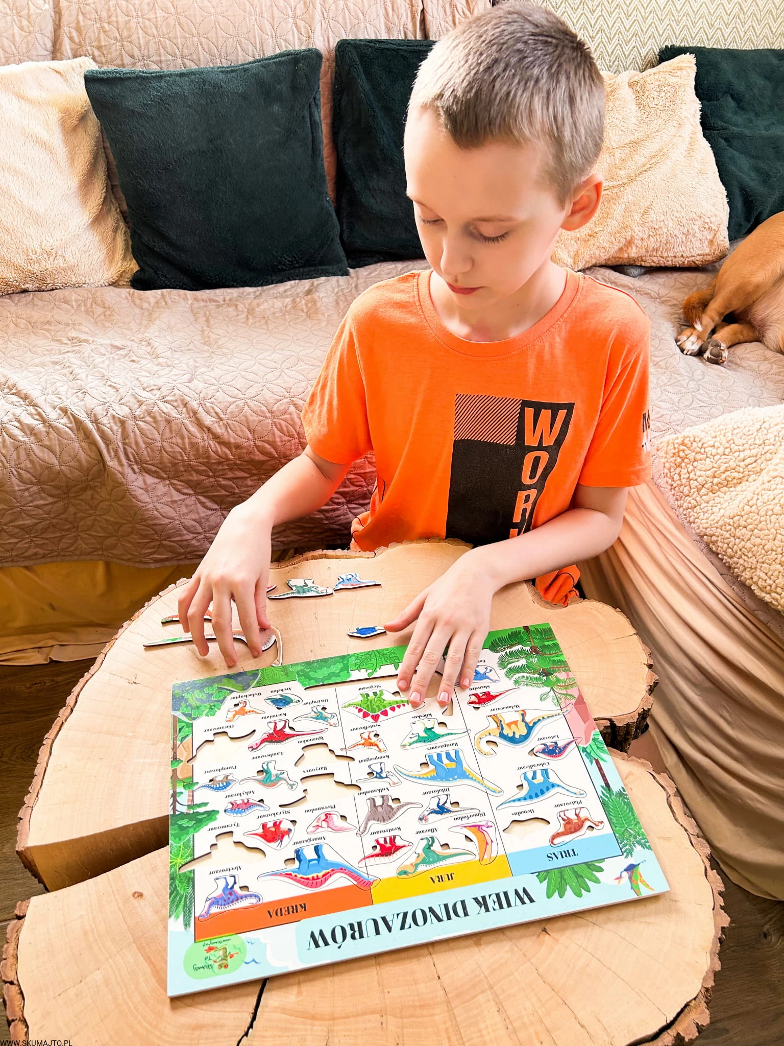 To jak zabawa w detektywa – gdzie powinien trafić tyranozaur? A diplodok? Odpowiedzi są zapisane na planszy, ale żeby poprawnie ułożyć wszystkie elementy, trzeba dobrze się przyjrzeć i zapamiętać, kto żył kiedy!