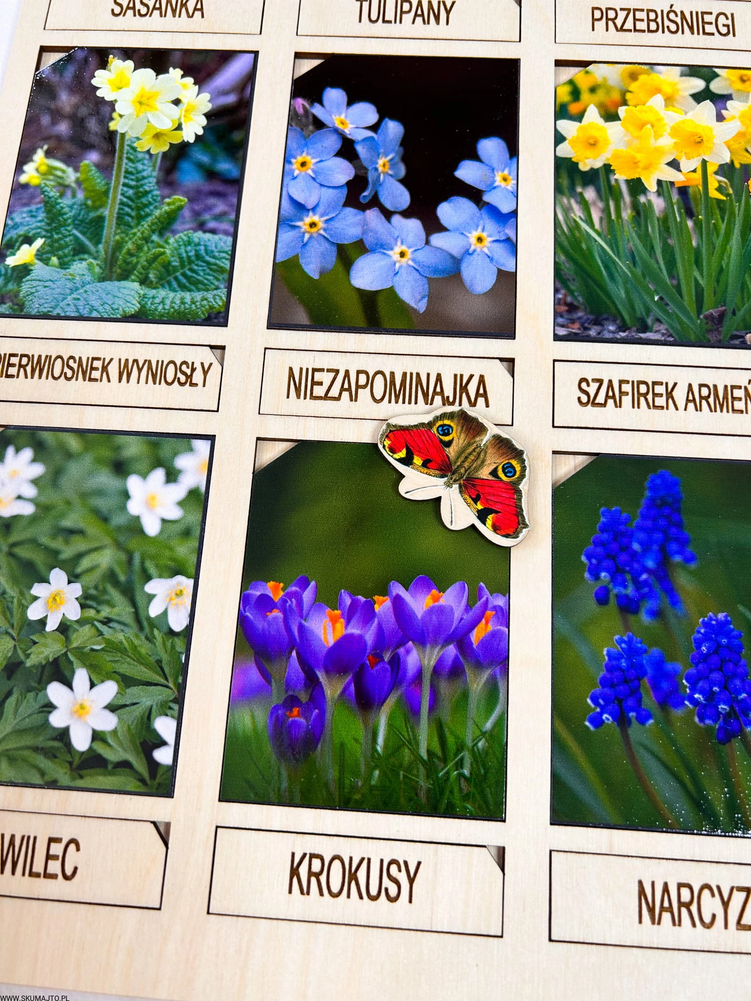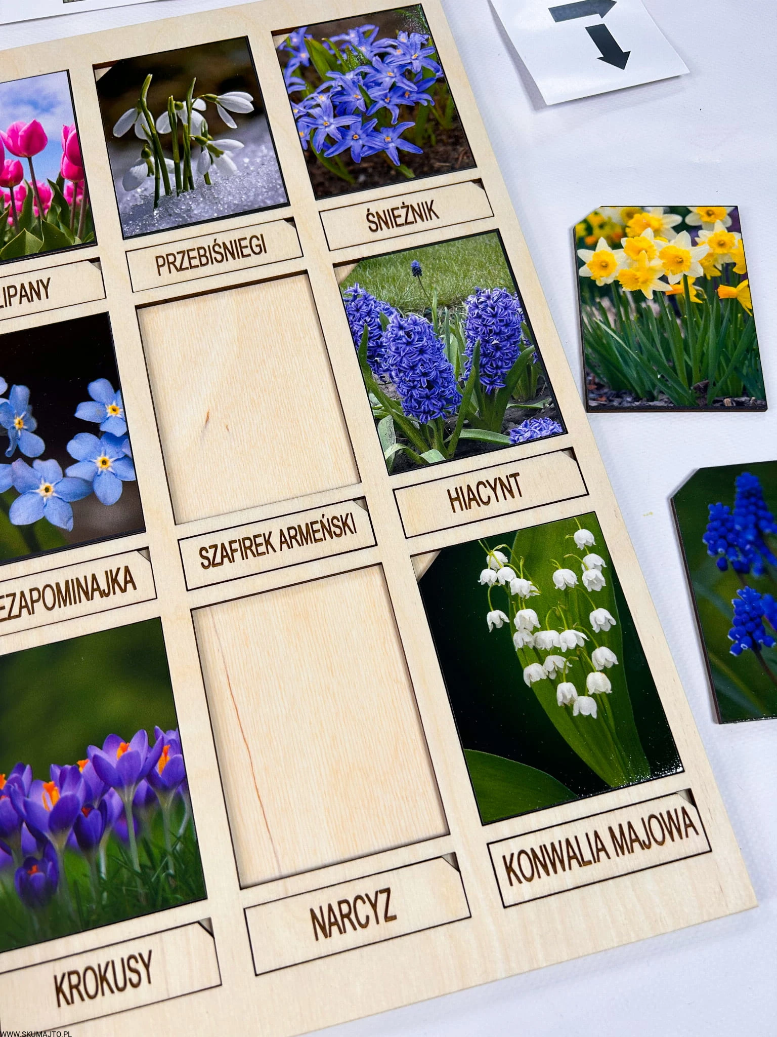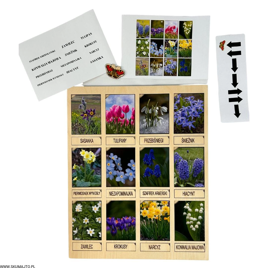 Wiosenne kwiaty, drewniana układanka o kwiatach, kodowanie, odwzorowywanie