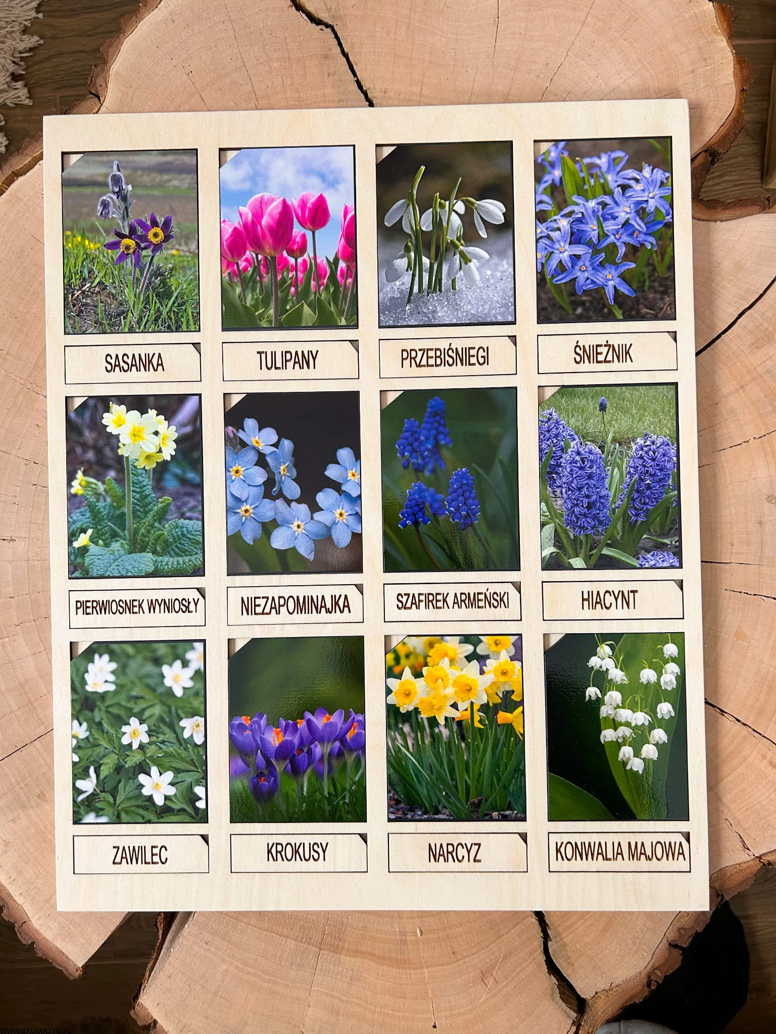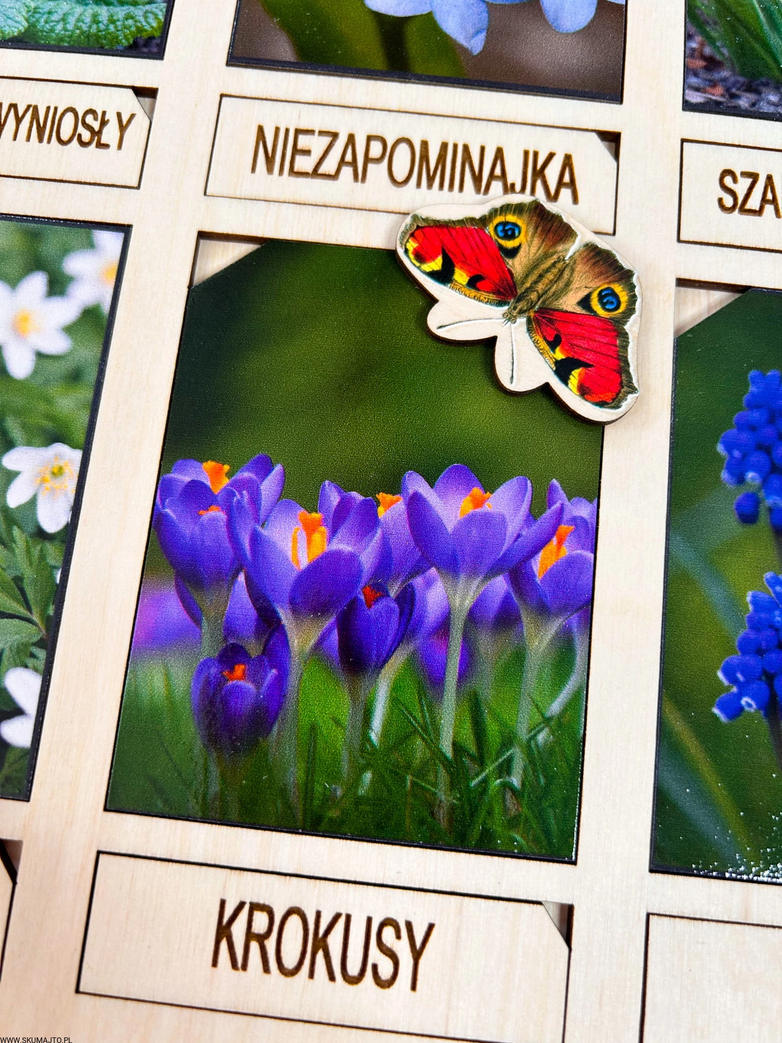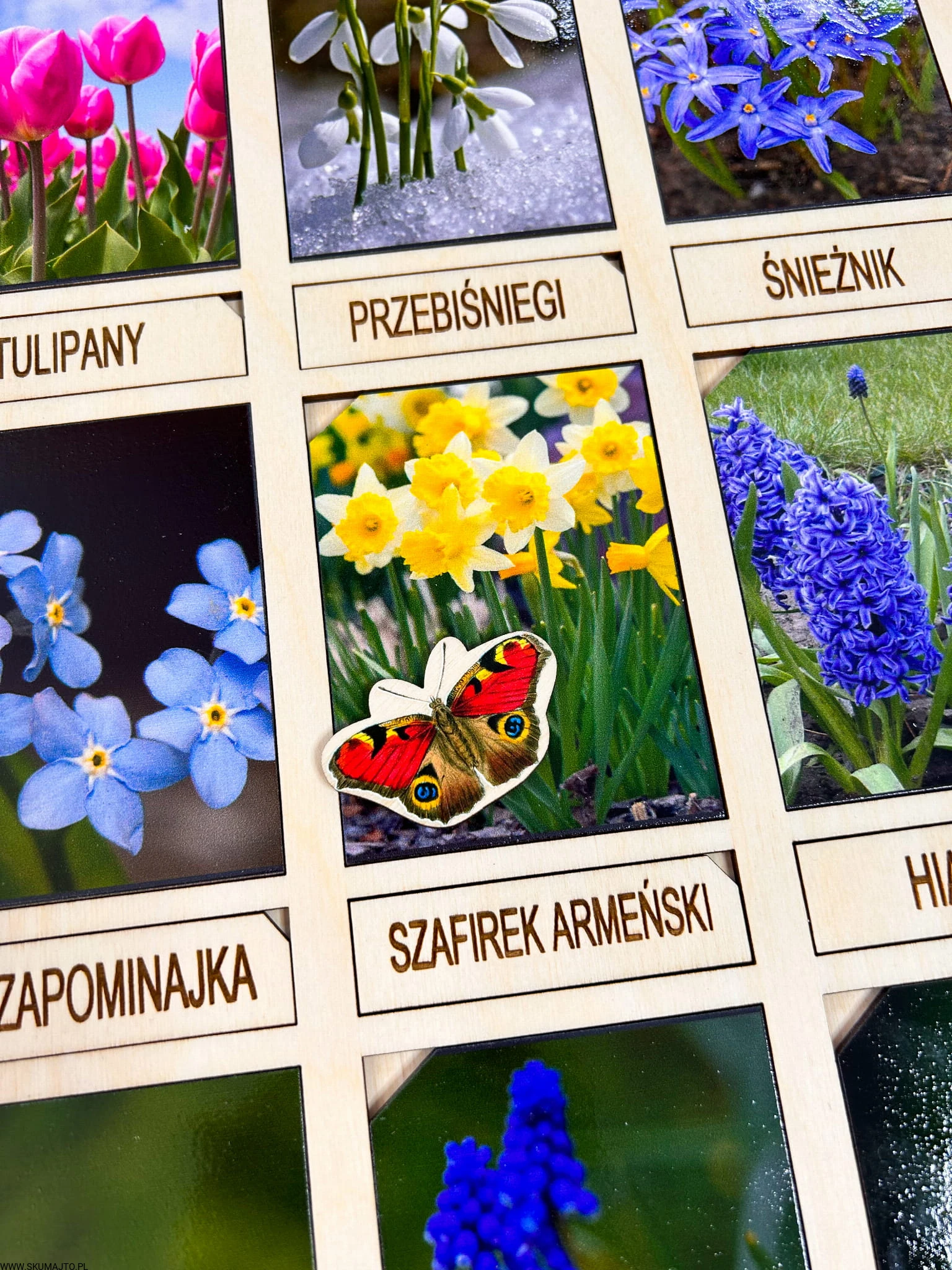 Wiosenne kwiaty, drewniana układanka o kwiatach, kodowanie, odwzorowywanie