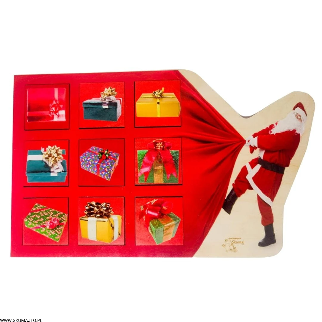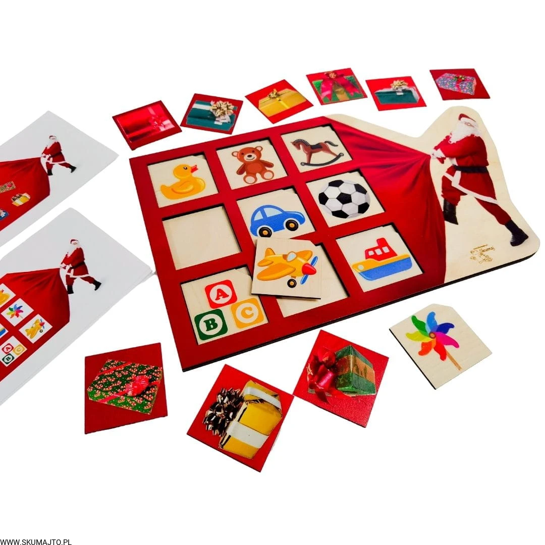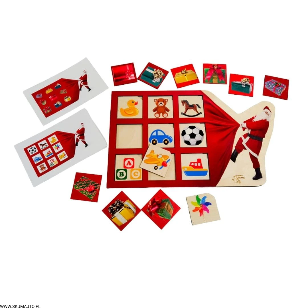 Worek Mikołaja, drewniana układanka, dwie warstwy, prezenty świąteczne, odwzorowywanie