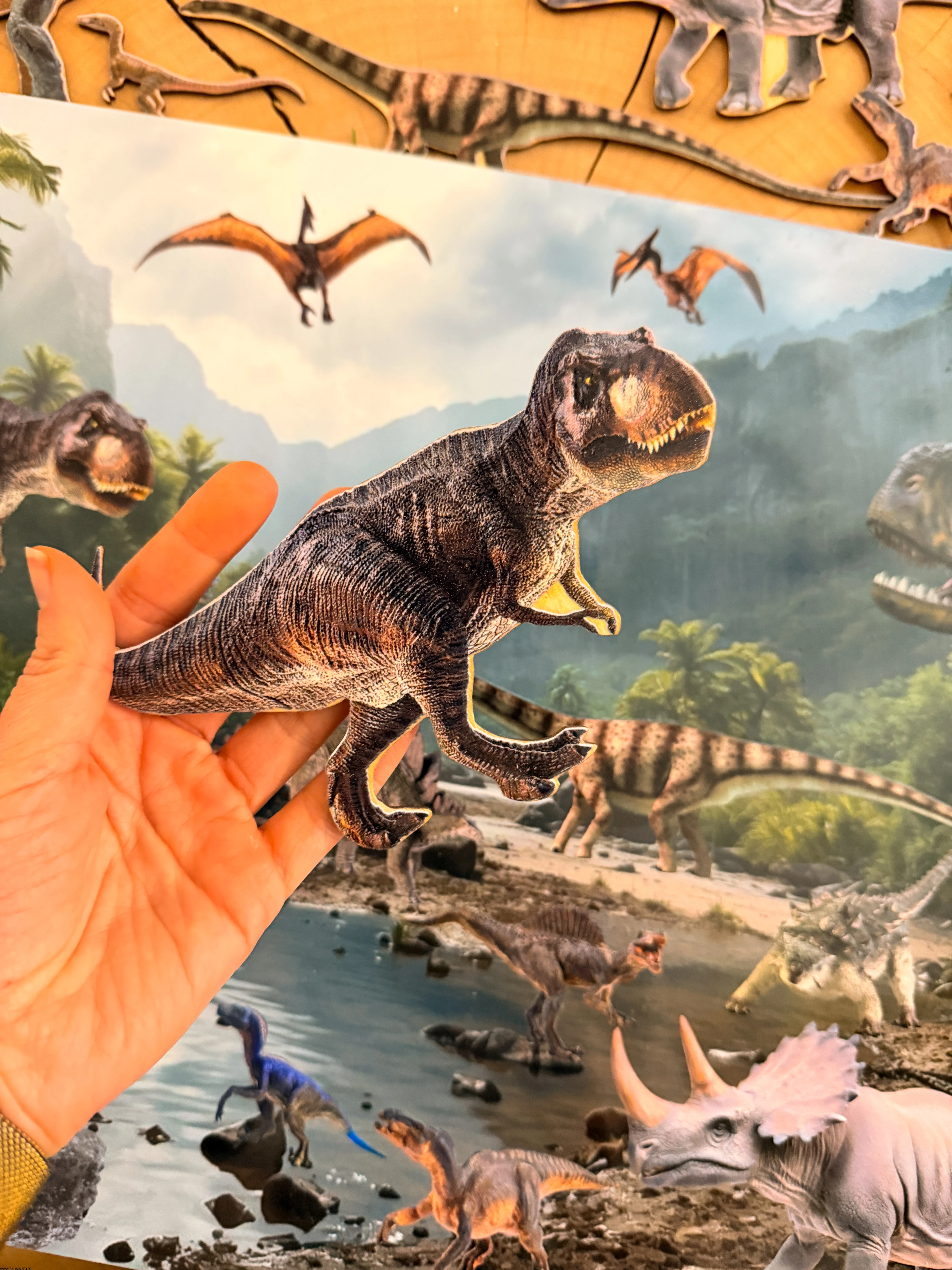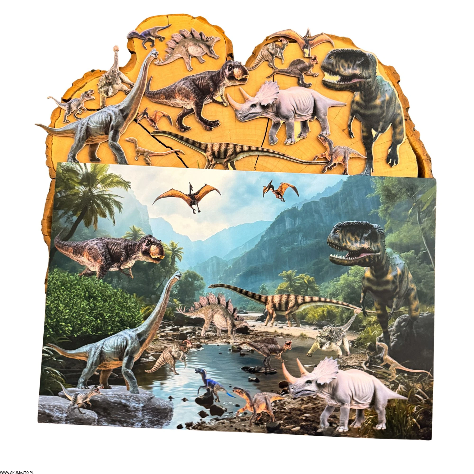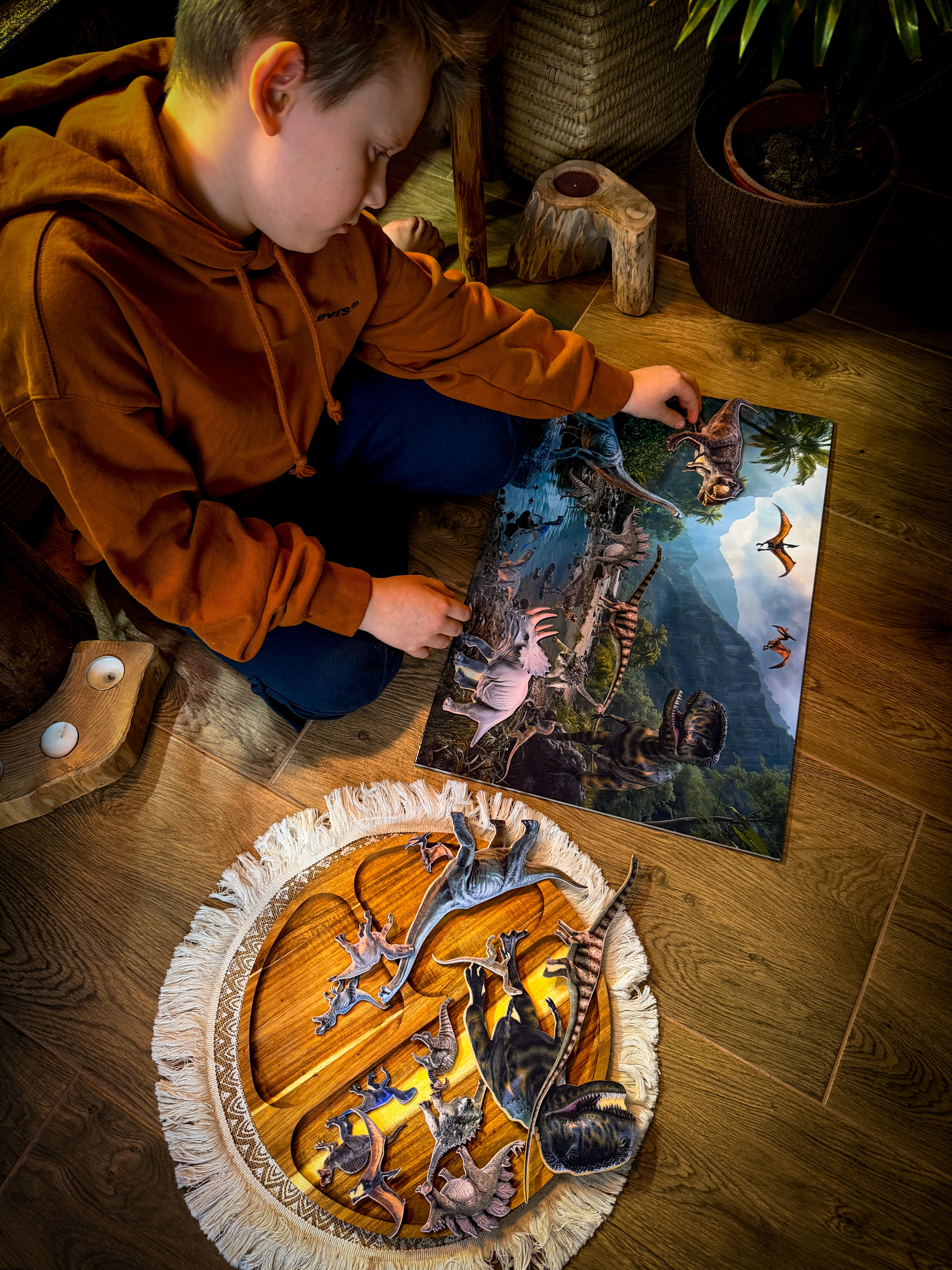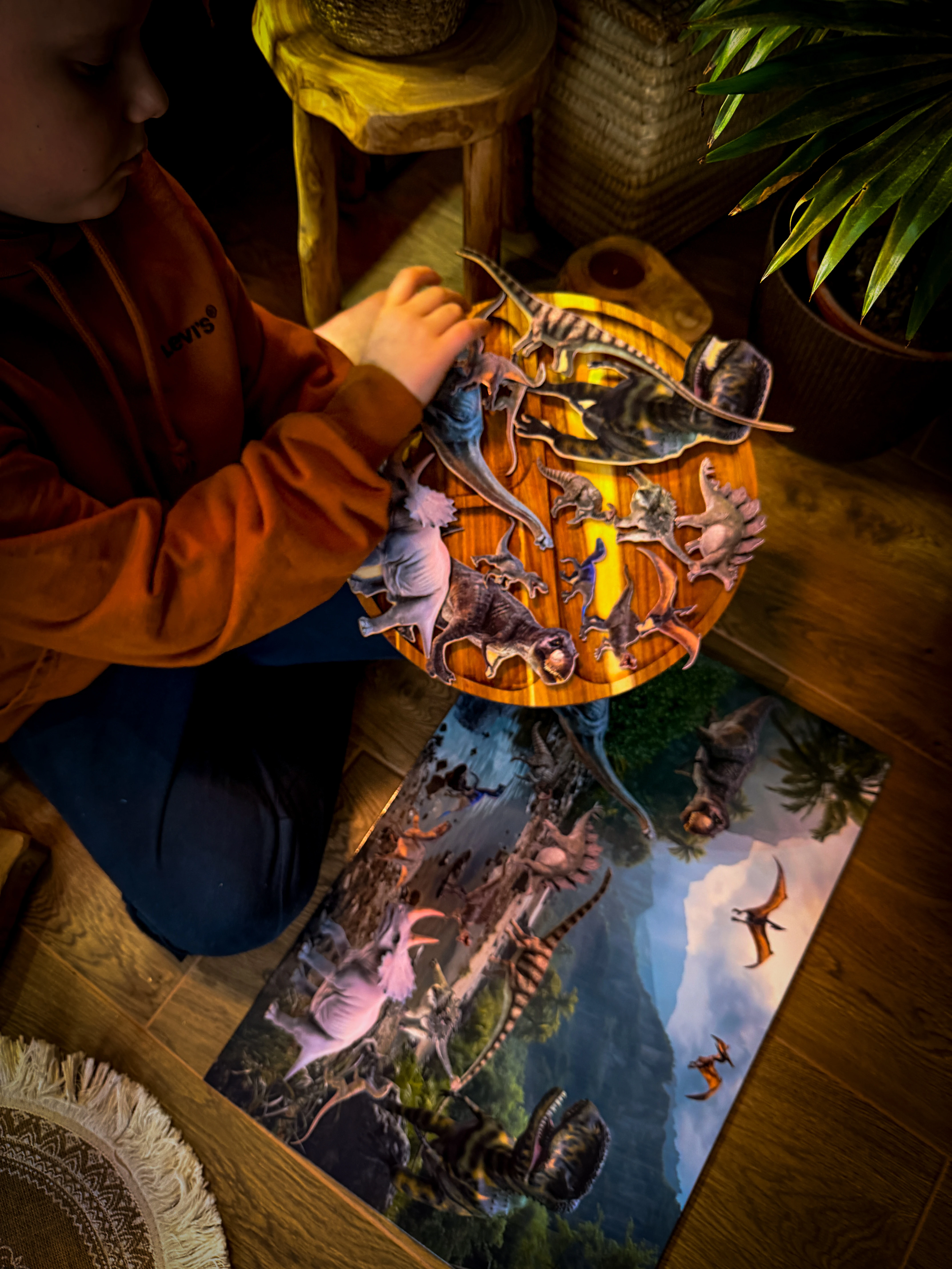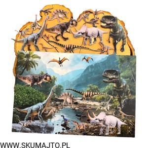 Zadaniem dziecka jest odnalezienie na planszy odpowiedniego dinozaura i dopasowanie go do ilustracji. Każdy element na odwrocie ma czytelną nazwę dinozaura, co pozwala naturalnie wprowadzać nazewnictwo i poszerzać wiedzę.