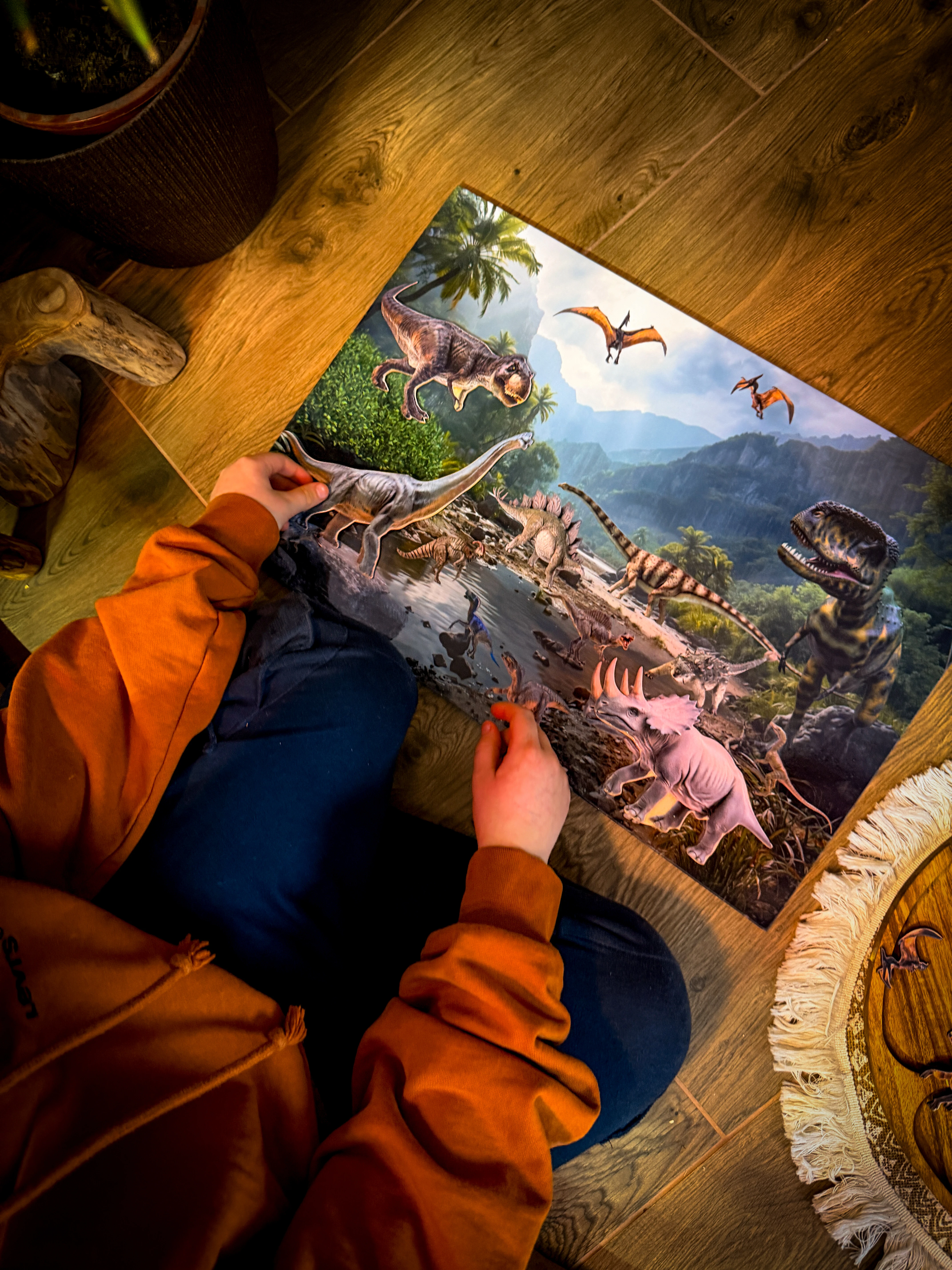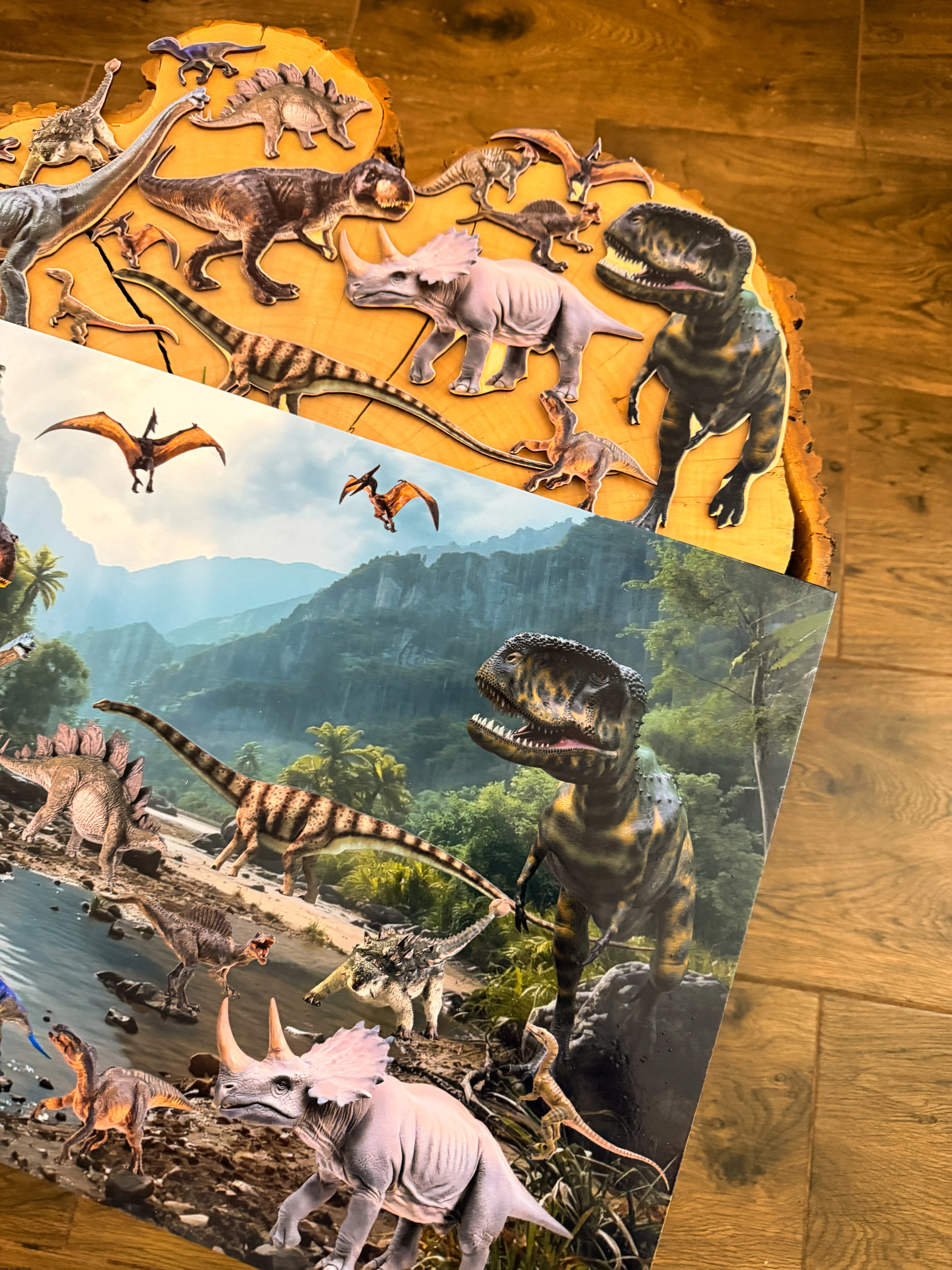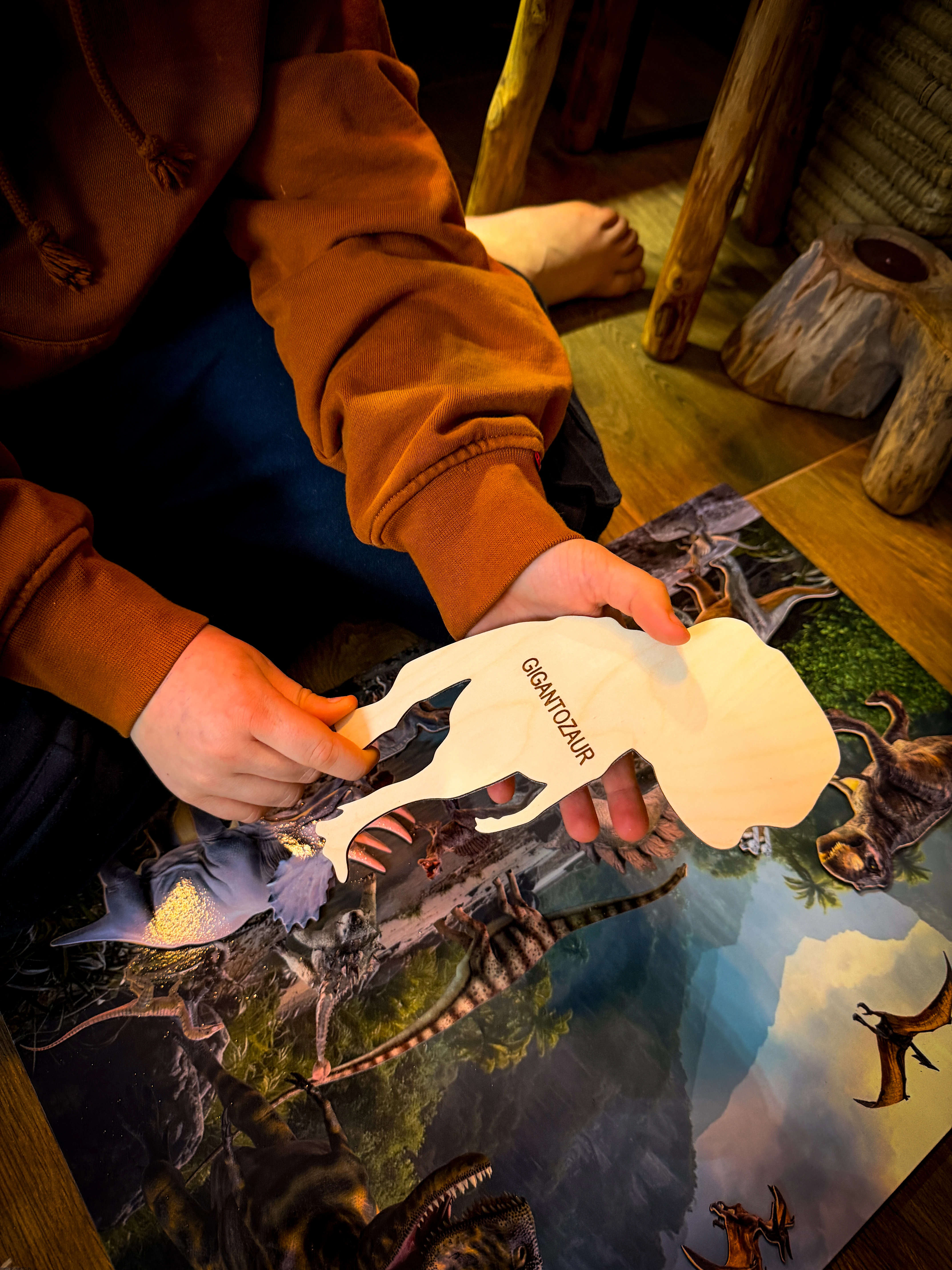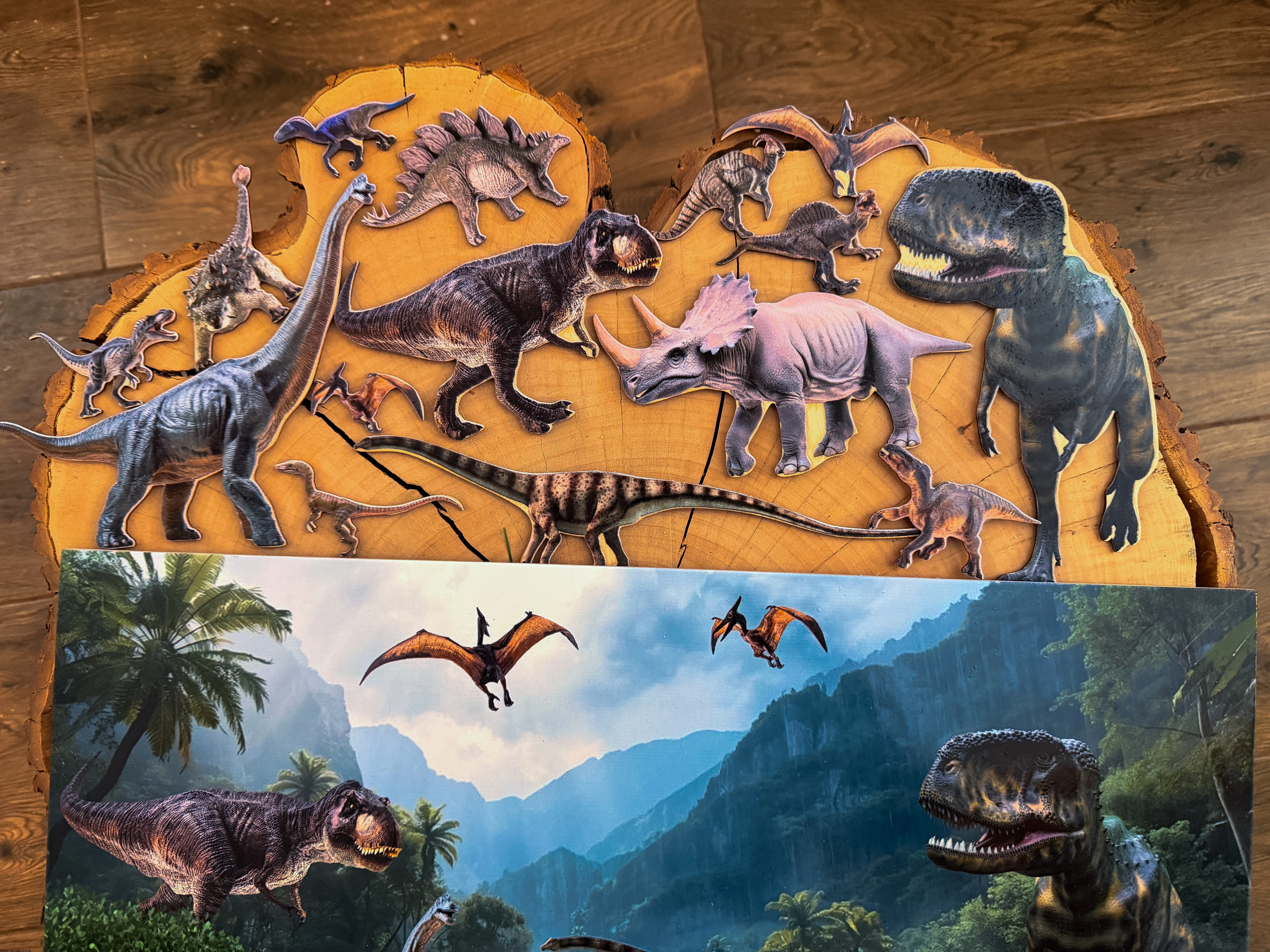 Zadaniem dziecka jest odnalezienie na planszy odpowiedniego dinozaura i dopasowanie go do ilustracji. Każdy element na odwrocie ma czytelną nazwę dinozaura, co pozwala naturalnie wprowadzać nazewnictwo i poszerzać wiedzę.