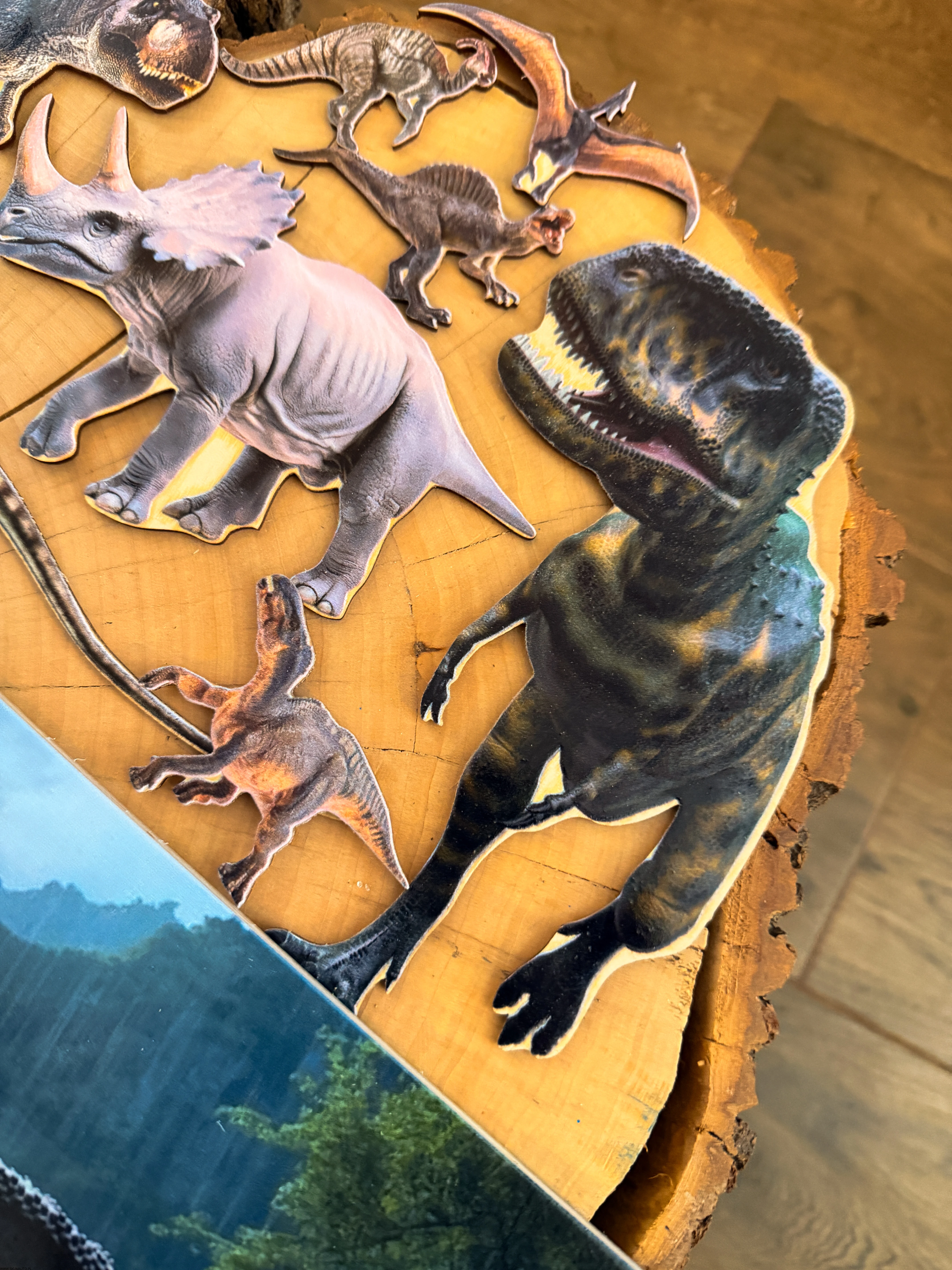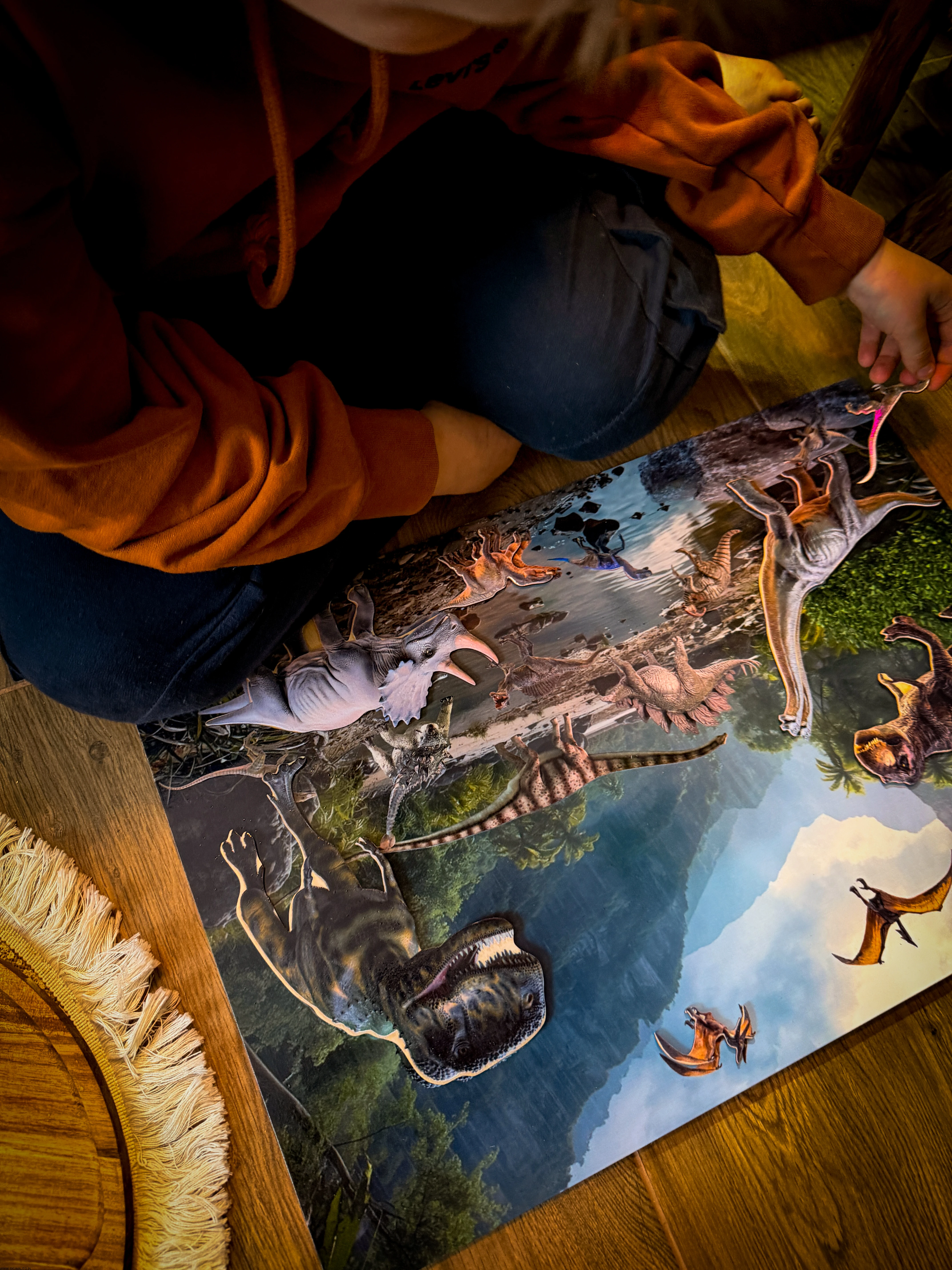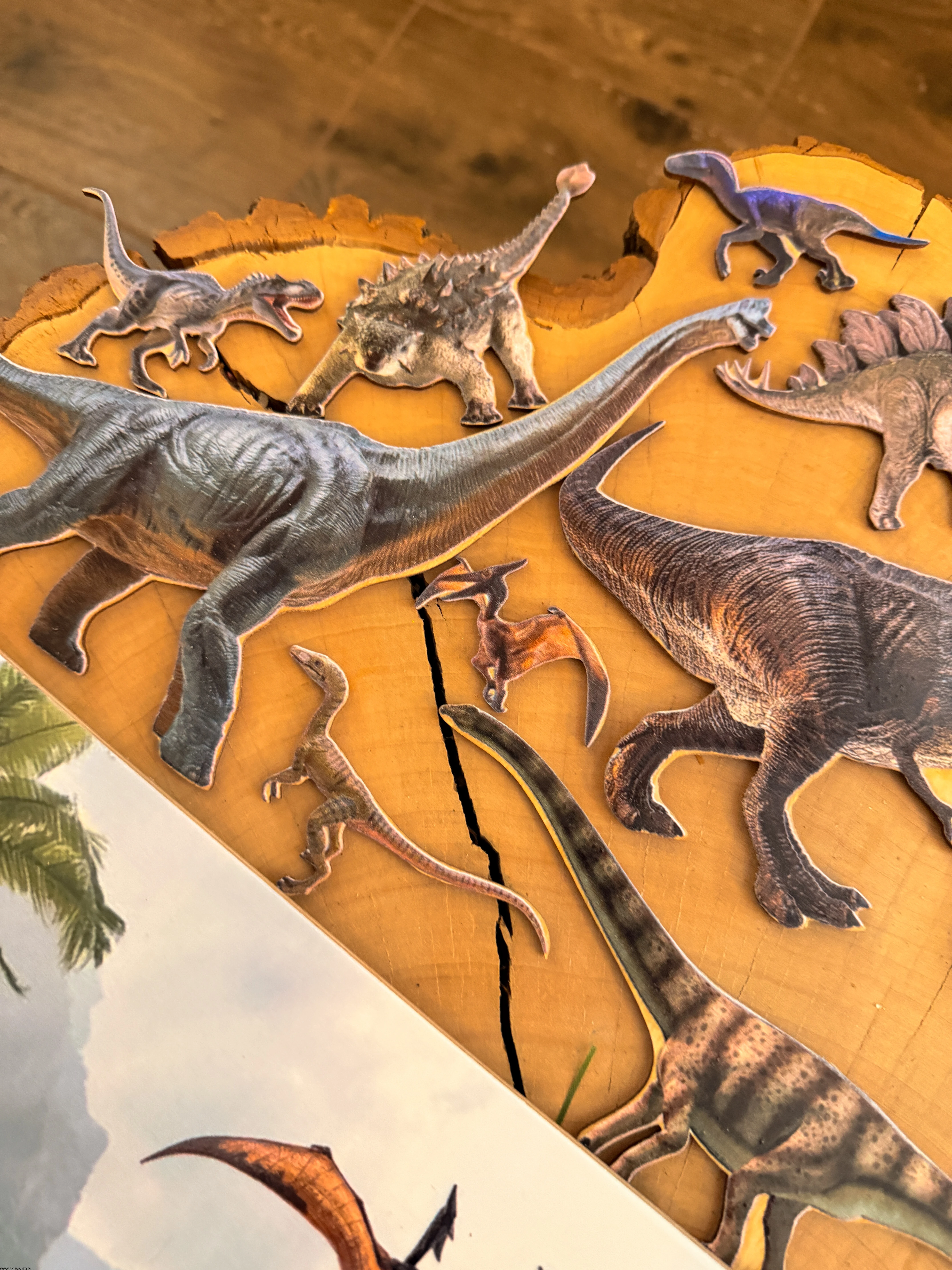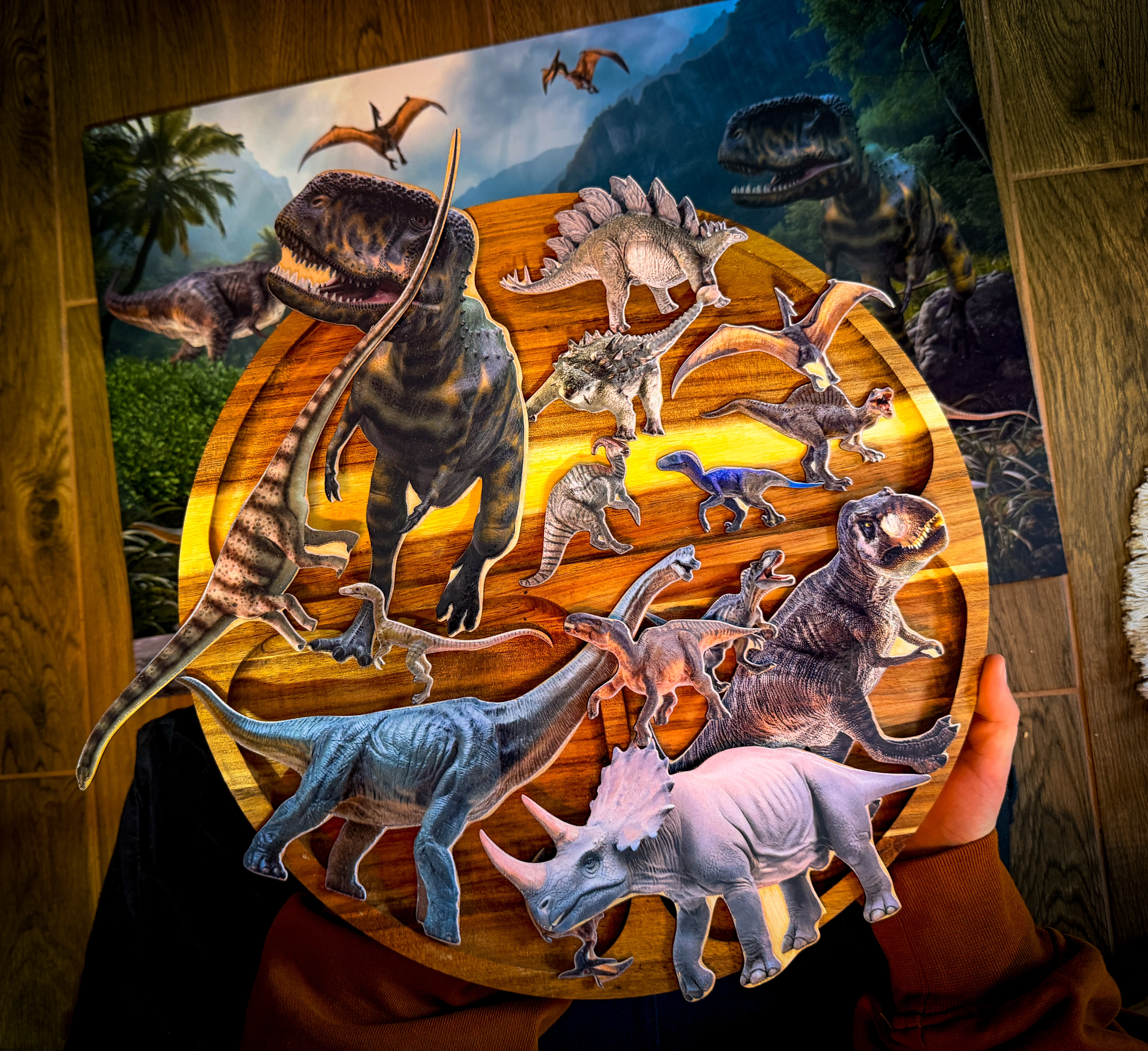 Zadaniem dziecka jest odnalezienie na planszy odpowiedniego dinozaura i dopasowanie go do ilustracji. Każdy element na odwrocie ma czytelną nazwę dinozaura, co pozwala naturalnie wprowadzać nazewnictwo i poszerzać wiedzę.