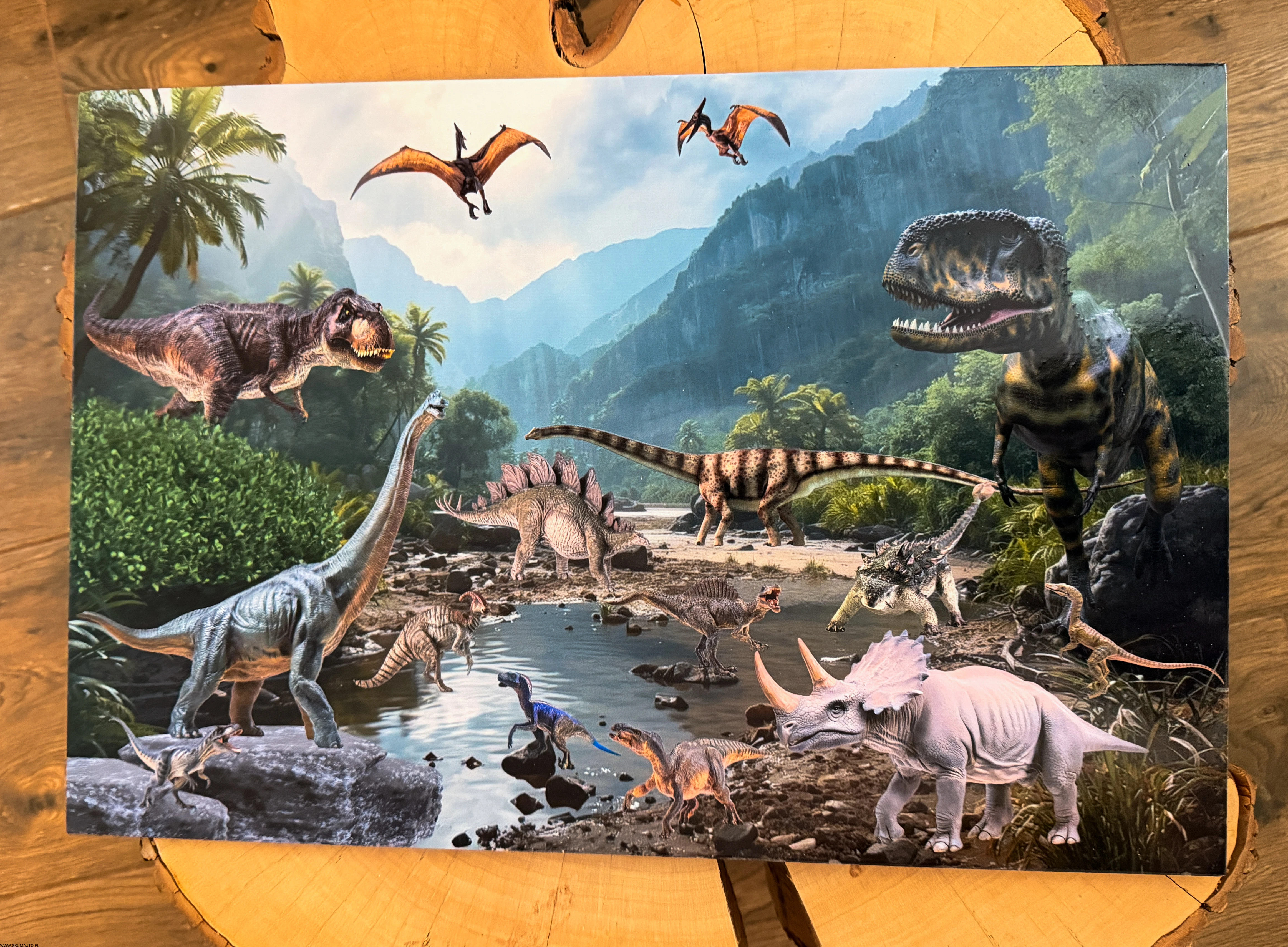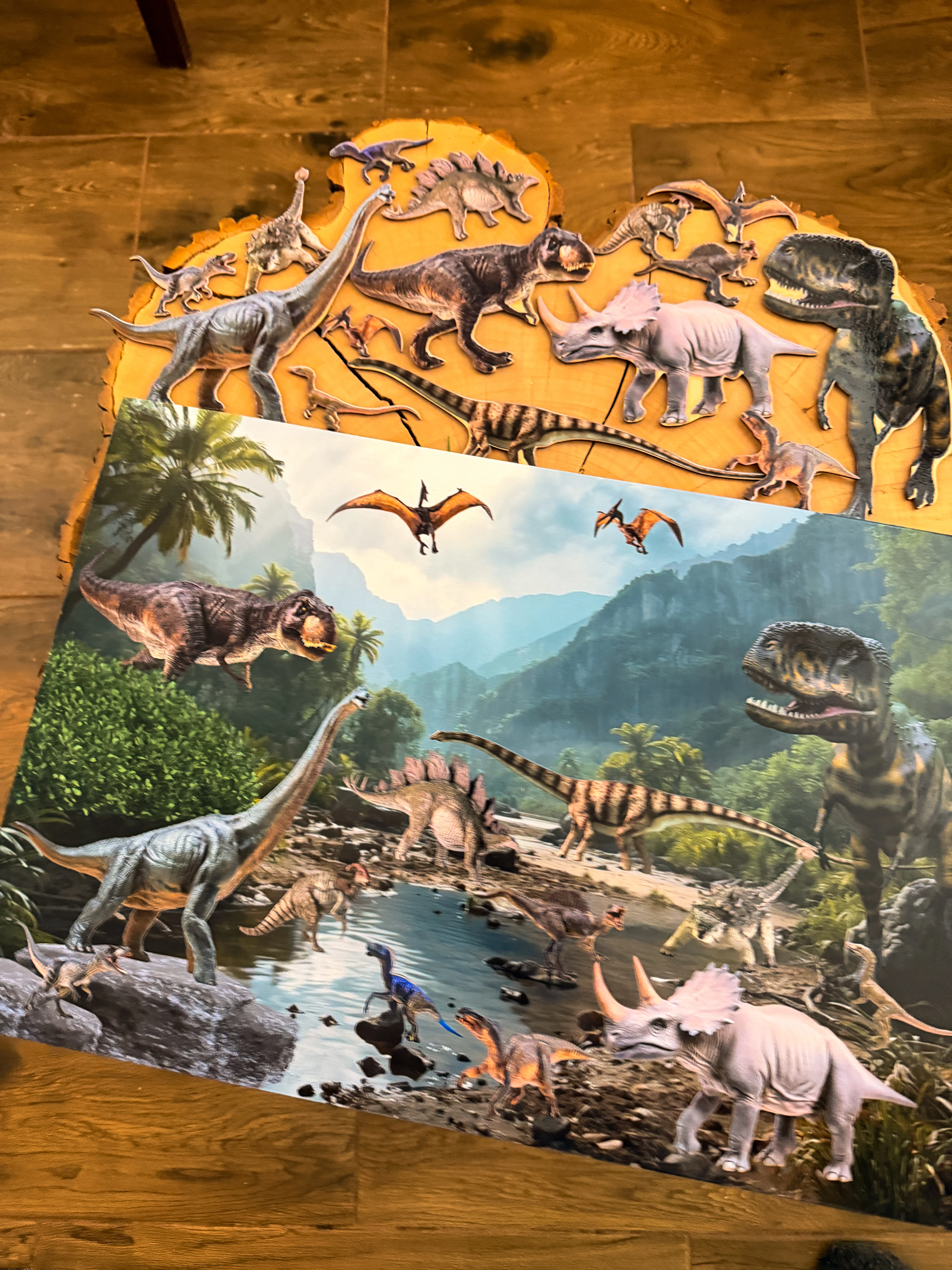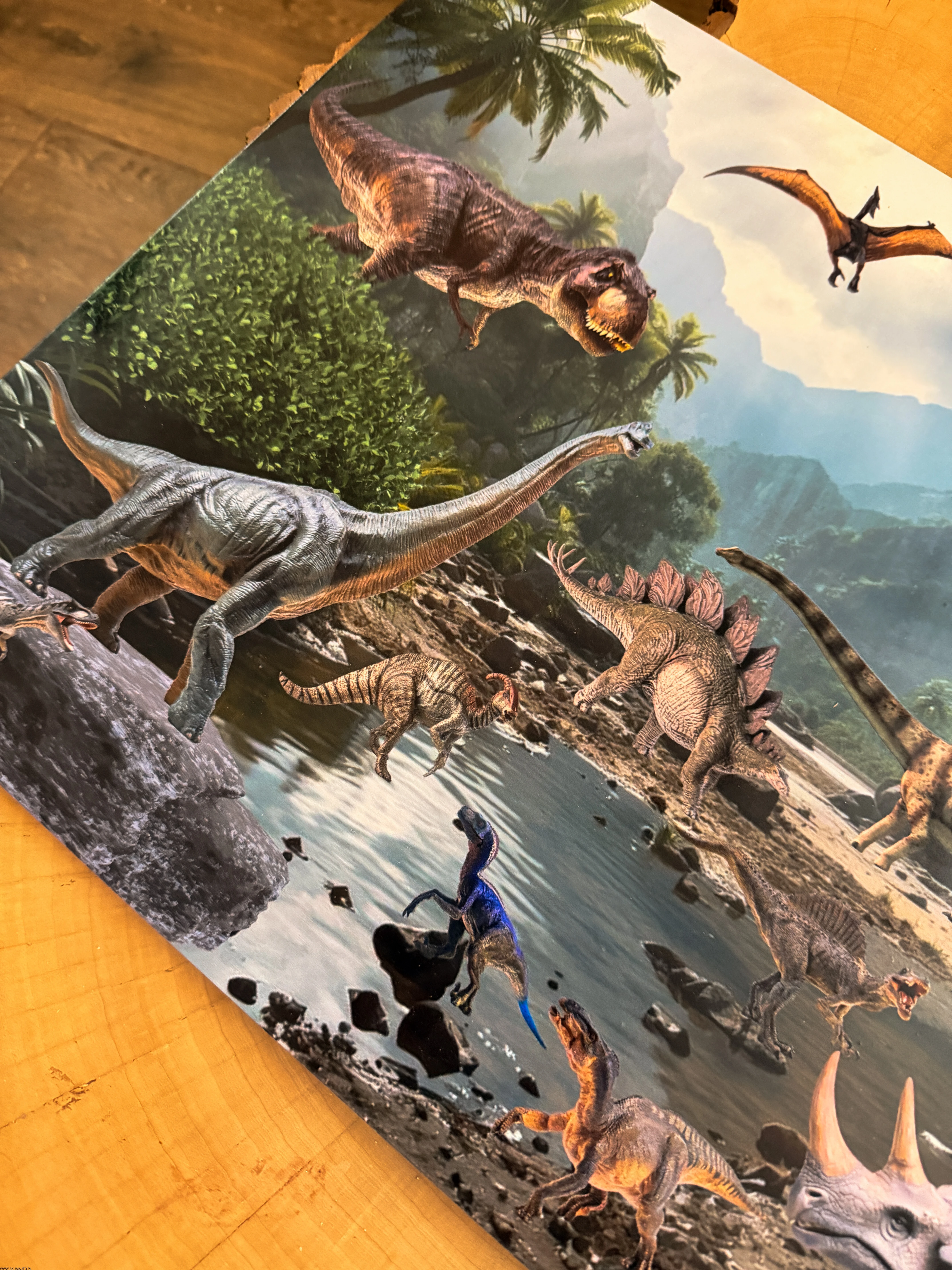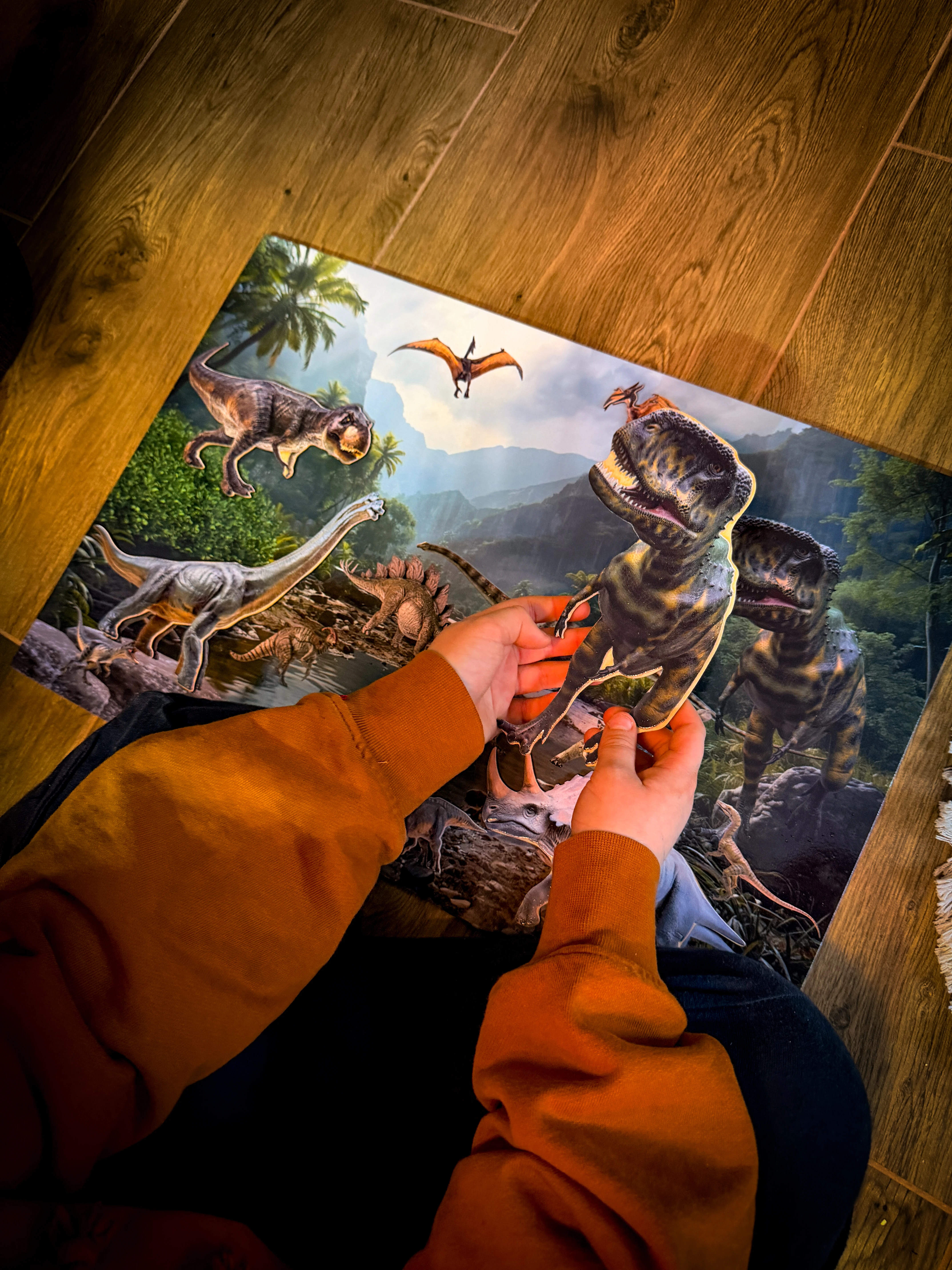 Zadaniem dziecka jest odnalezienie na planszy odpowiedniego dinozaura i dopasowanie go do ilustracji. Każdy element na odwrocie ma czytelną nazwę dinozaura, co pozwala naturalnie wprowadzać nazewnictwo i poszerzać wiedzę.