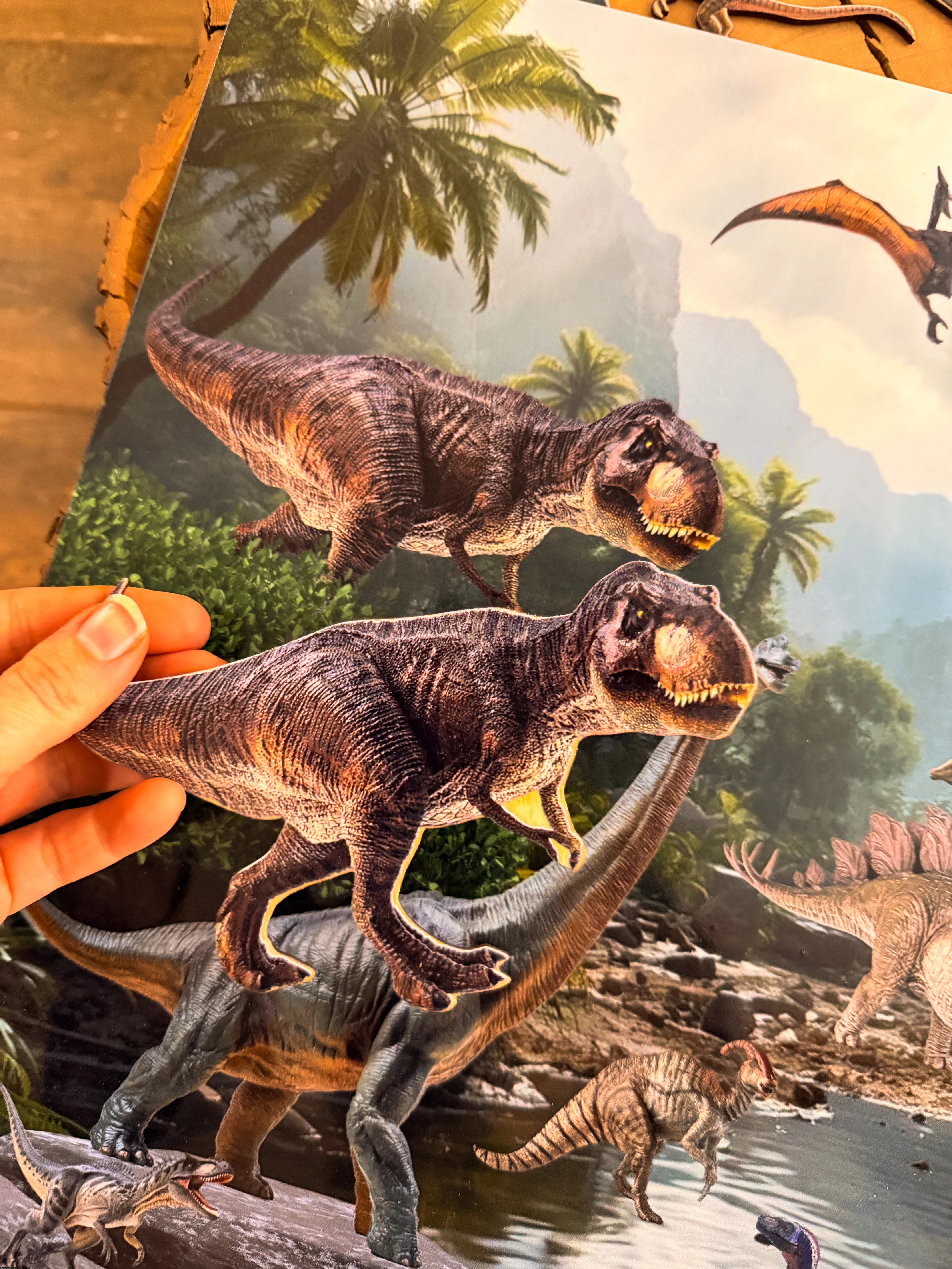 Rodzic lub nauczyciel wybiera jeden dinozaur, pokazuje go dziecku, a następnie chowa. Zadaniem dziecka jest odnalezienie tego samego dinozaura na planszy bez ponownego podglądania.