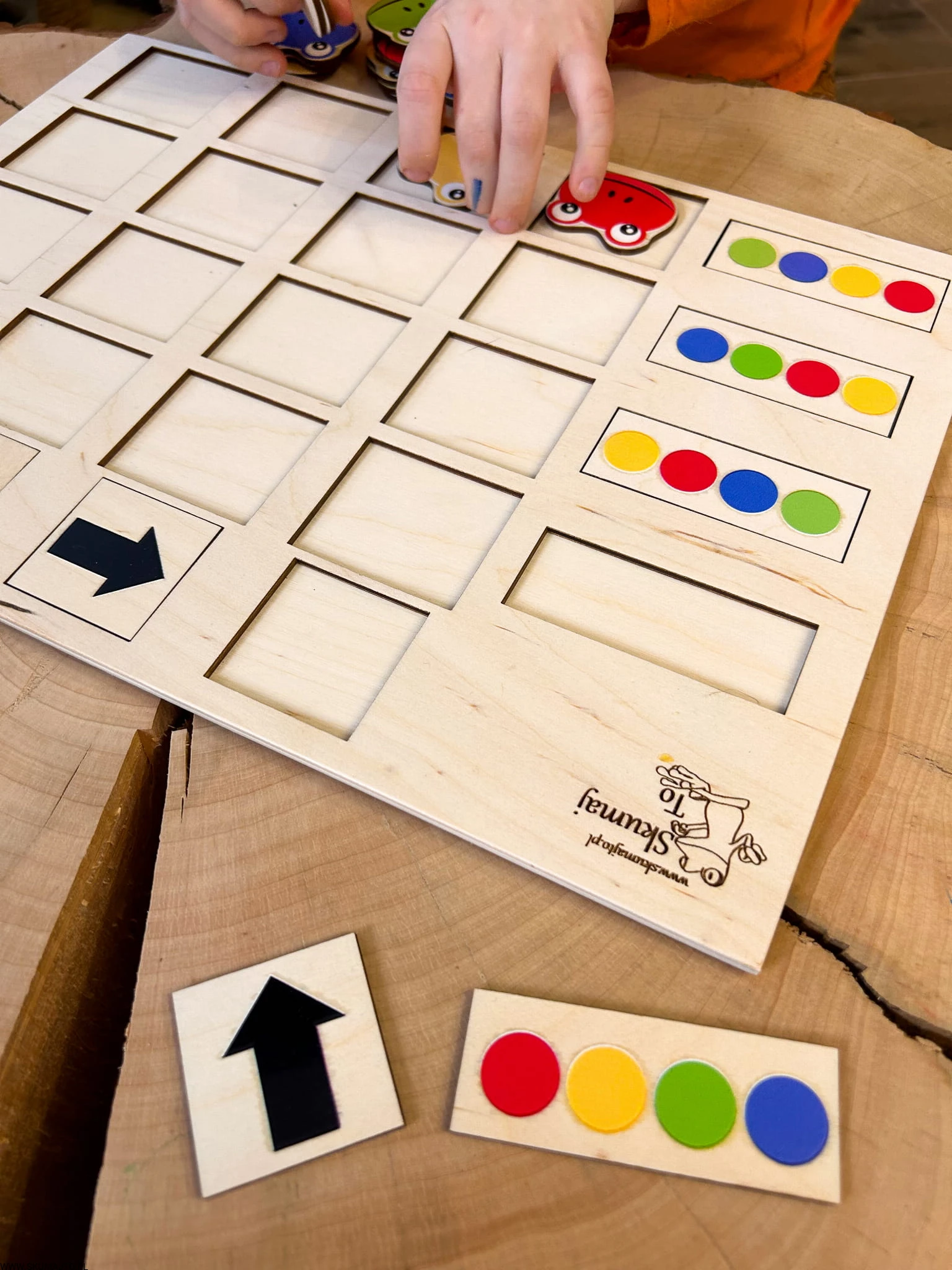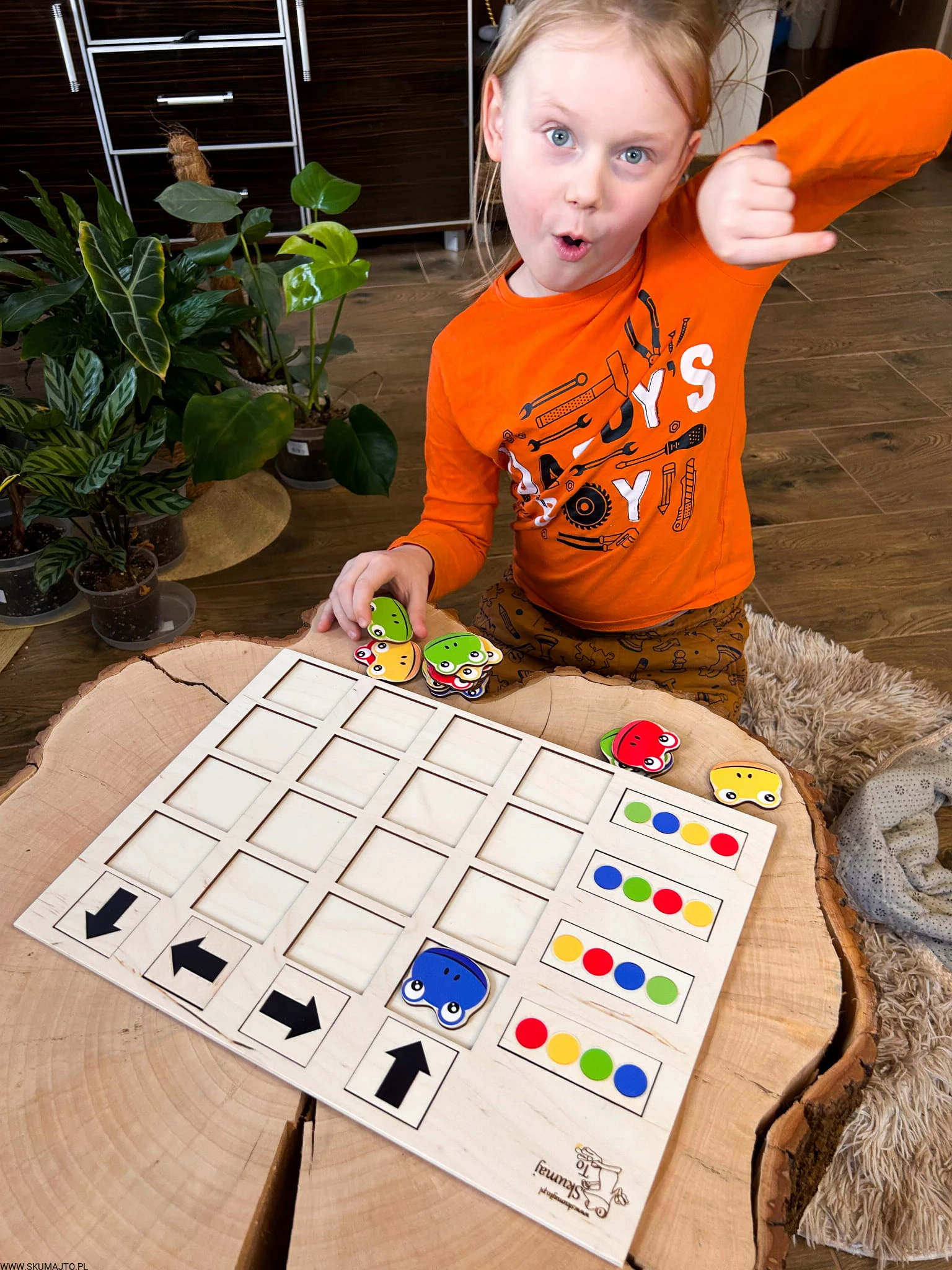 Zabawa w Kierunki: "Żabki Skumaj To" to wyjątkowa układanka, która prosi dzieci o ułożenie wesołych żabek w odpowiedniej kolejności oraz w wybranym kolorze na drewnianej podstawie. Każda żabka ma oczy skierowane w inną stronę, co stymuluje zdolności rozpoznawania wzorców i kierunków.
