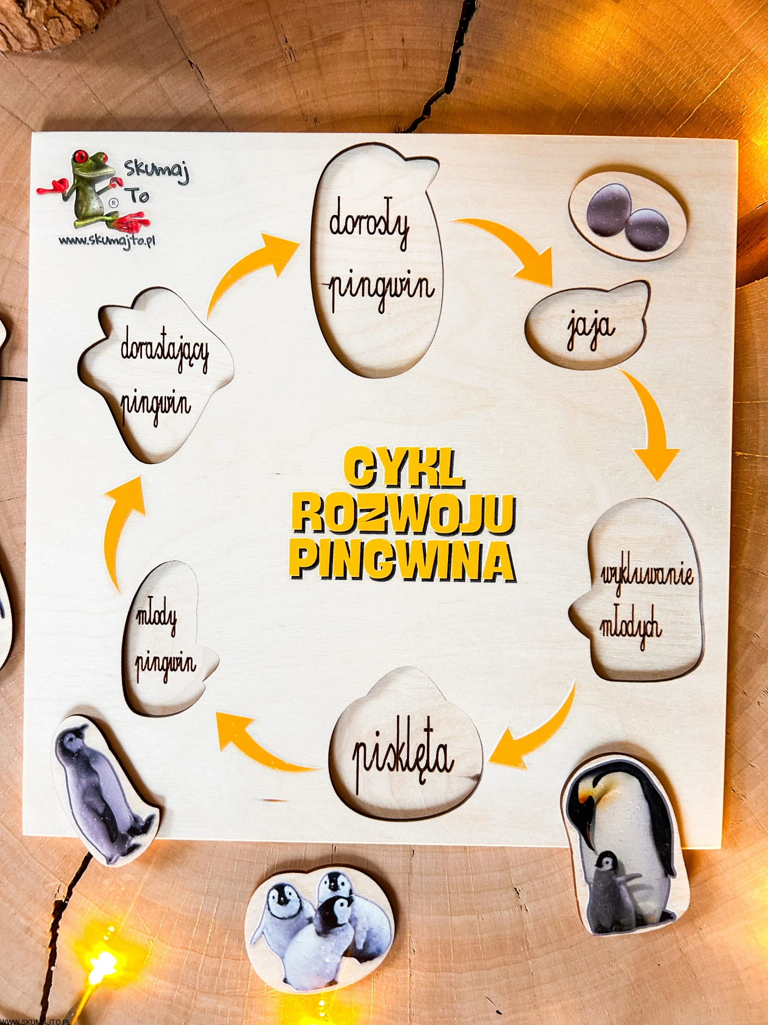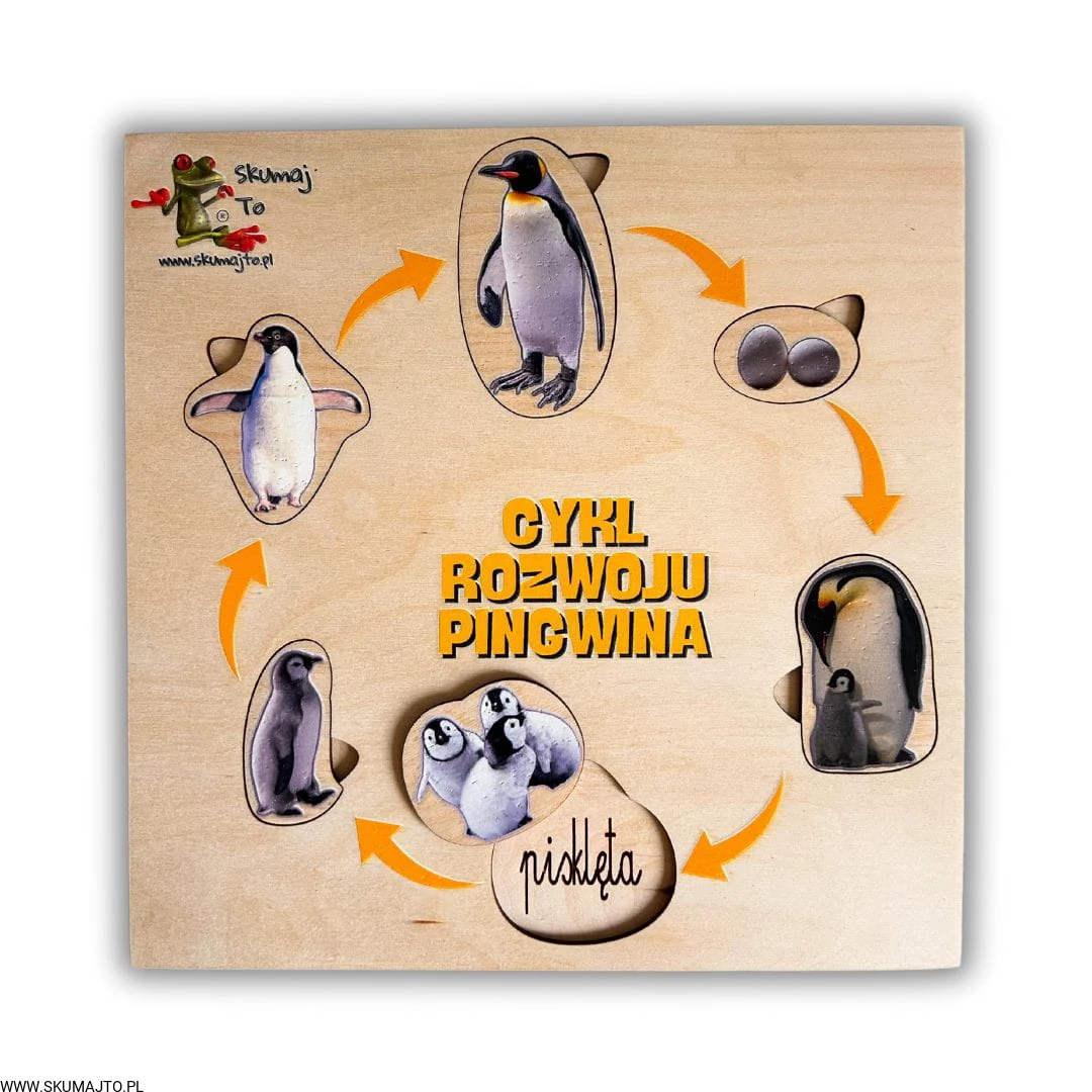 Ta układanka pokazuje etapy życia pingwina – od jajka, przez pisklę, aż po dorosłego osobnika. Dziecko układa 6 elementów zgodnie z kolejnością, poznając naturalny cykl życia tych ptaków.