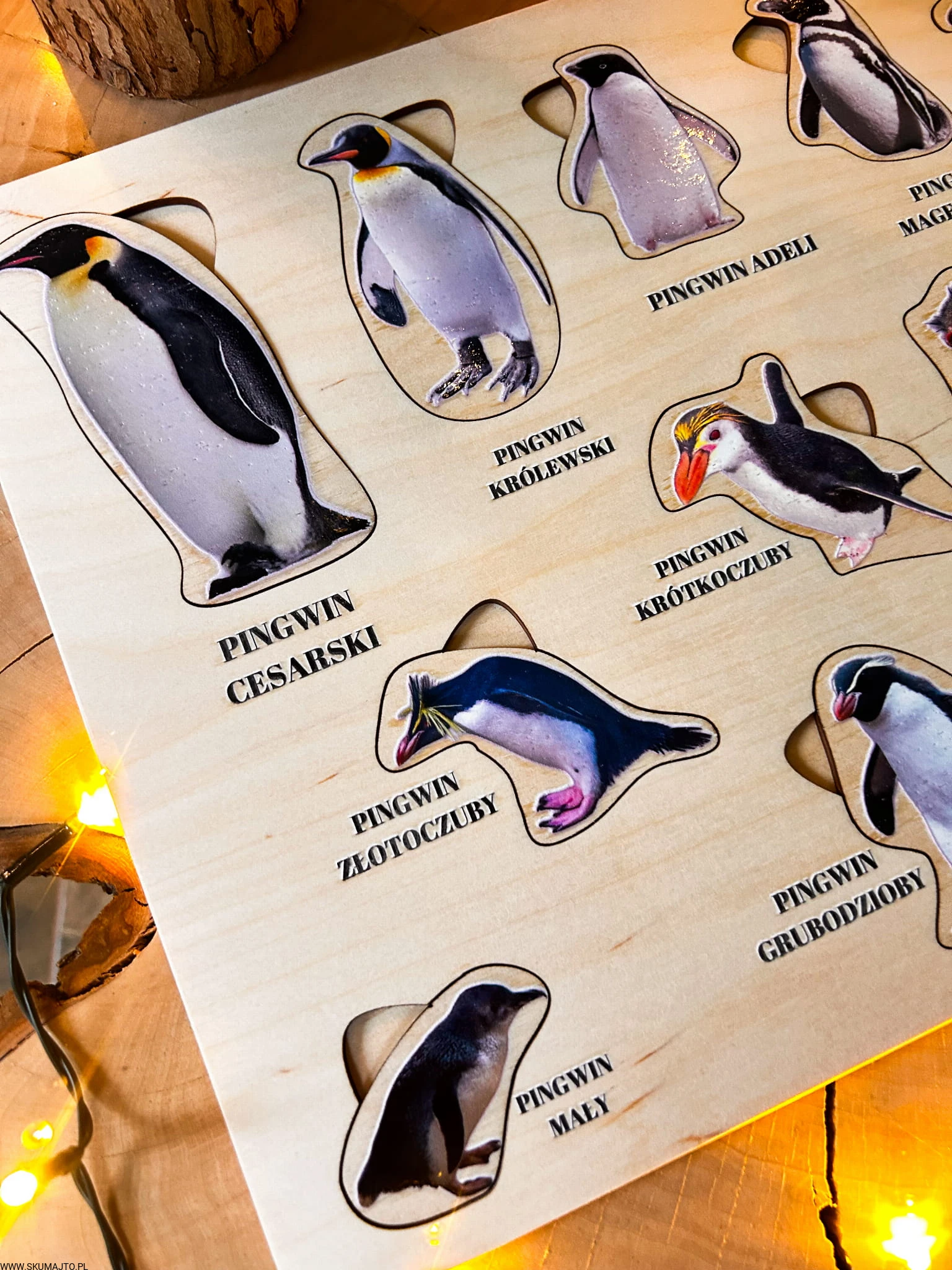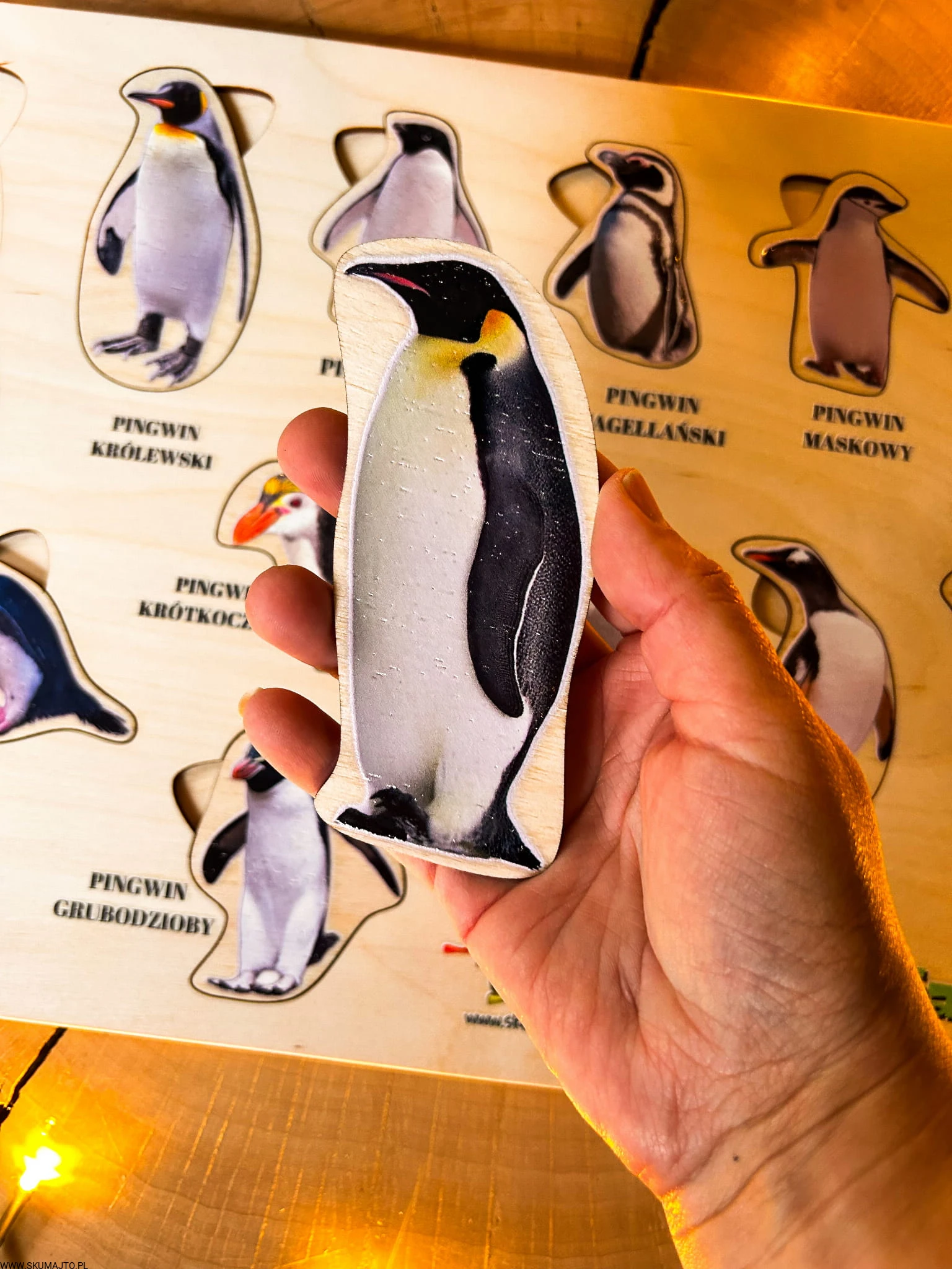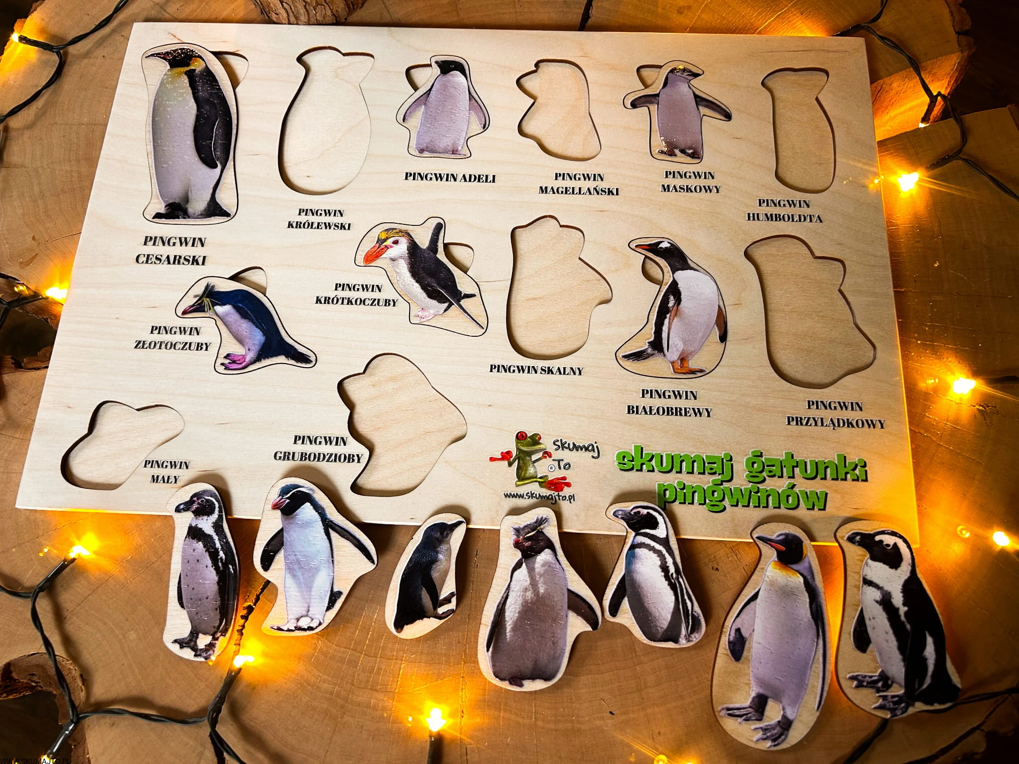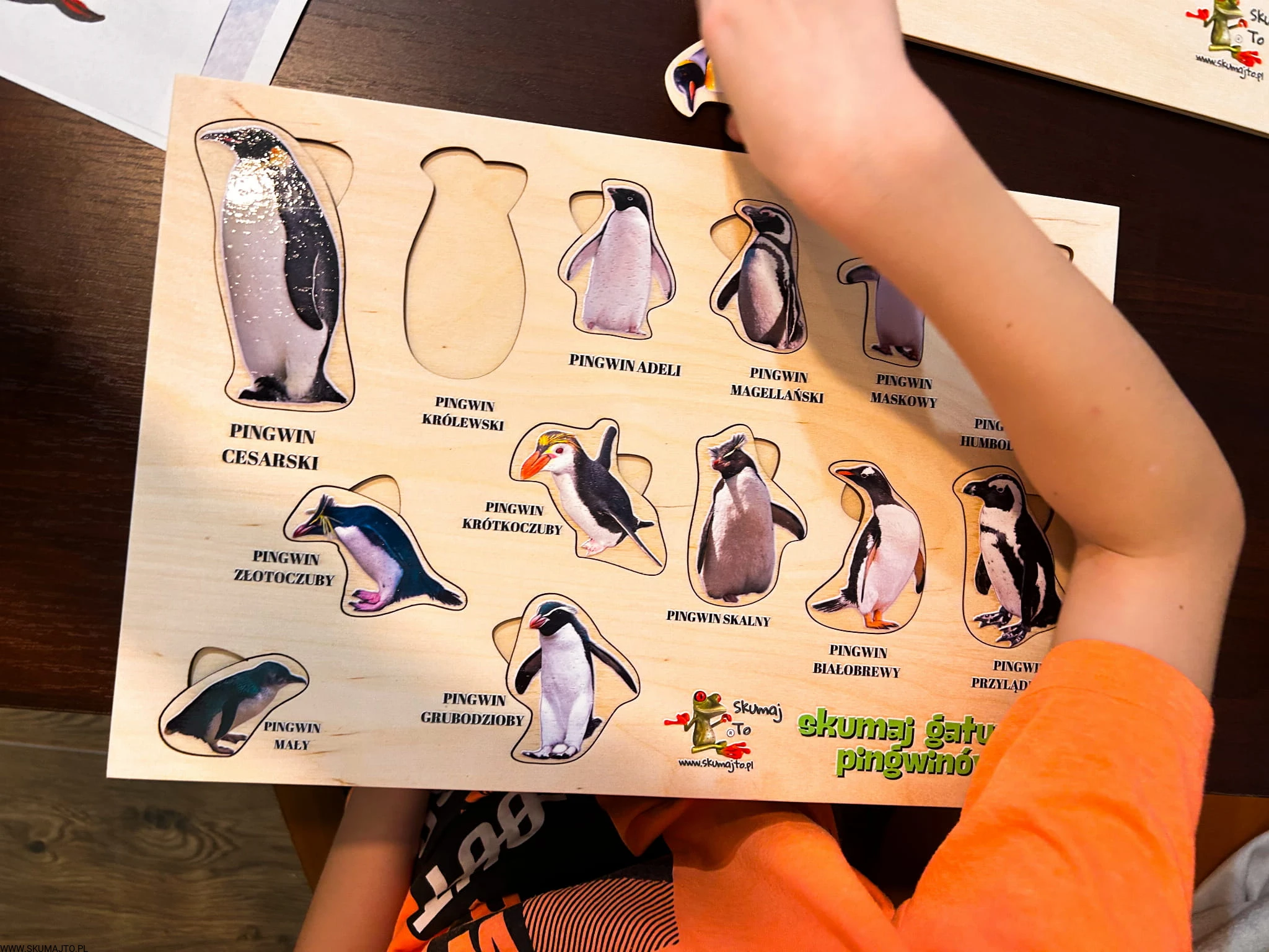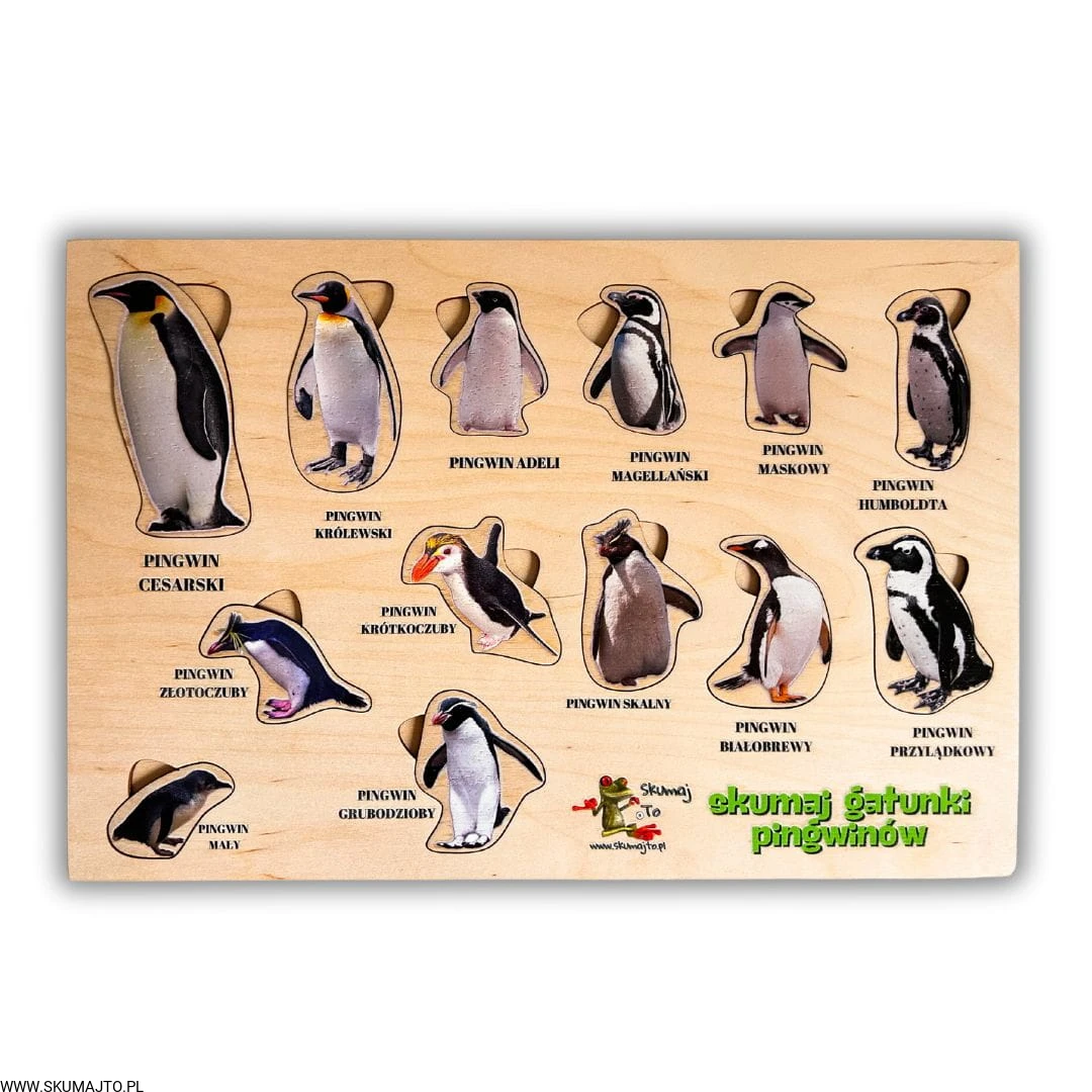 Dziecko odkryje 13 różnych gatunków pingwinów, od majestatycznego pingwina cesarskiego po sprytnego pingwina skalnego. Każdy element jest wyjmowany, a pod nim znajduje się nazwa gatunku.