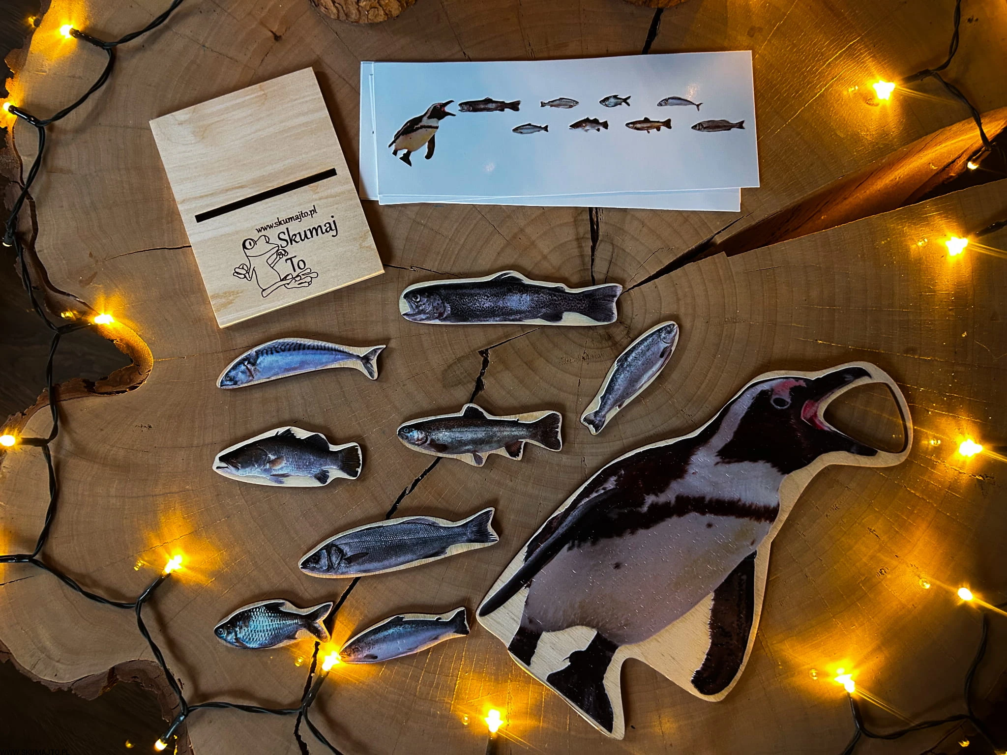 - Wymiary: Pingwin – 25 cm wysokości; rybki – 5 cm długości