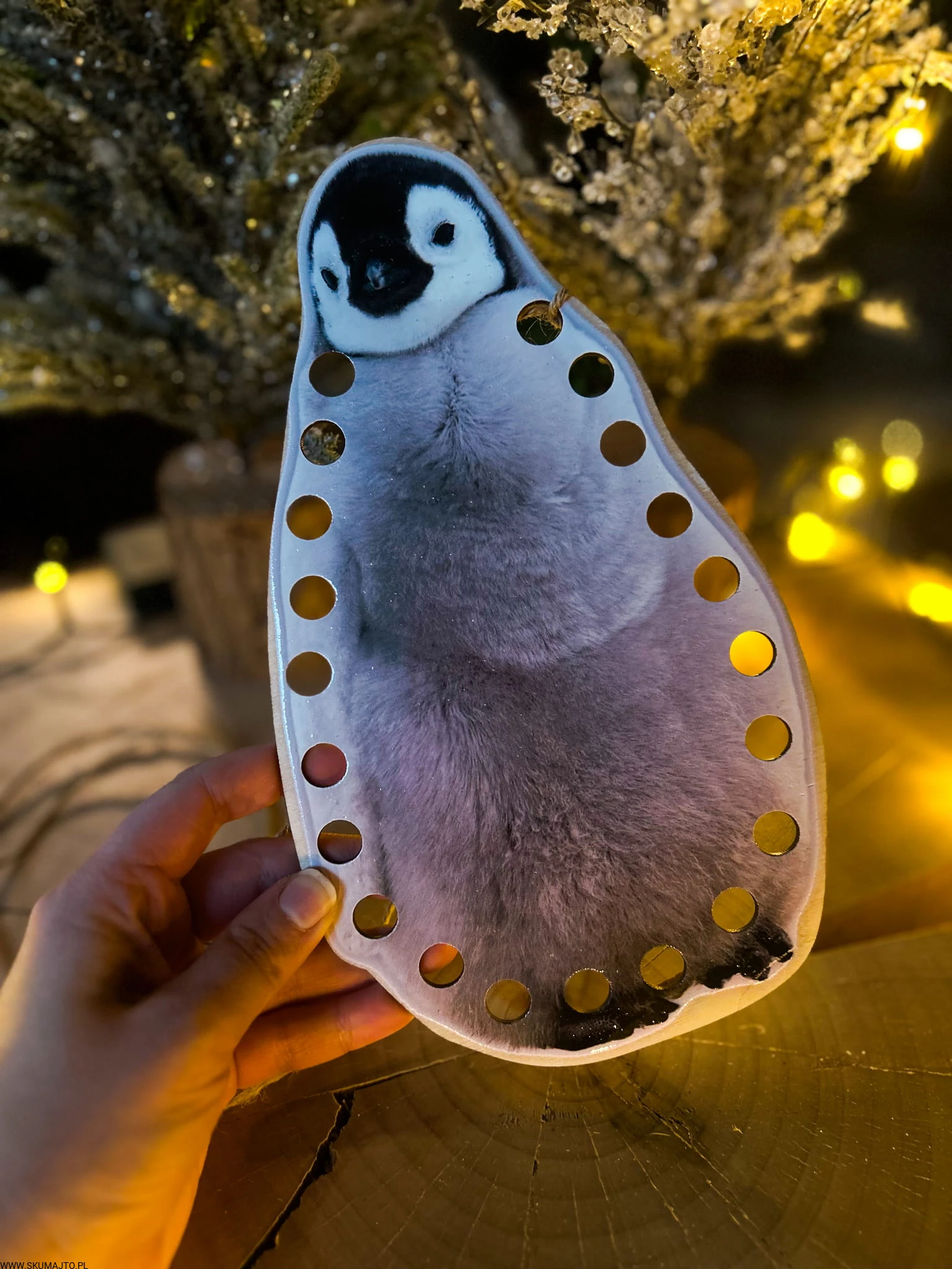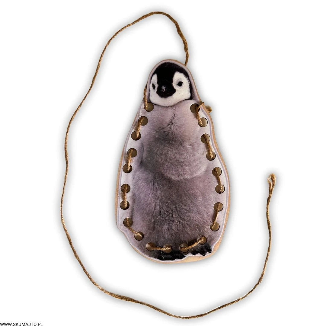 Słodki pingwin z otworami na całej krawędzi zaprasza dziecko do zabawy w przeplatanie. Dziecko za pomocą sznurka uczy się precyzyjnych ruchów, wypełniając kontur pingwina.