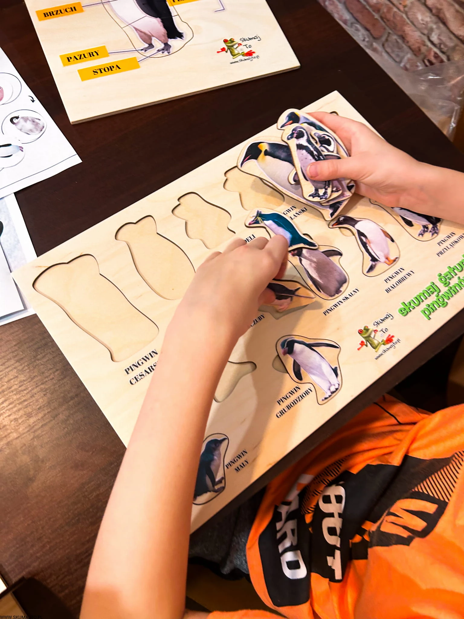 Dziecko odkrywa, jak wygląda pingwin z zewnątrz i wewnątrz. Górna warstwa układanki opisuje części ciała pingwina, a pod spodem znajduje się jego szkielet.