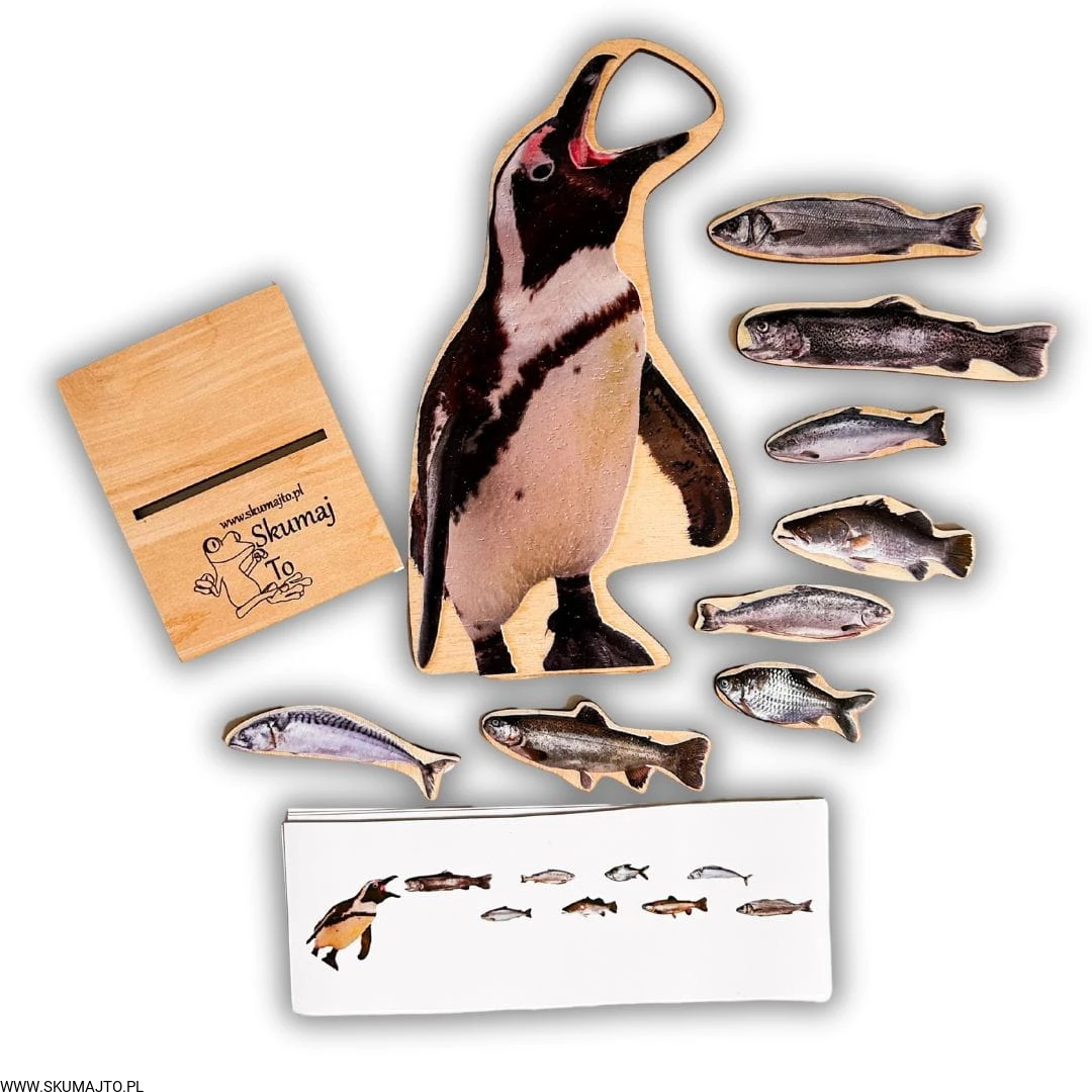 Pingwin stoi w swojej podstawce, z szeroko otwartym dziobem, czekając na swoje ulubione ryby. Zadaniem dziecka jest nakarmić go ośmioma drewnianymi rybkami w odpowiedniej kolejności, korzystając z dołączonych kart odwzorowywania.
