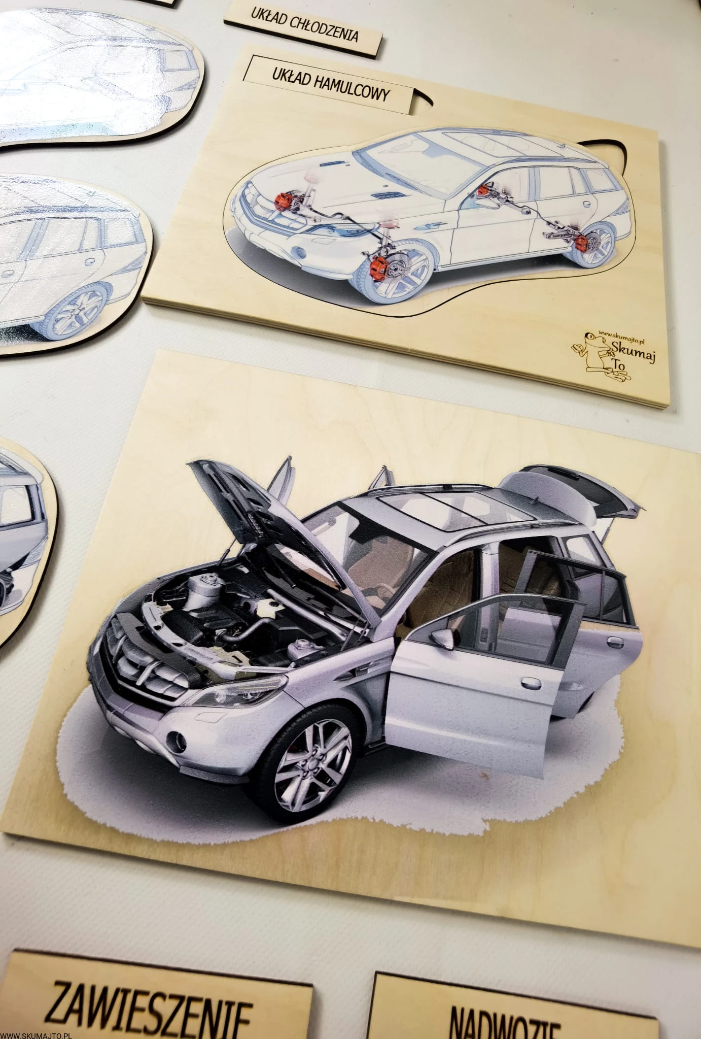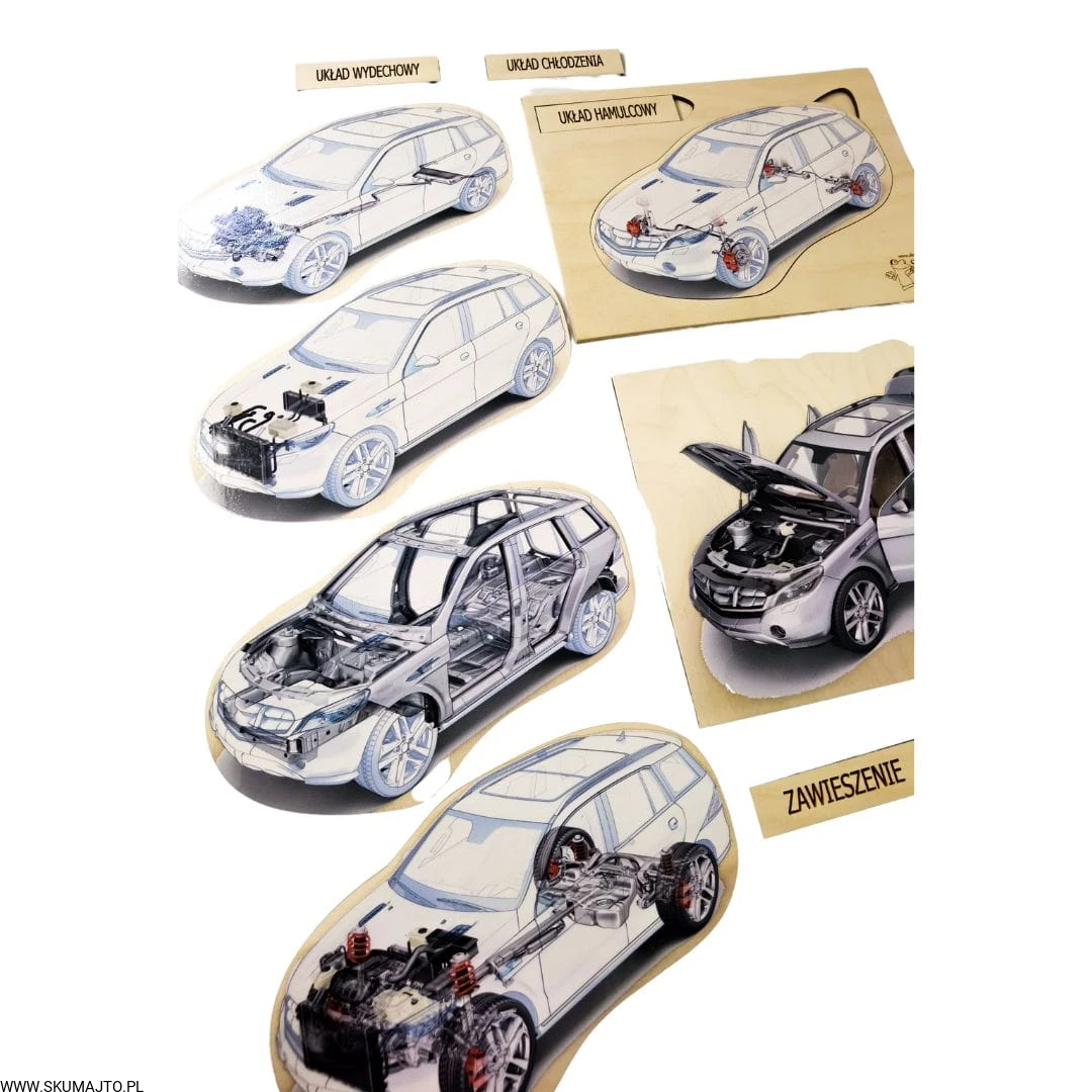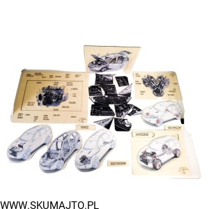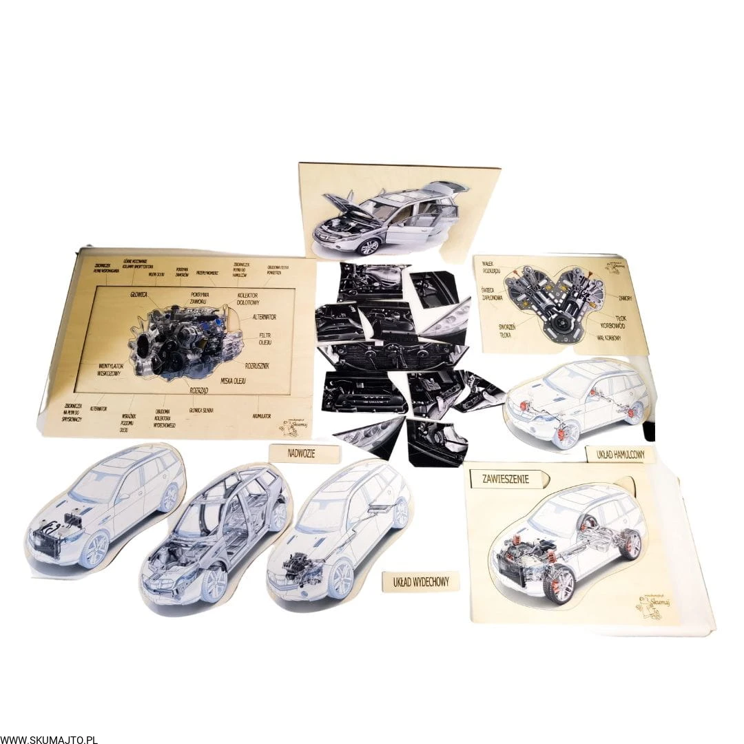- Budowa Silnika: Dwuwarstwowa układanka o wymiarach 48x28 cm, pokazująca konstrukcję silnika oraz to, co widzimy po otworzeniu maski samochodu.