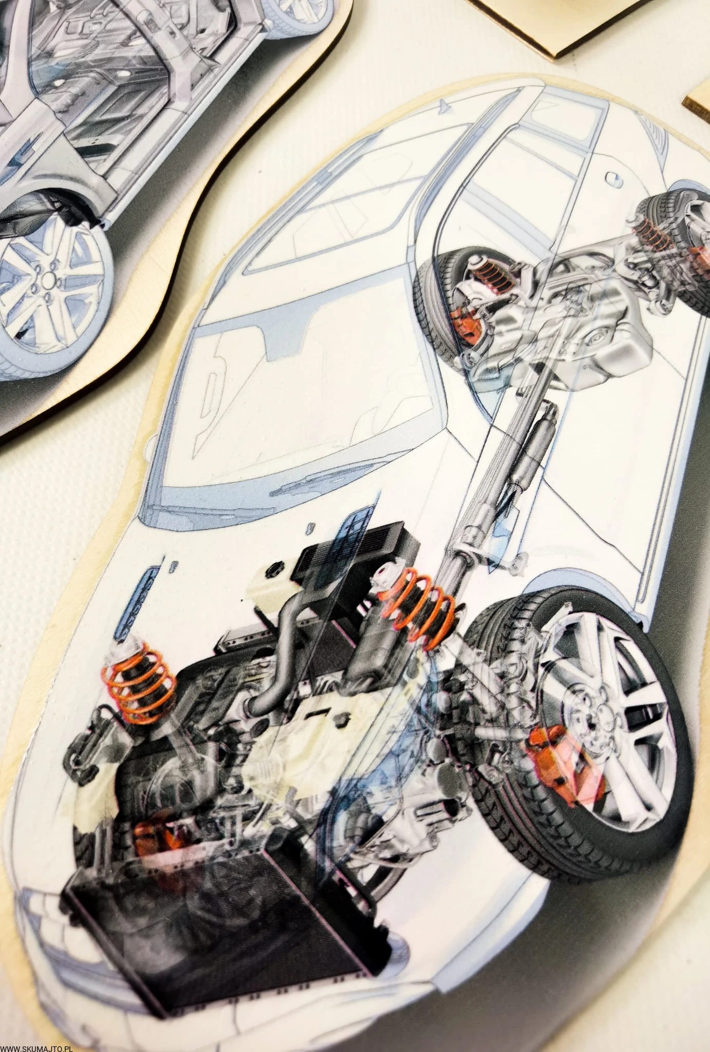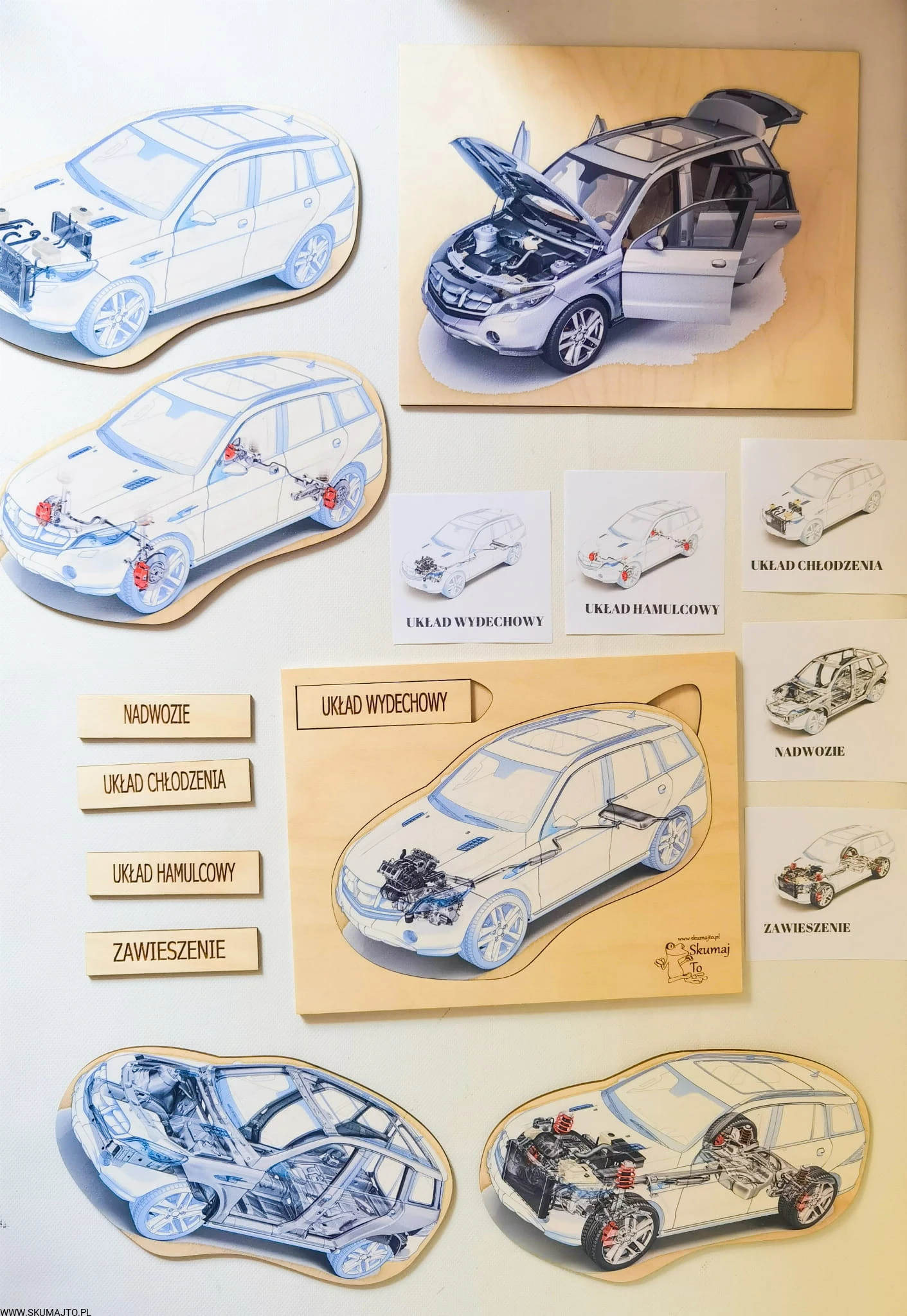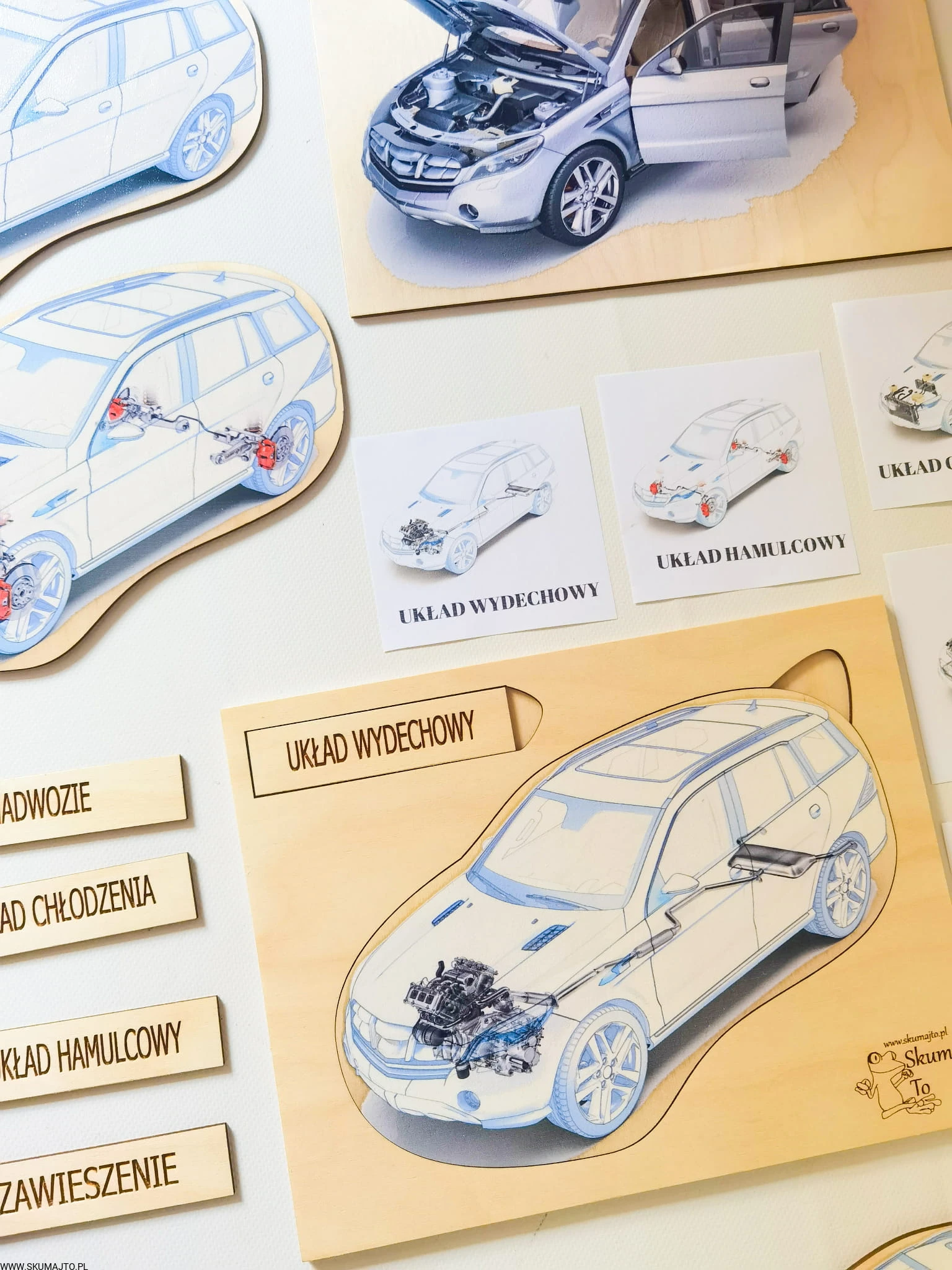 - Budowa Silnika: Dwuwarstwowa układanka o wymiarach 48x28 cm, pokazująca konstrukcję silnika oraz to, co widzimy po otworzeniu maski samochodu.