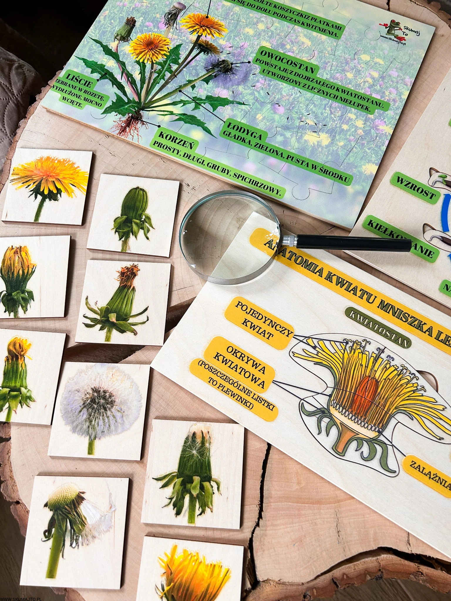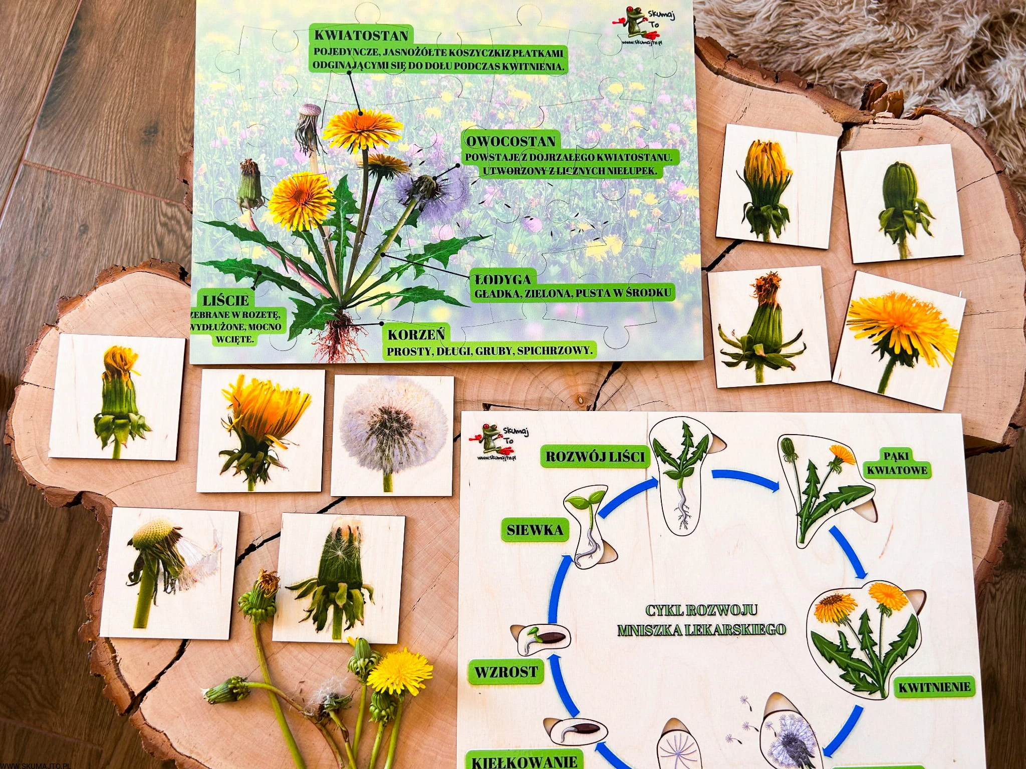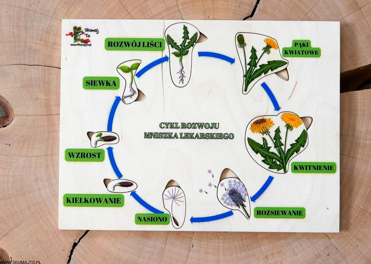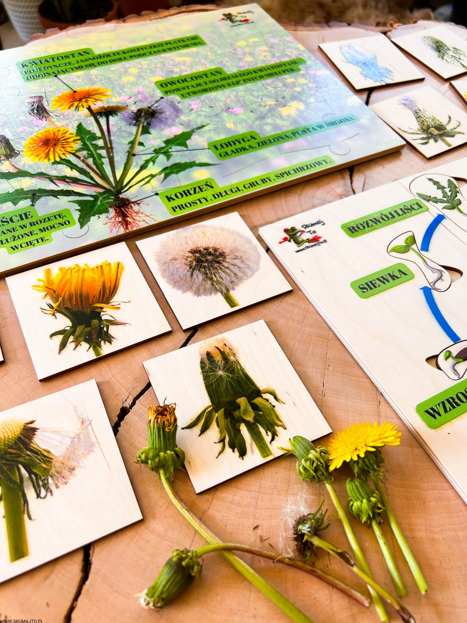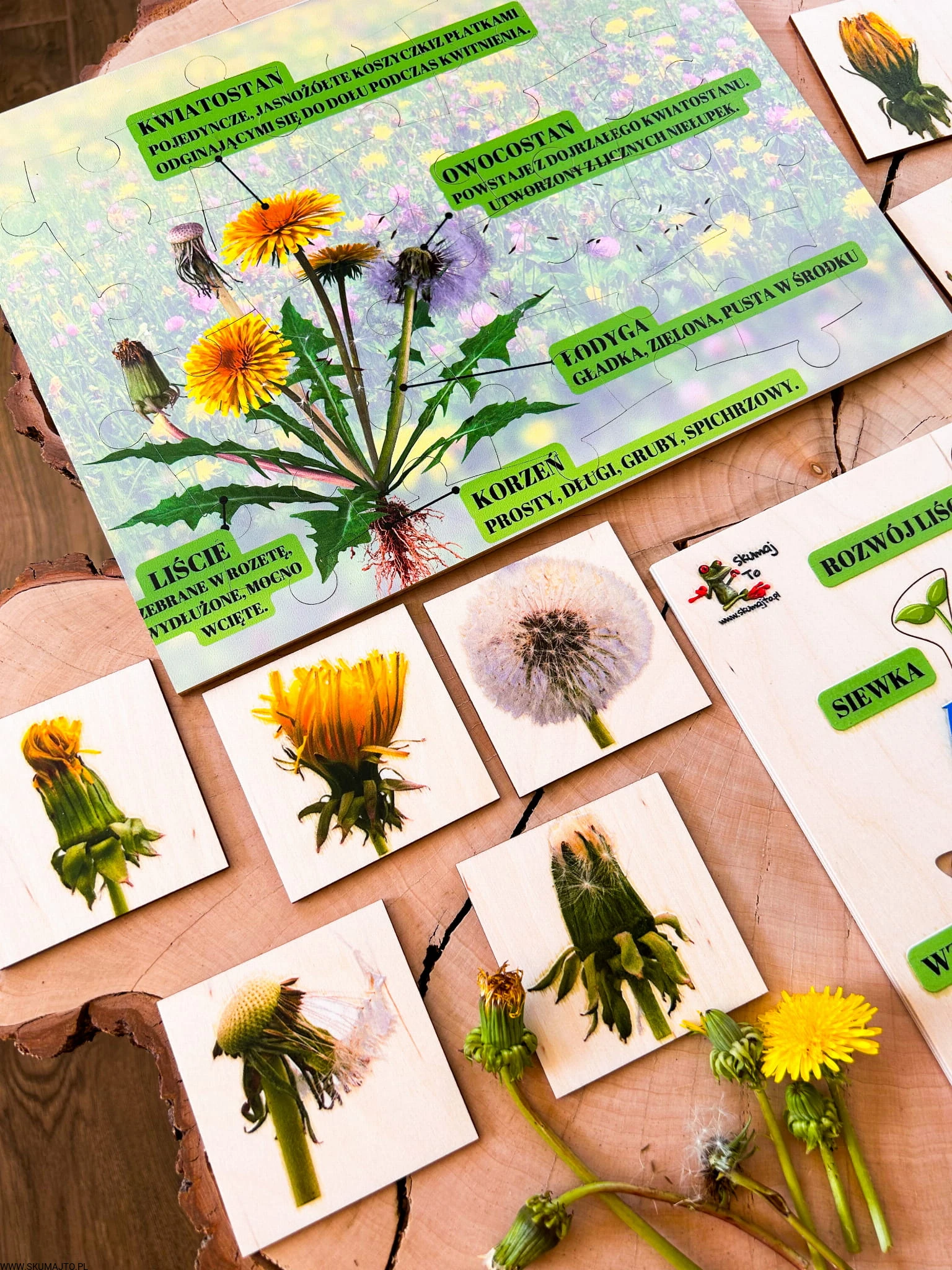 Zestaw z mniszkiem lekarskim drewniane układanki, cykl rozwojowy, budowa mniszka