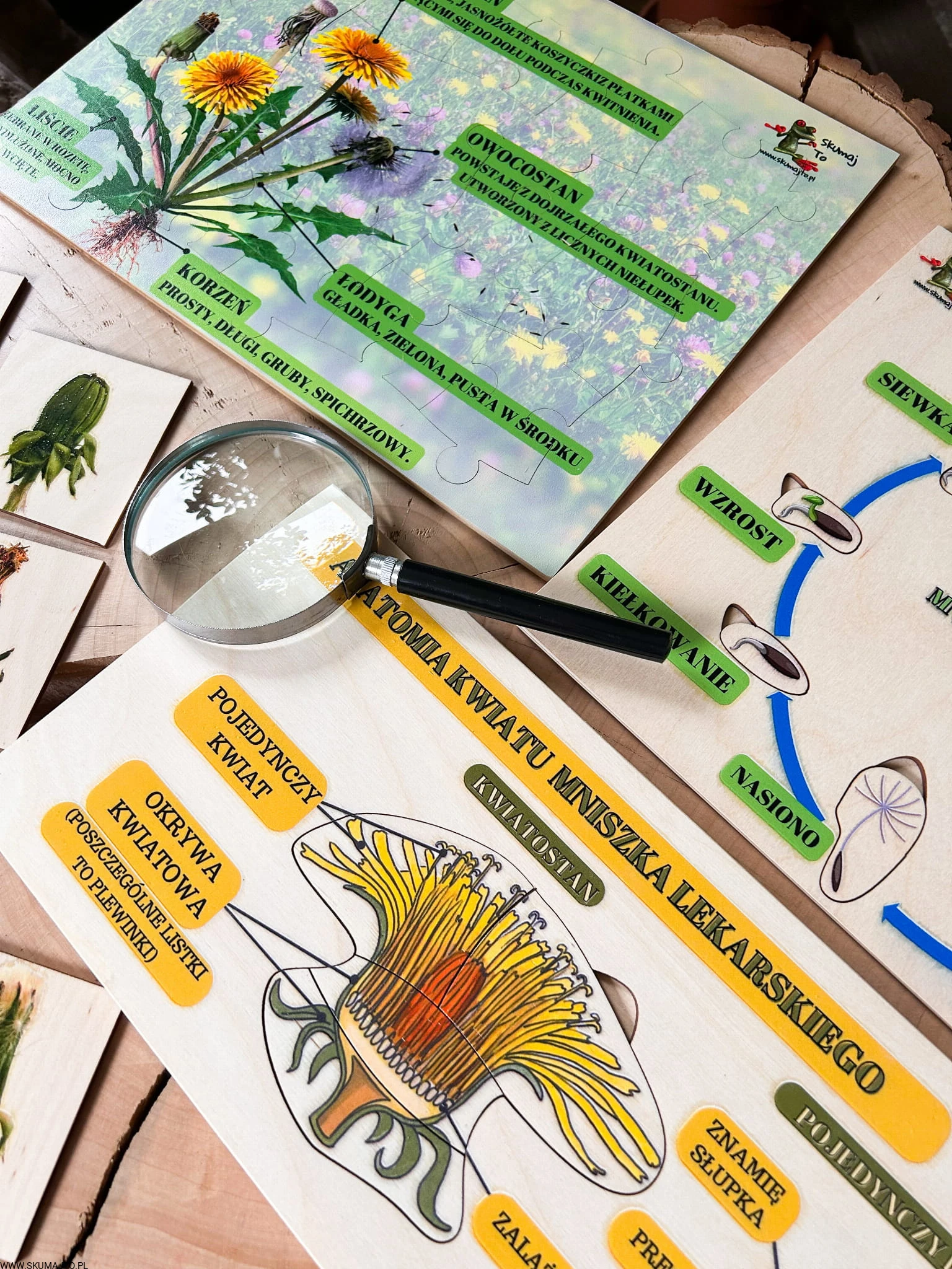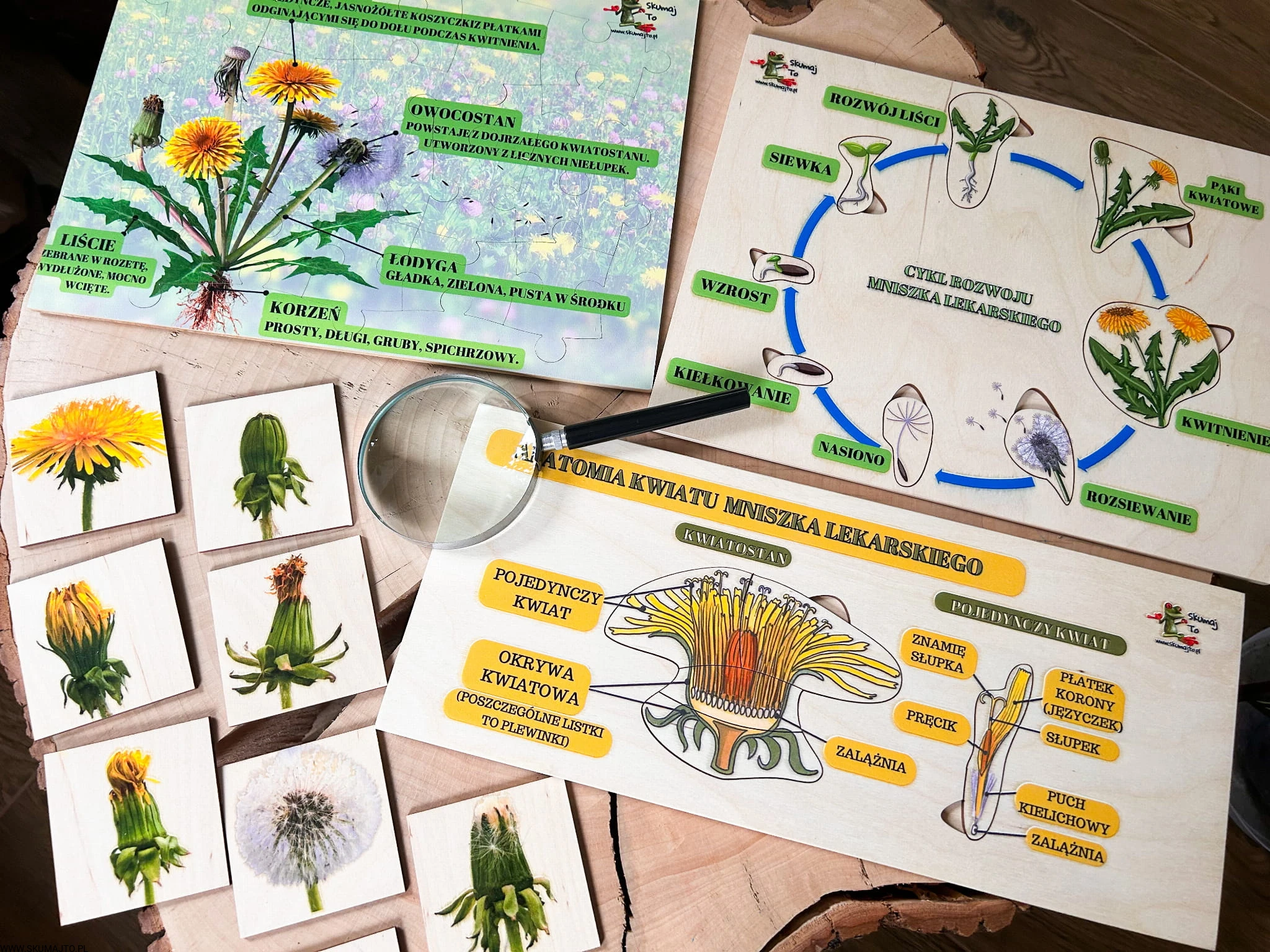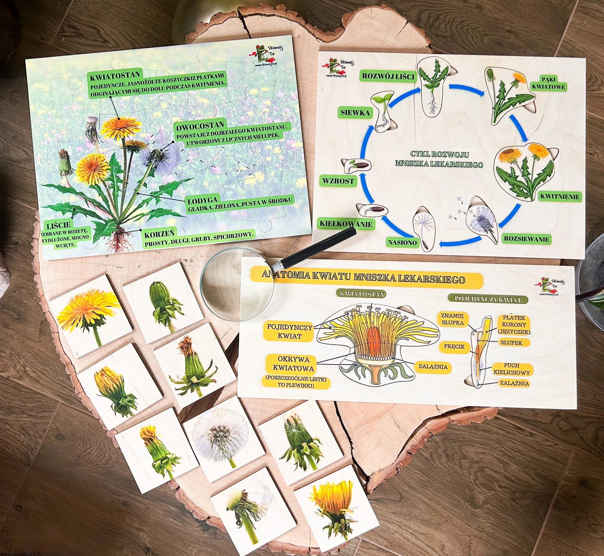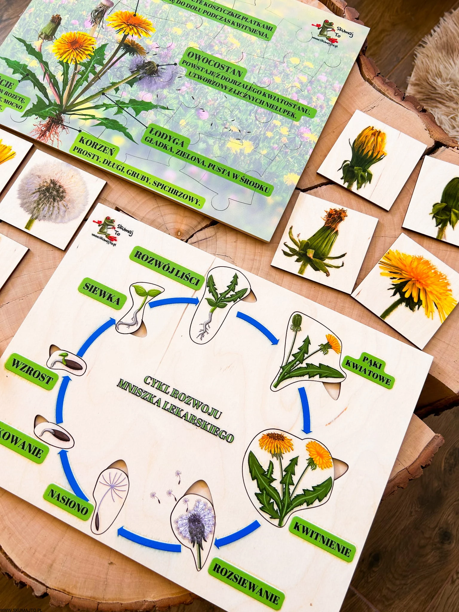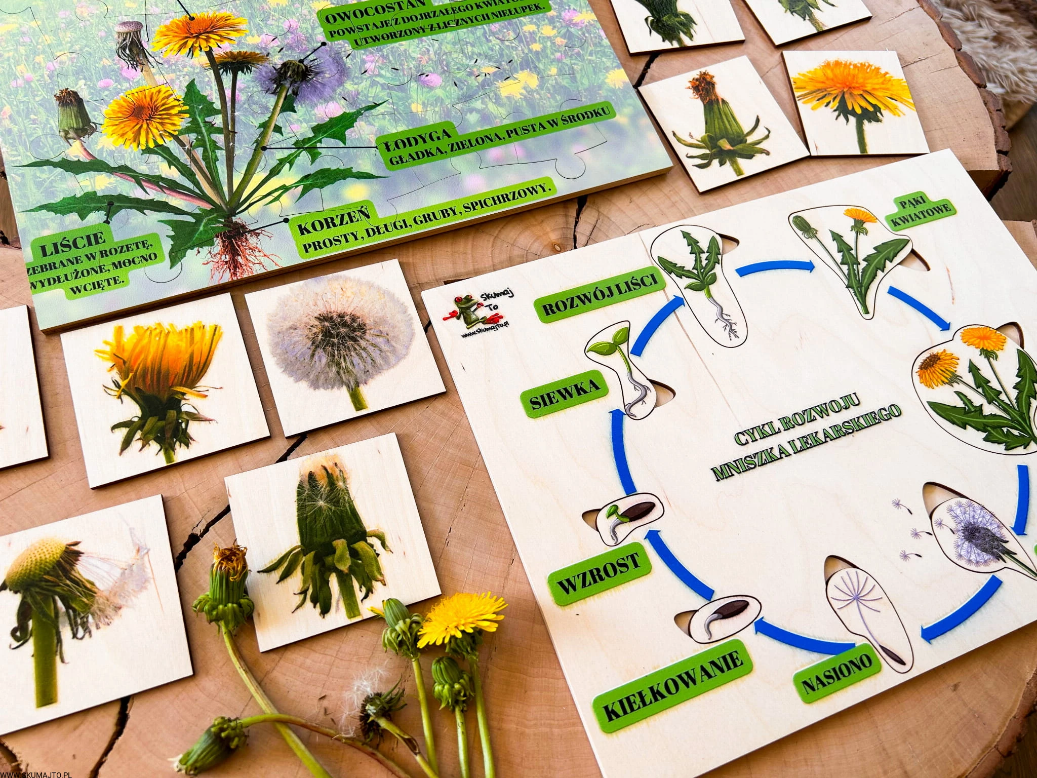 Zestaw z mniszkiem lekarskim drewniane układanki, cykl rozwojowy, budowa mniszka