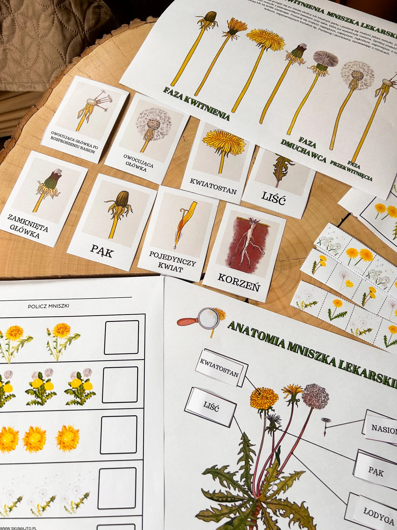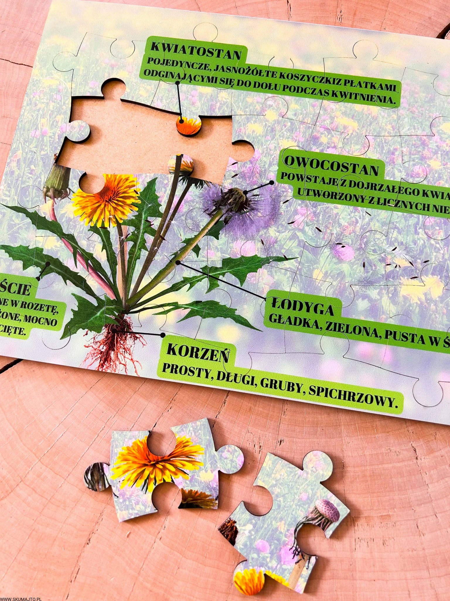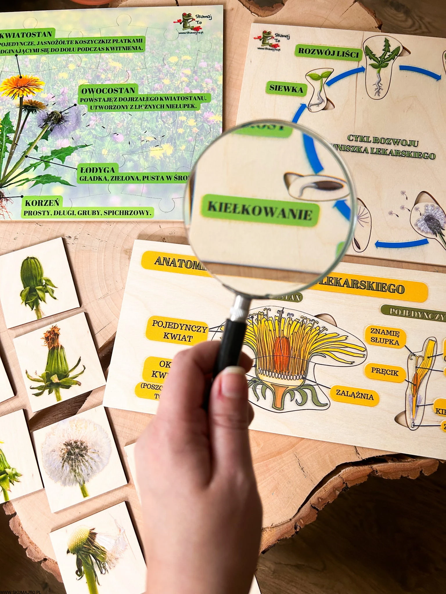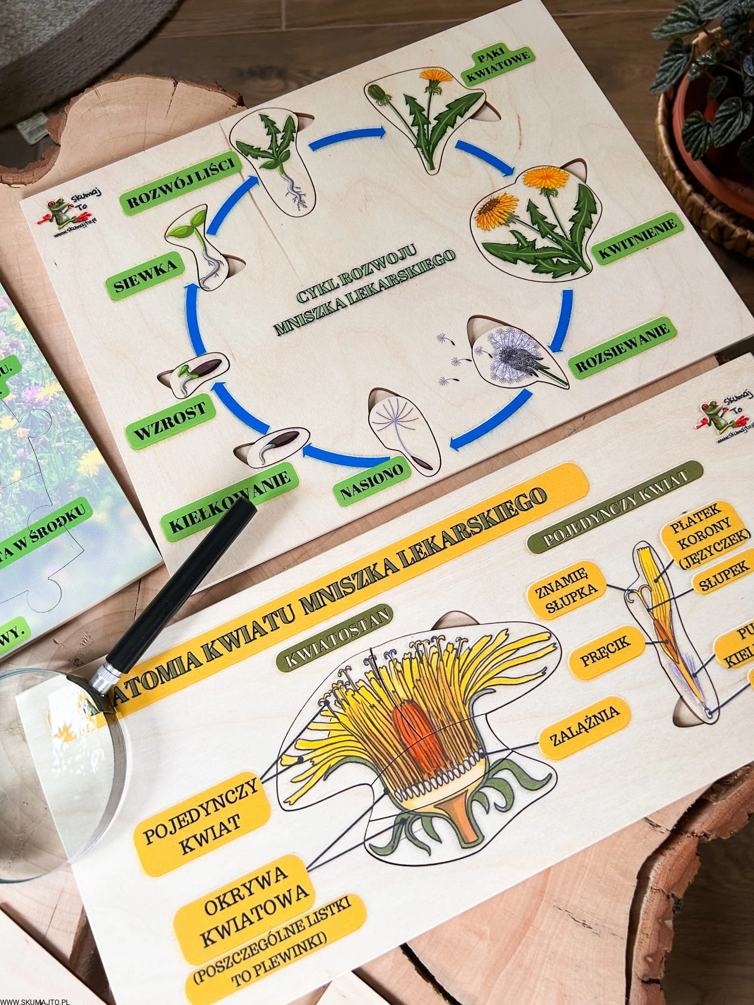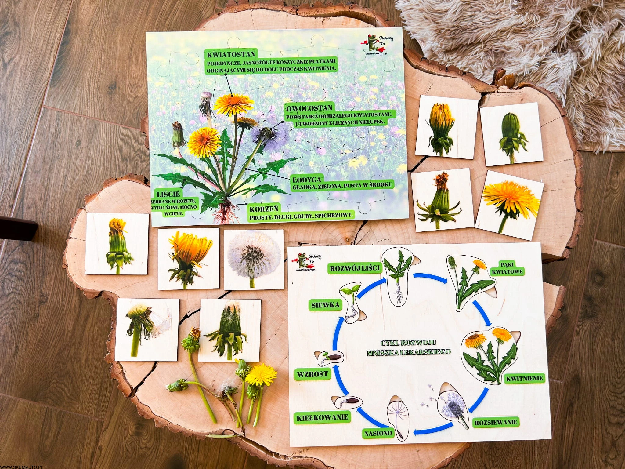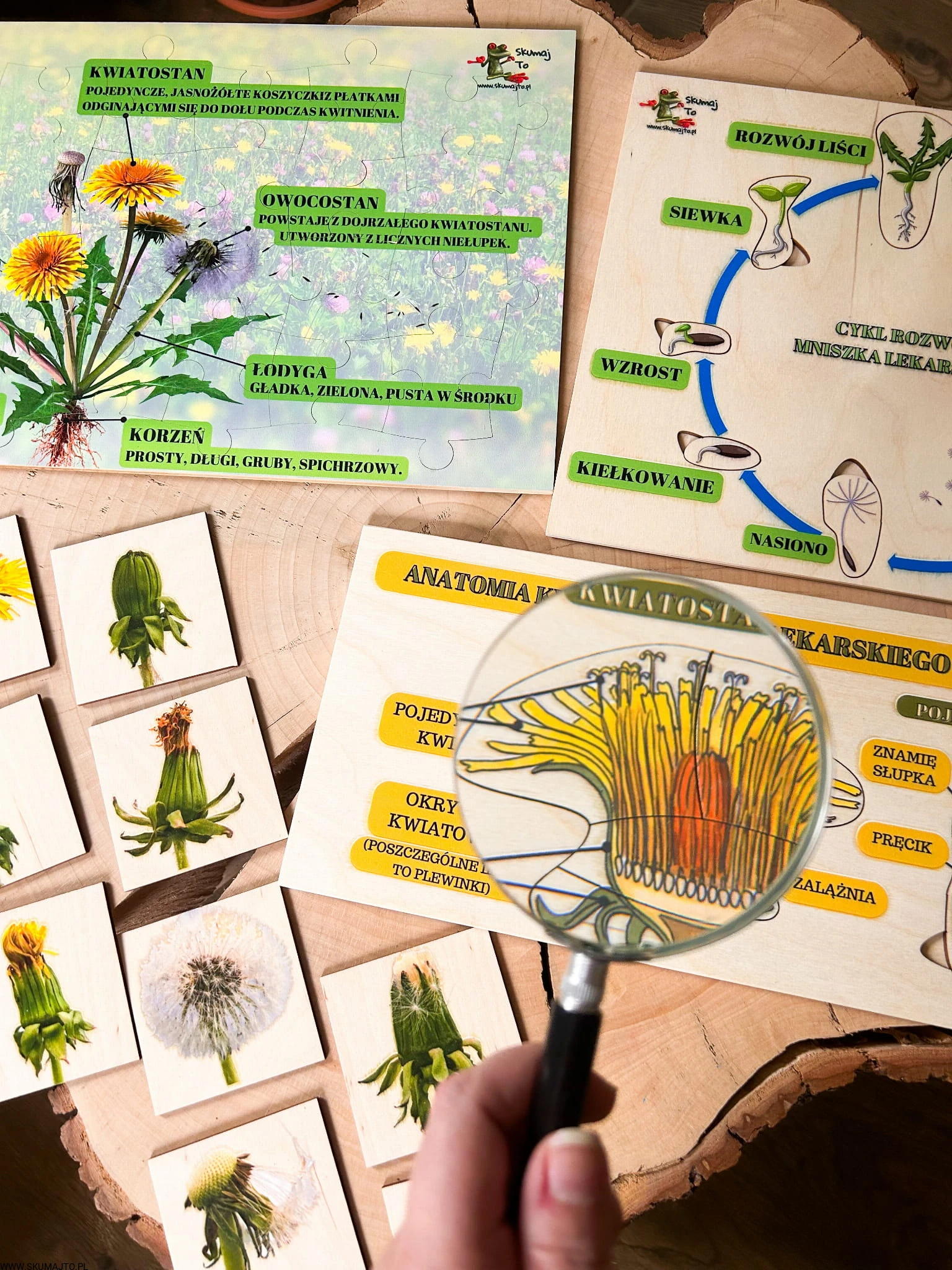 Zestaw z mniszkiem lekarskim drewniane układanki, cykl rozwojowy, budowa mniszka