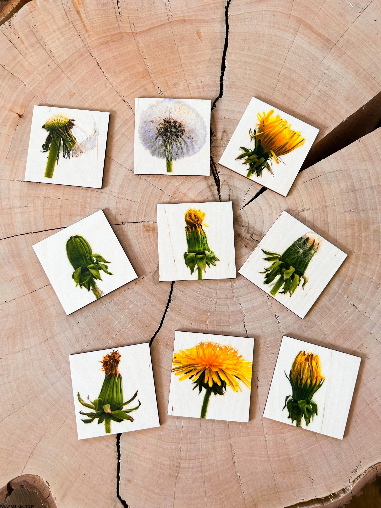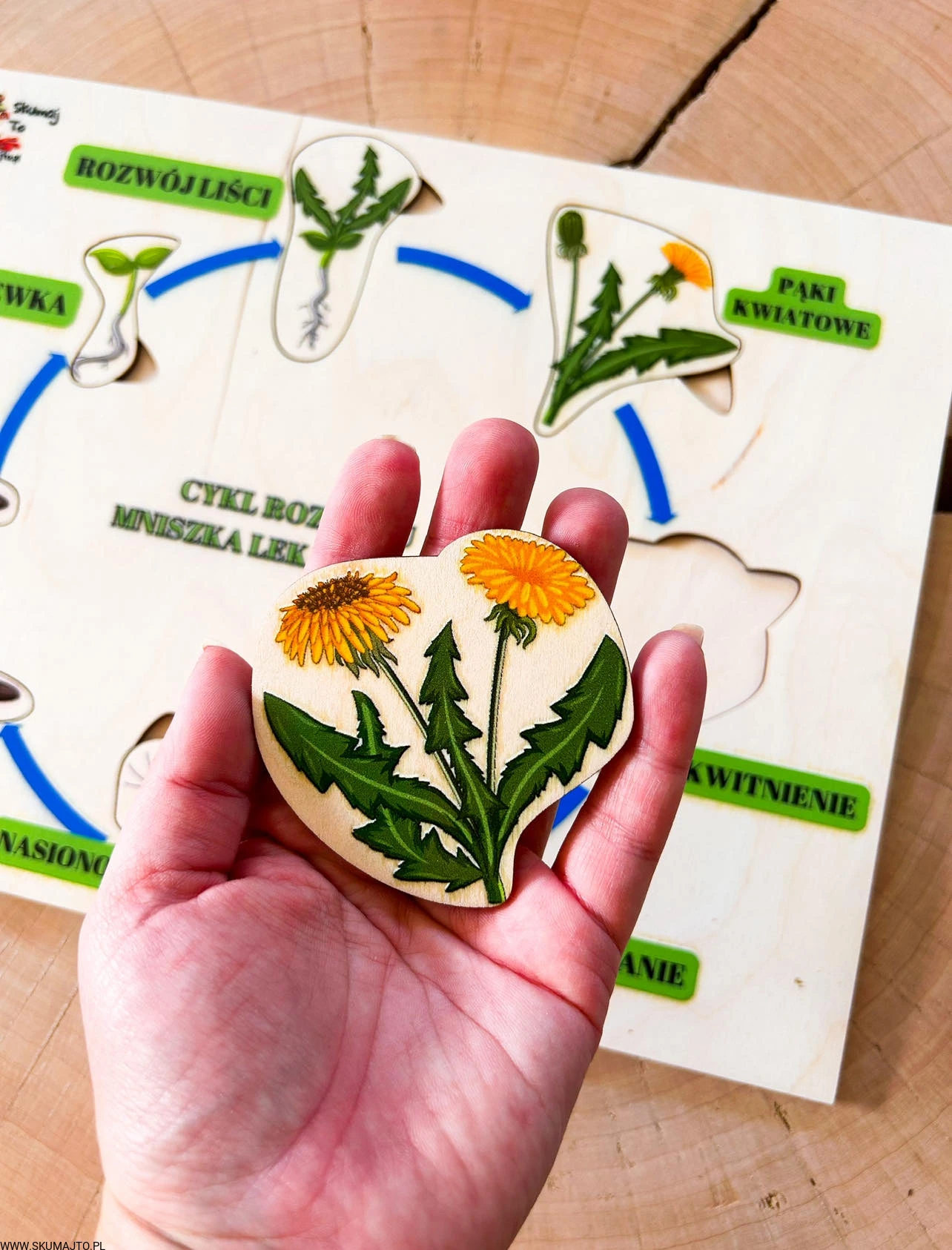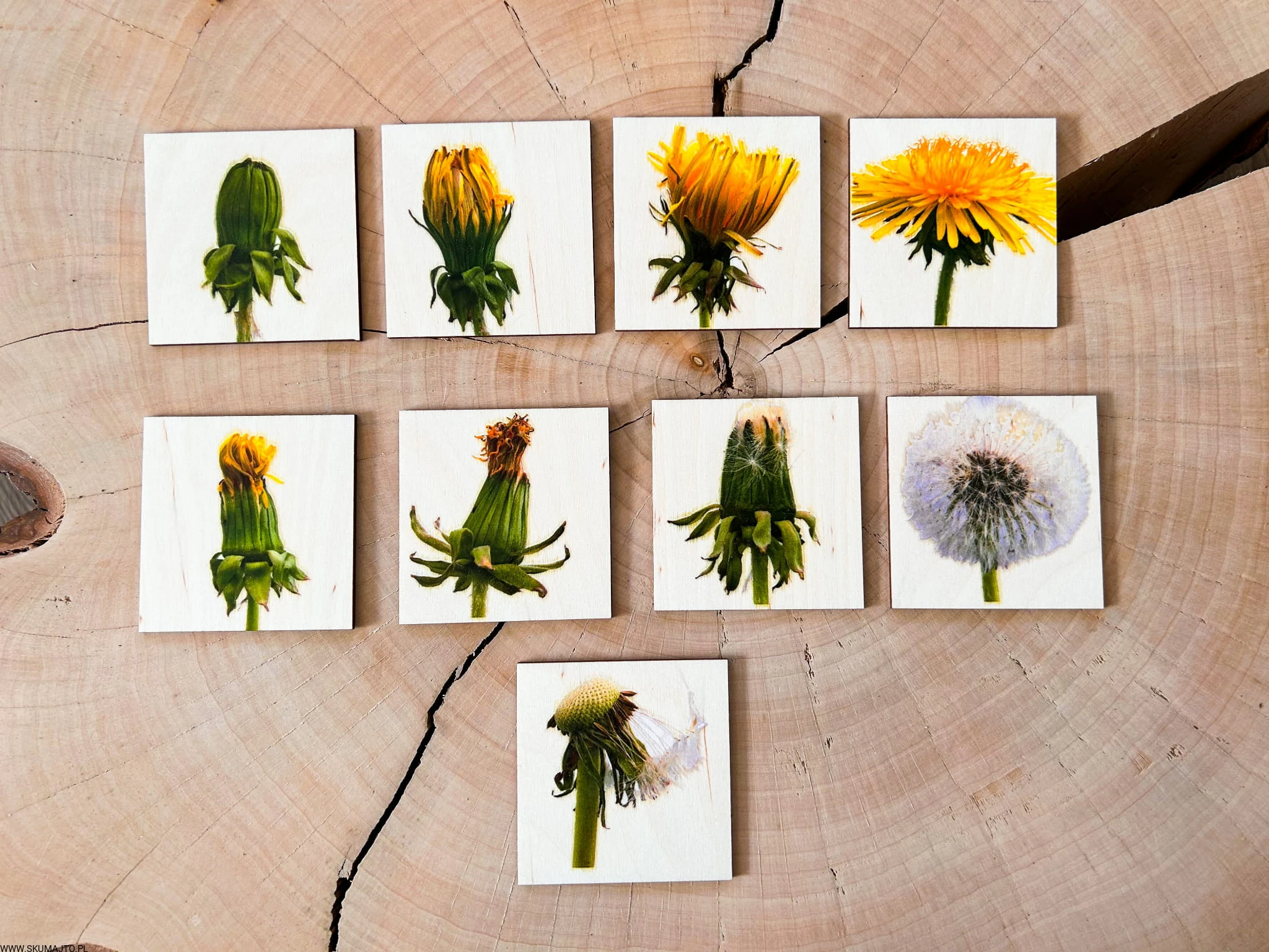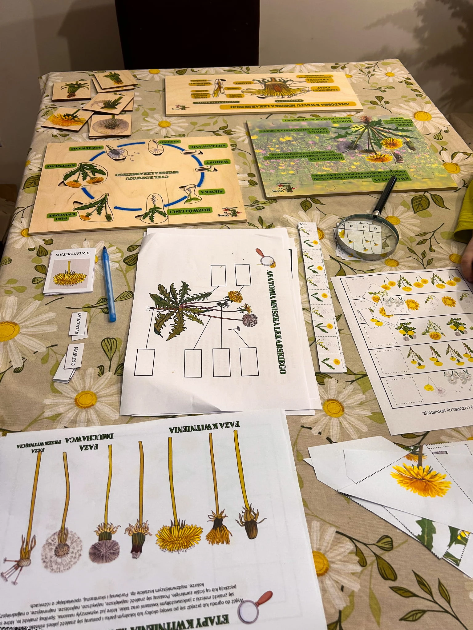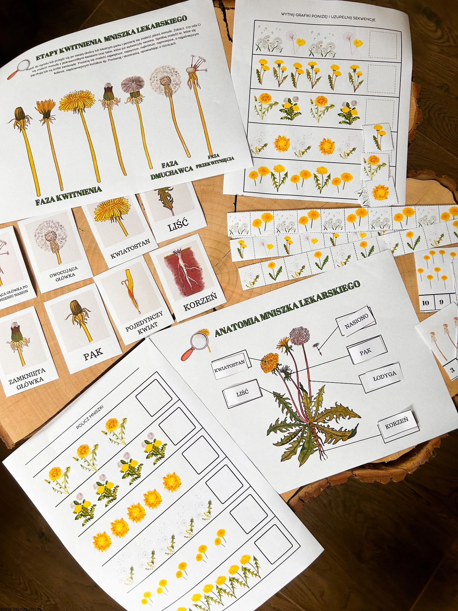 Zestaw z mniszkiem lekarskim drewniane układanki, cykl rozwojowy, budowa mniszka