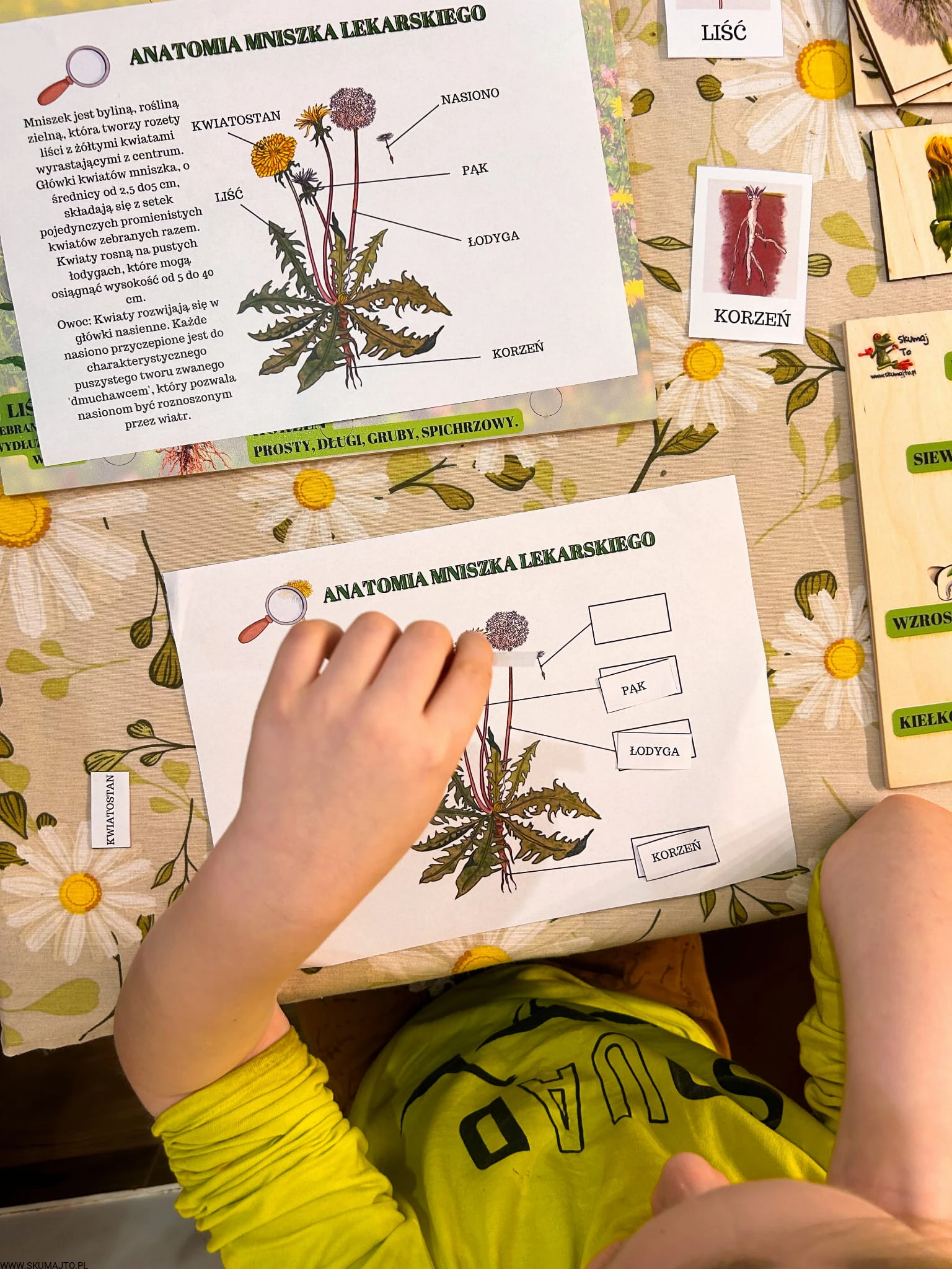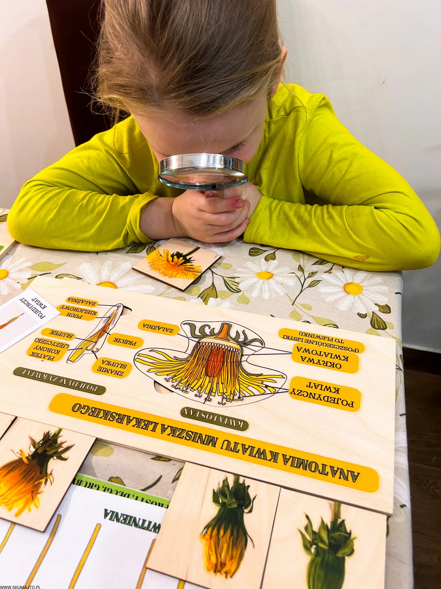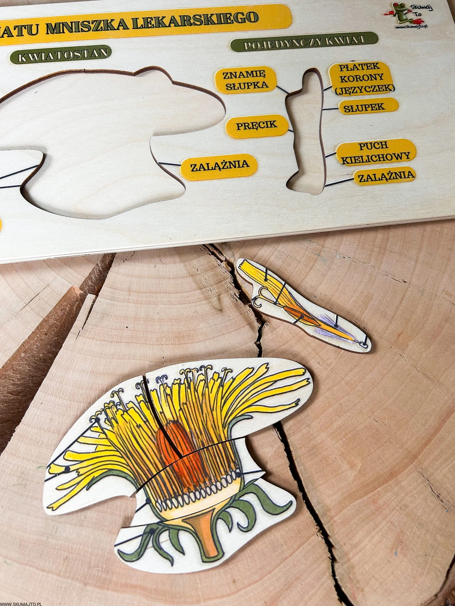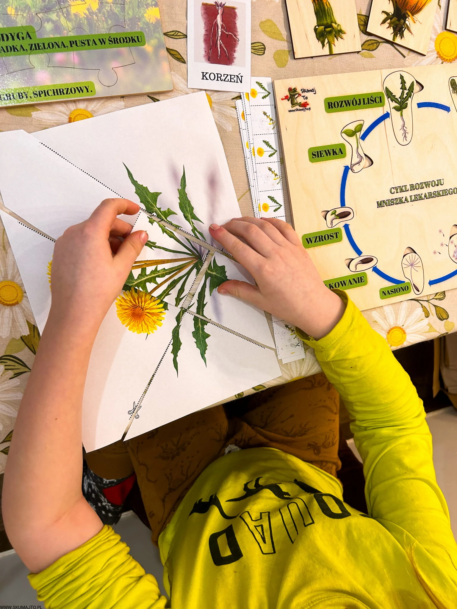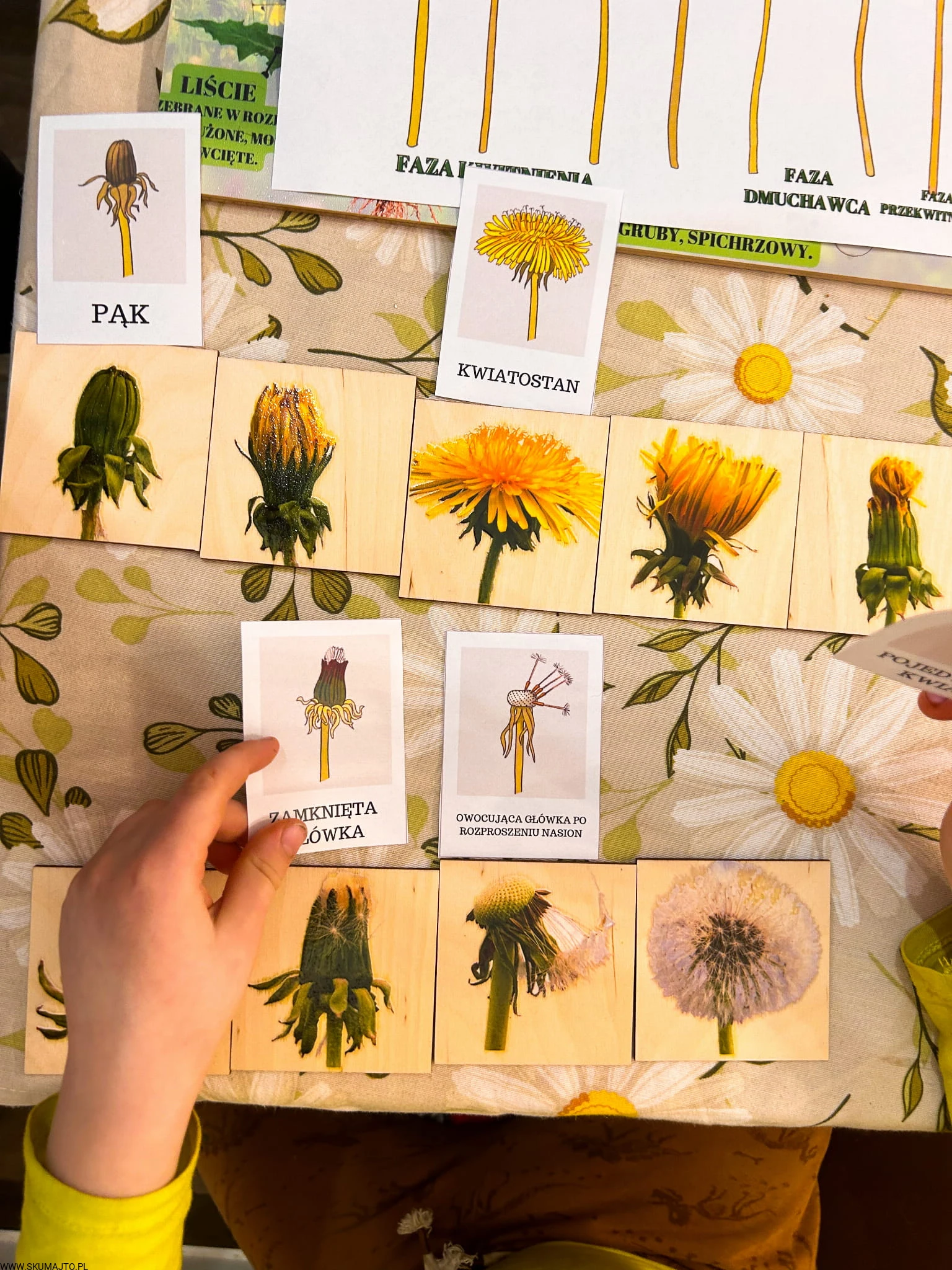 Zestaw z mniszkiem lekarskim drewniane układanki, cykl rozwojowy, budowa mniszka