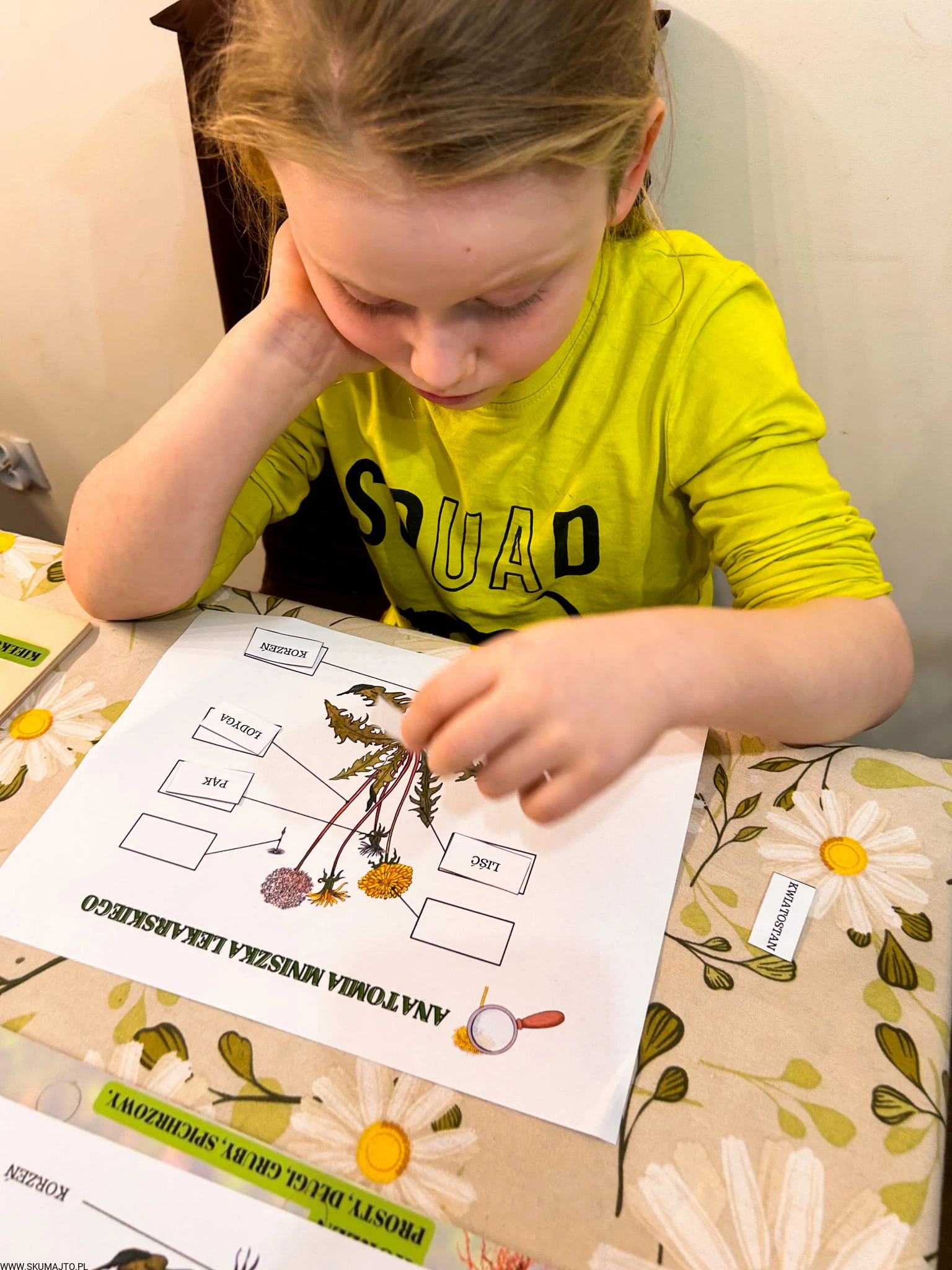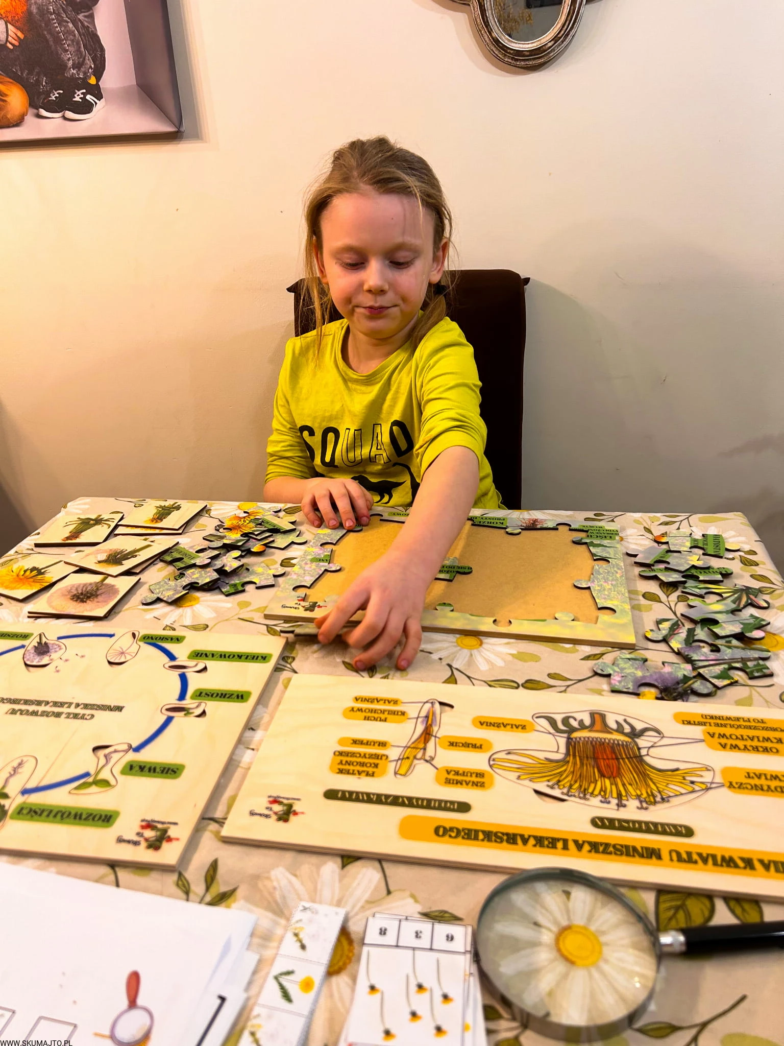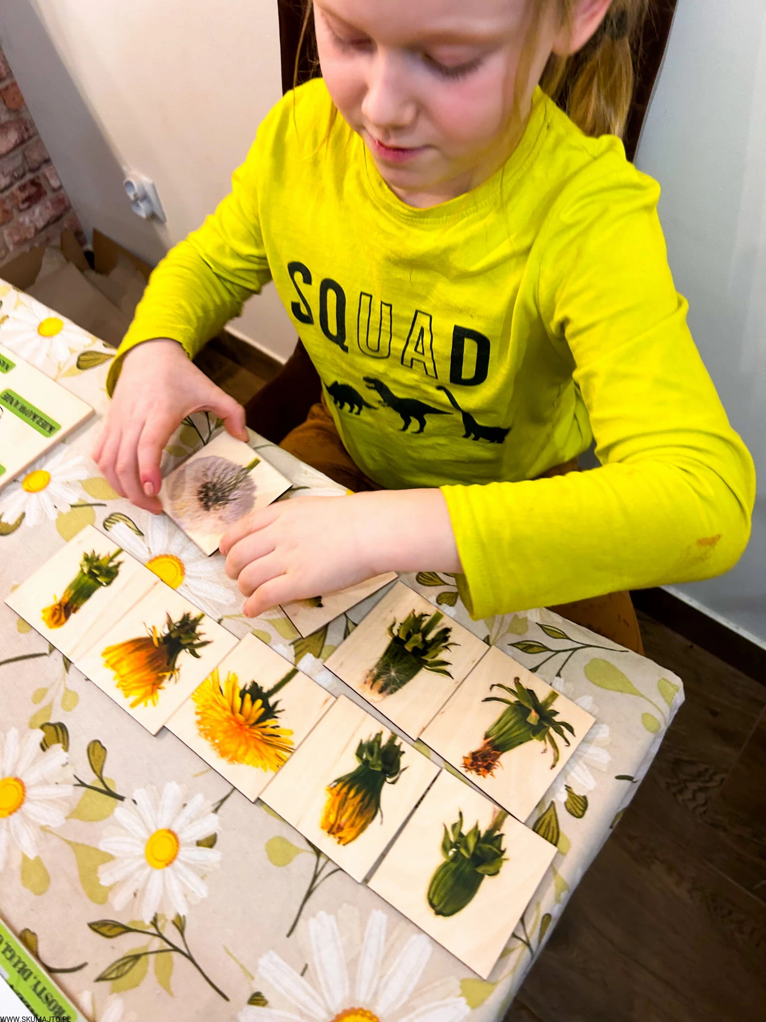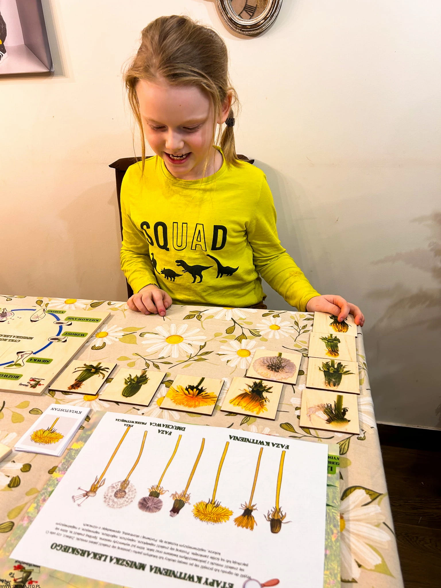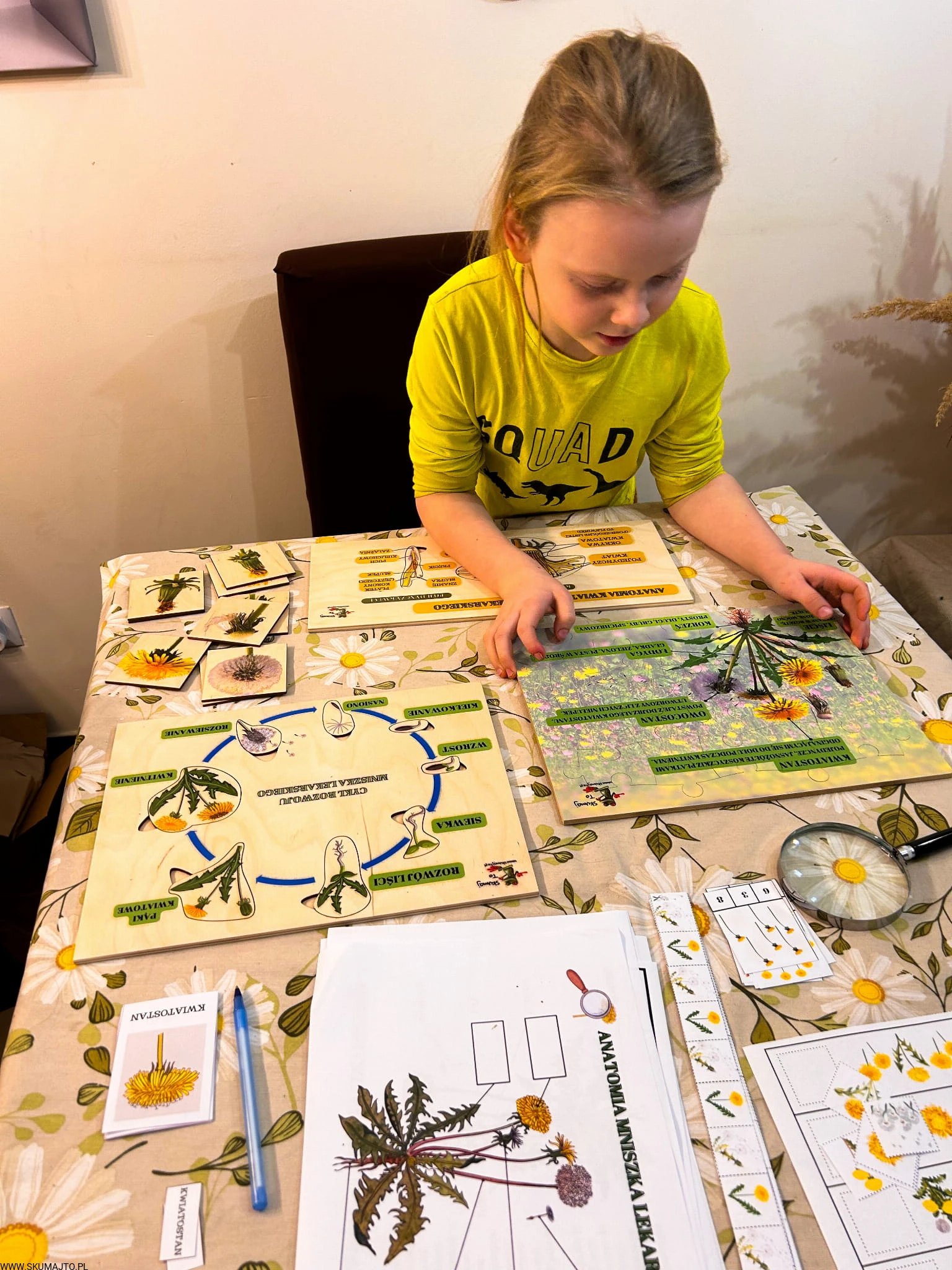 Zestaw z mniszkiem lekarskim drewniane układanki, cykl rozwojowy, budowa mniszka